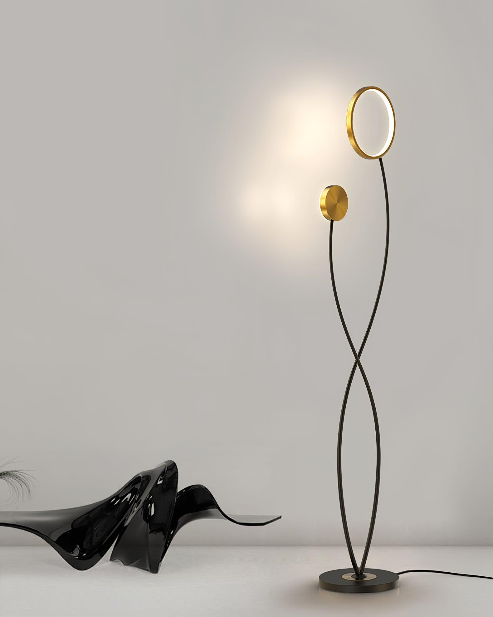 The Arrival Floor Lamp is a sculptural lighting piece created with delicate curves and organic lines. It features a sleek Aluminum outside with light diffused from the inside.