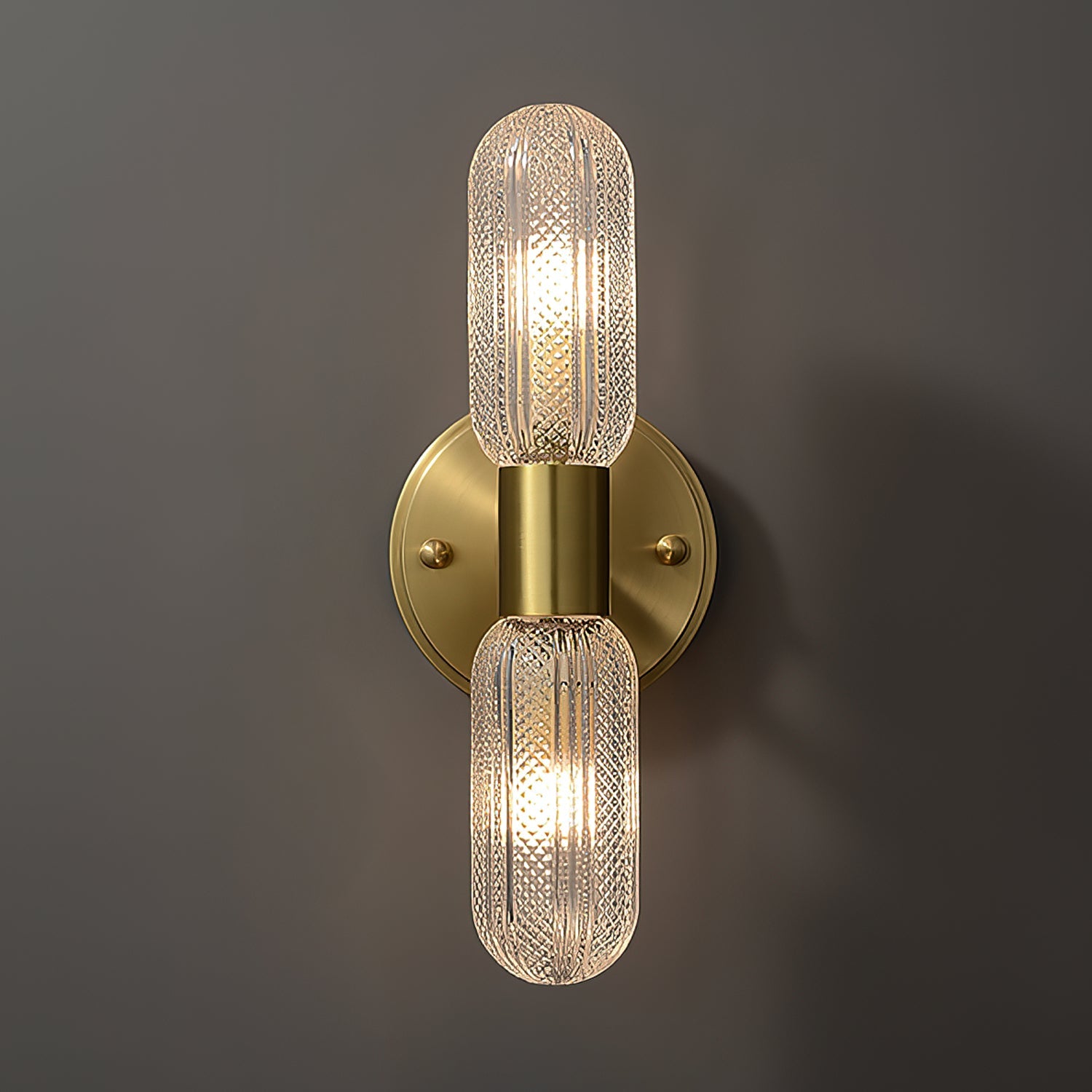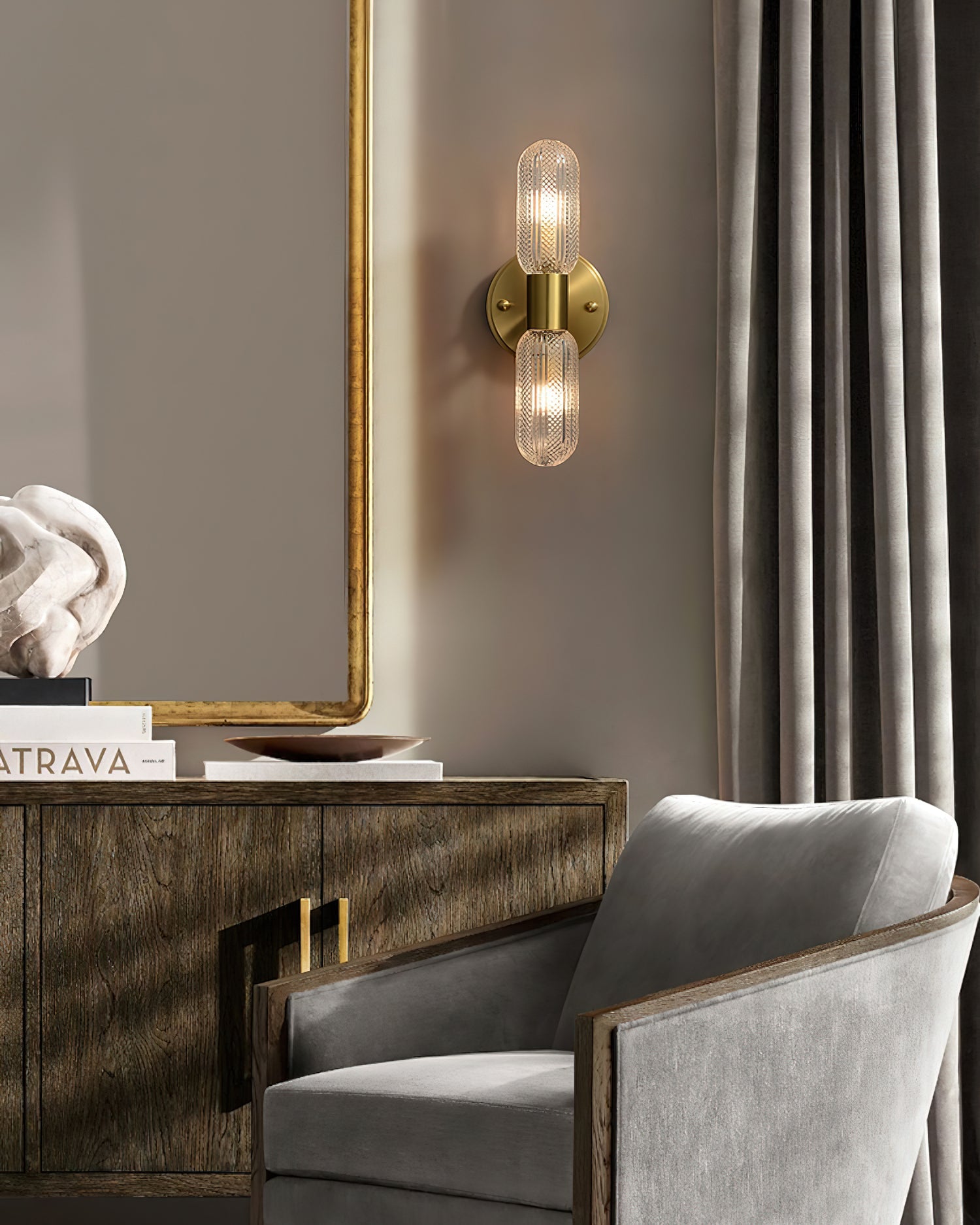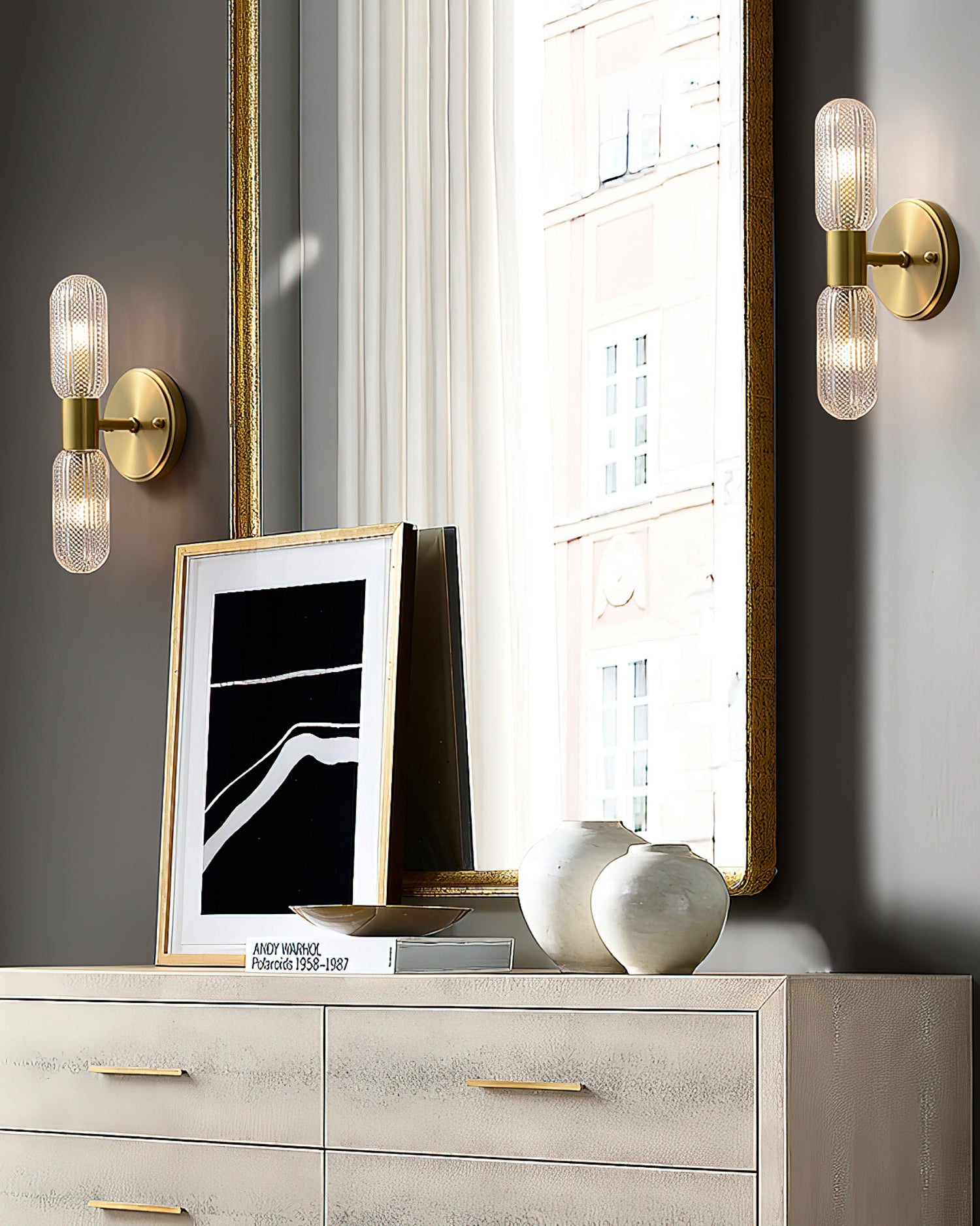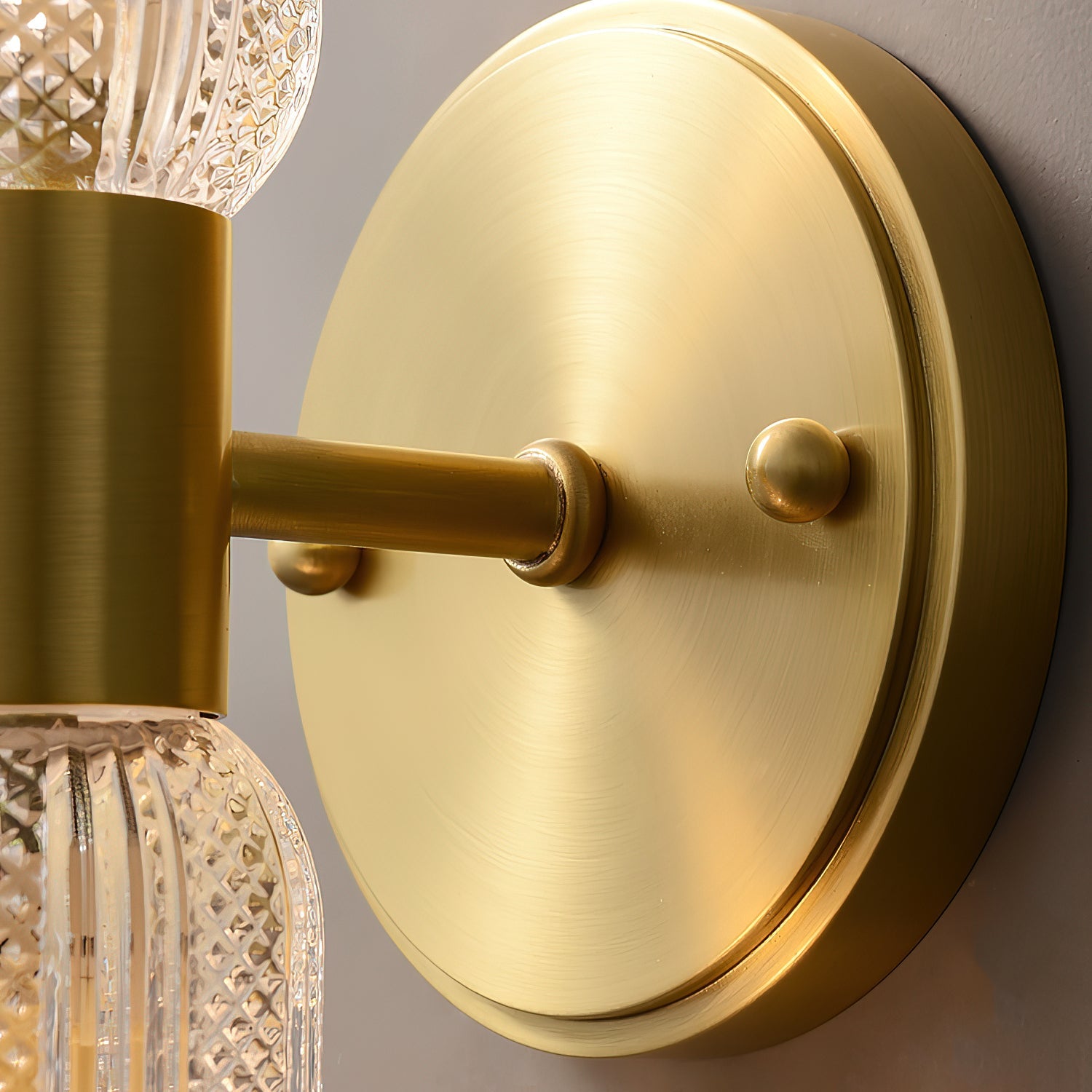 The Chiswick Wall Light adds radiance to modern interiors with its sculptural tubular design, sleek lines and brushed brass hardware with a gold finish. Featuring two lamp heads with clear glass diffusers, this light fixture provides elegant lighting, ideal for bathrooms, hallways, dining rooms or entryways. Its exquisite craftsmanship adds warmth and sophistication to your space.