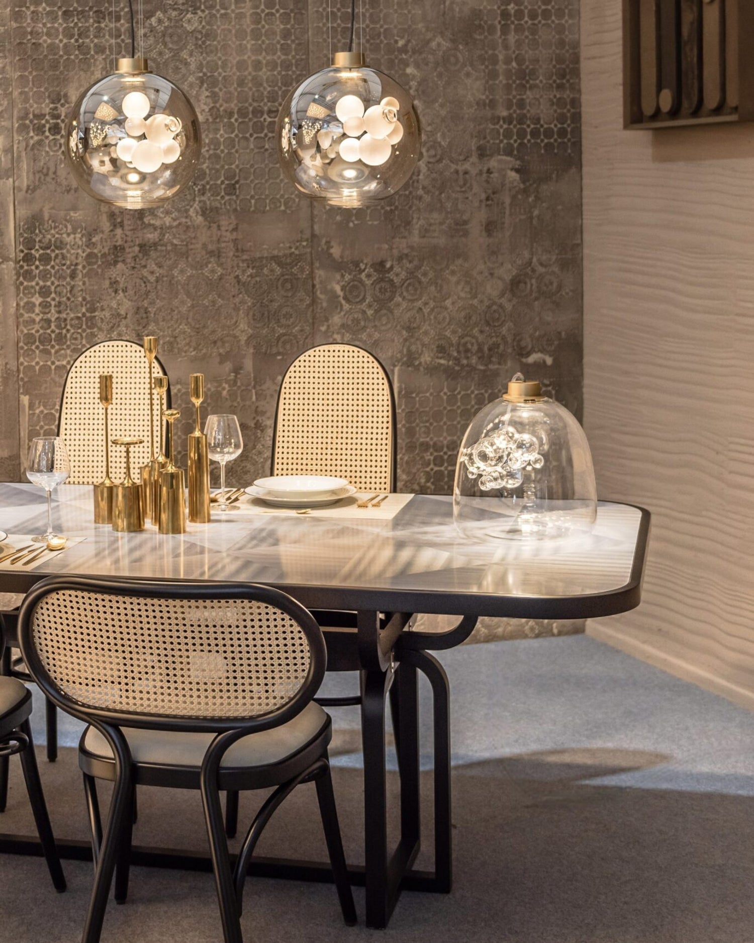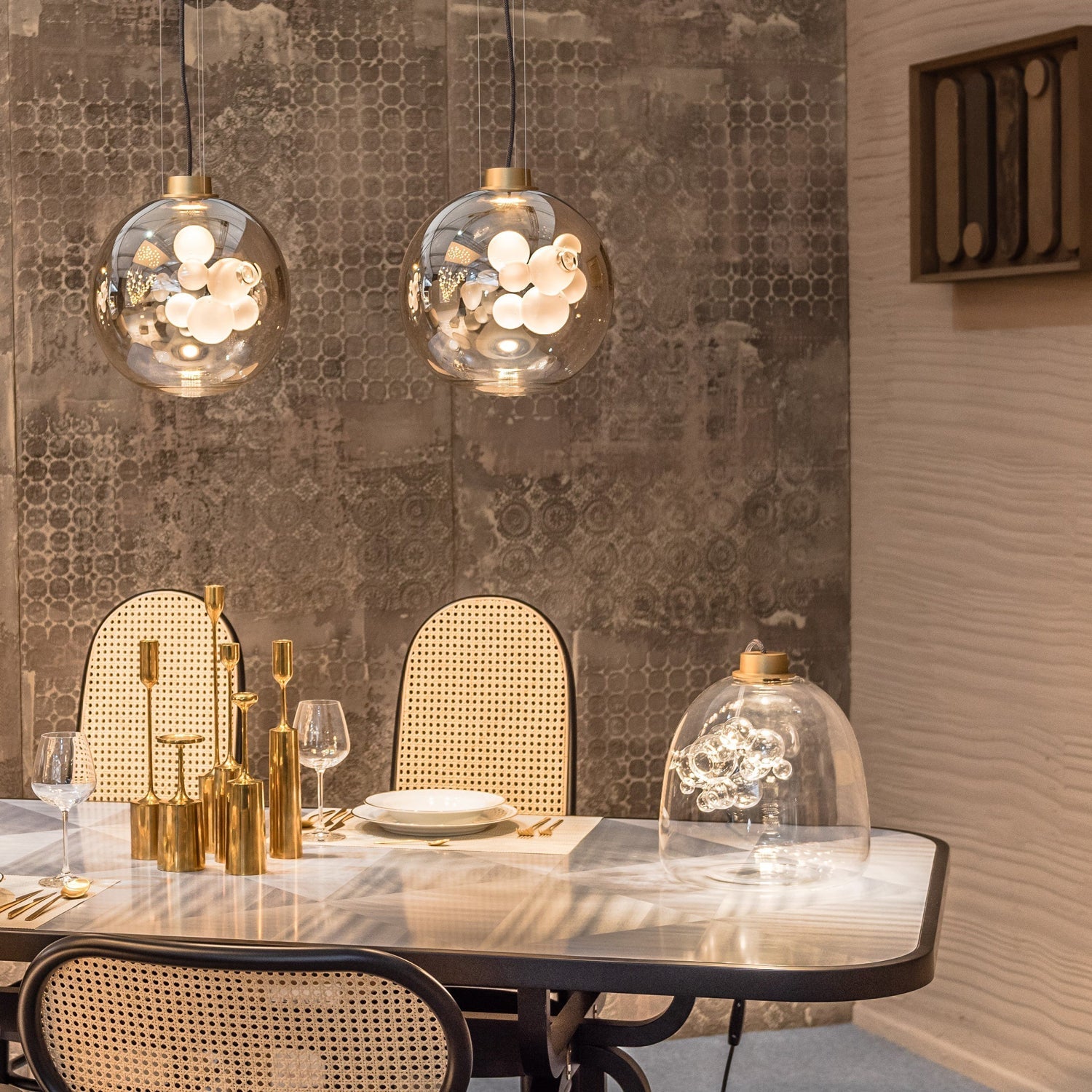 The Danya Table Lamp combines masterful craftsmanship with innovative design. Made from hand-blown metalized glass, it reveals a subtle satin-glass bubble sculpture only when illuminated, offering a captivating blend of form and light. Each lamp is individually handcrafted, ensuring a unique piece that brings both artistry and refined ambiance to any space.