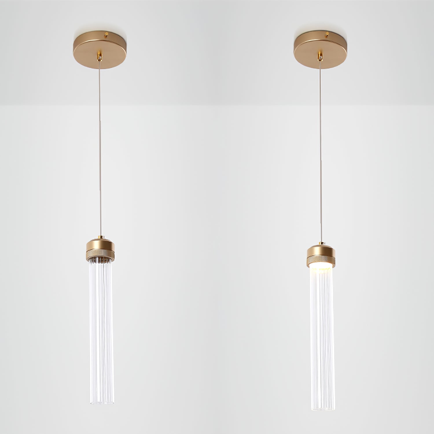 Soft warm hues to accentuate the modern home, the Fluted Tube Pendant Light is a Modern Hanging Lamp that comes in a sleek long glass design with a gold color top. Best placed as a bedside lamp or used in a row for your dining areas.