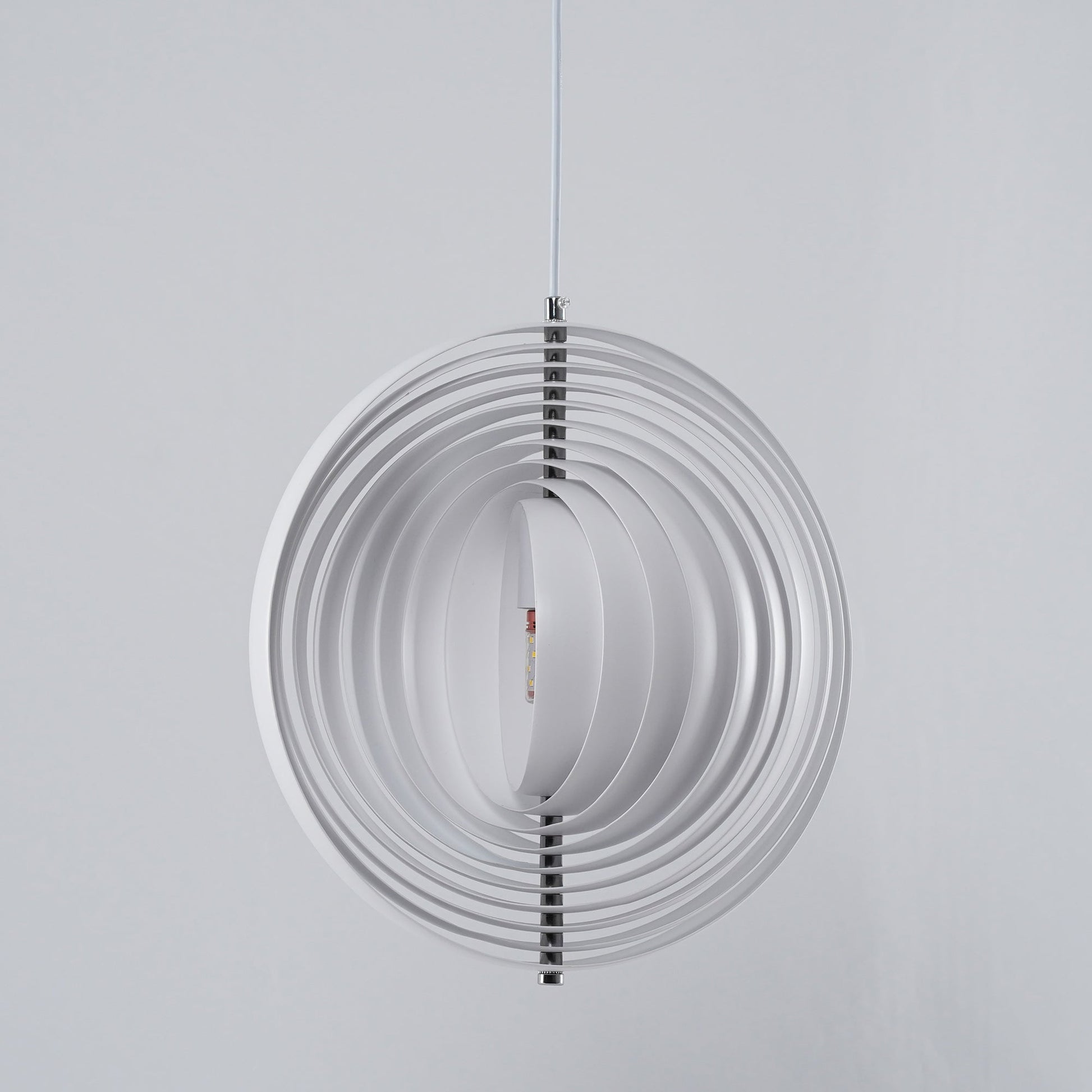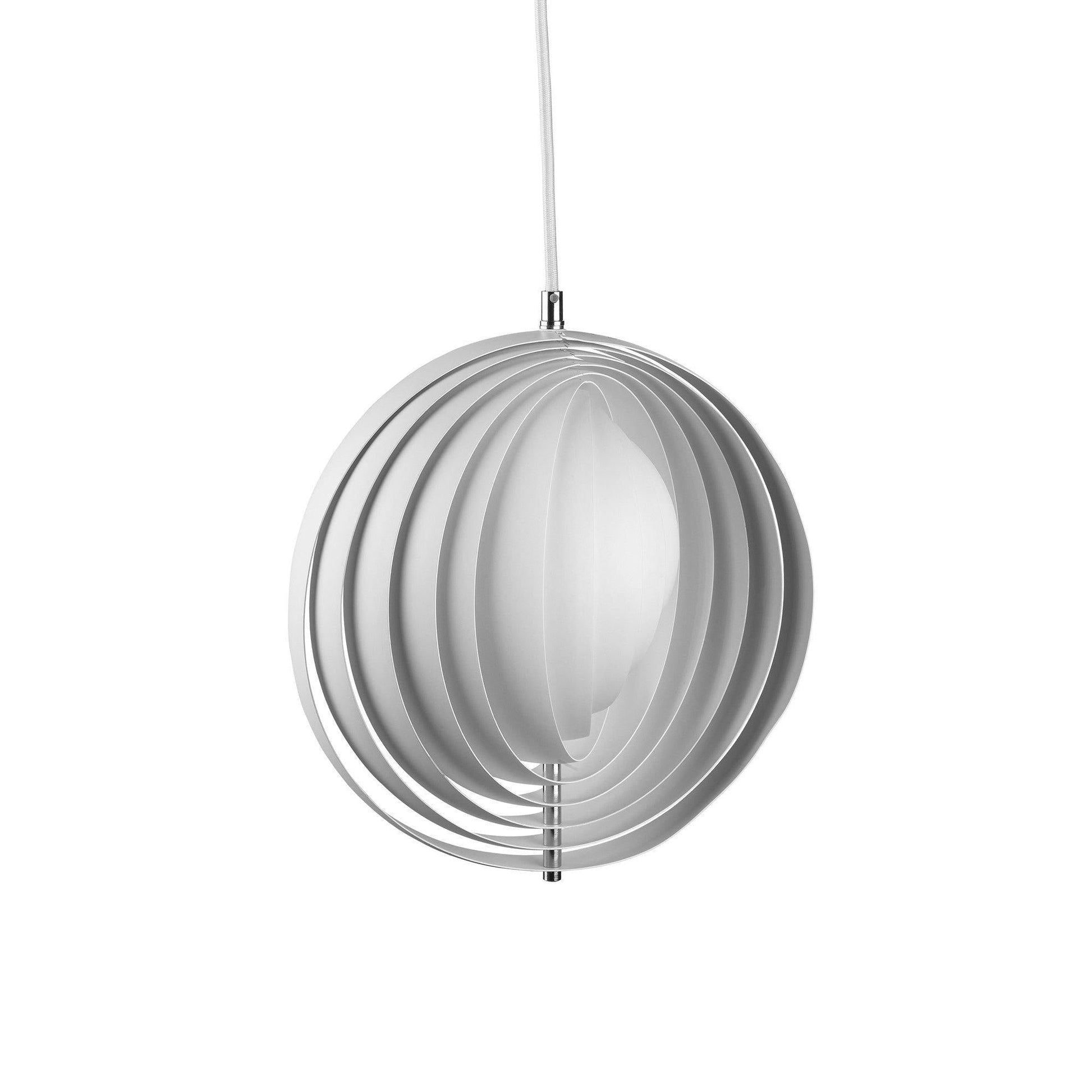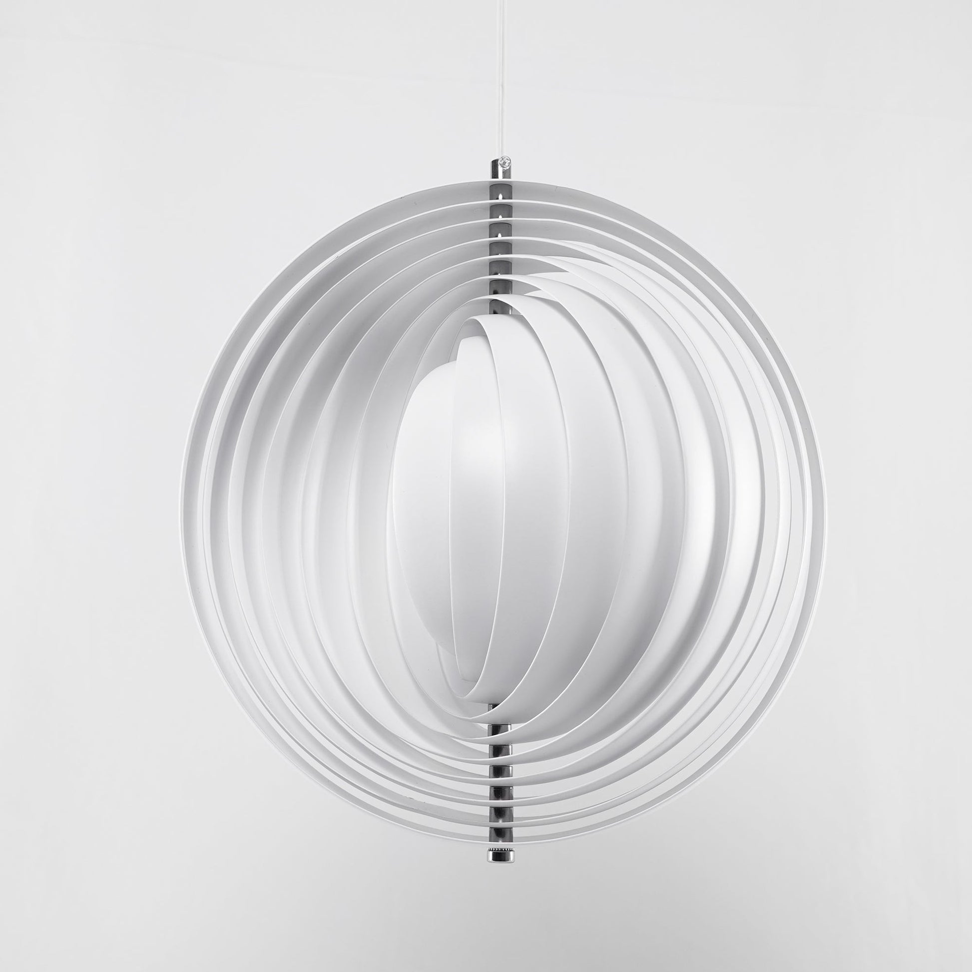 Designed in 1960, the Moon represents one of Verner Panton’s earliest designs in lighting. The iconic pendant is characterized by its fan-like design with ten ring-shaped aluminum lamellae perfectly positioned to provide a soft, ambient and glare-free light. The blades reflect and filters the light and the pendant changes its appearance depending on the angle at which you view it.
