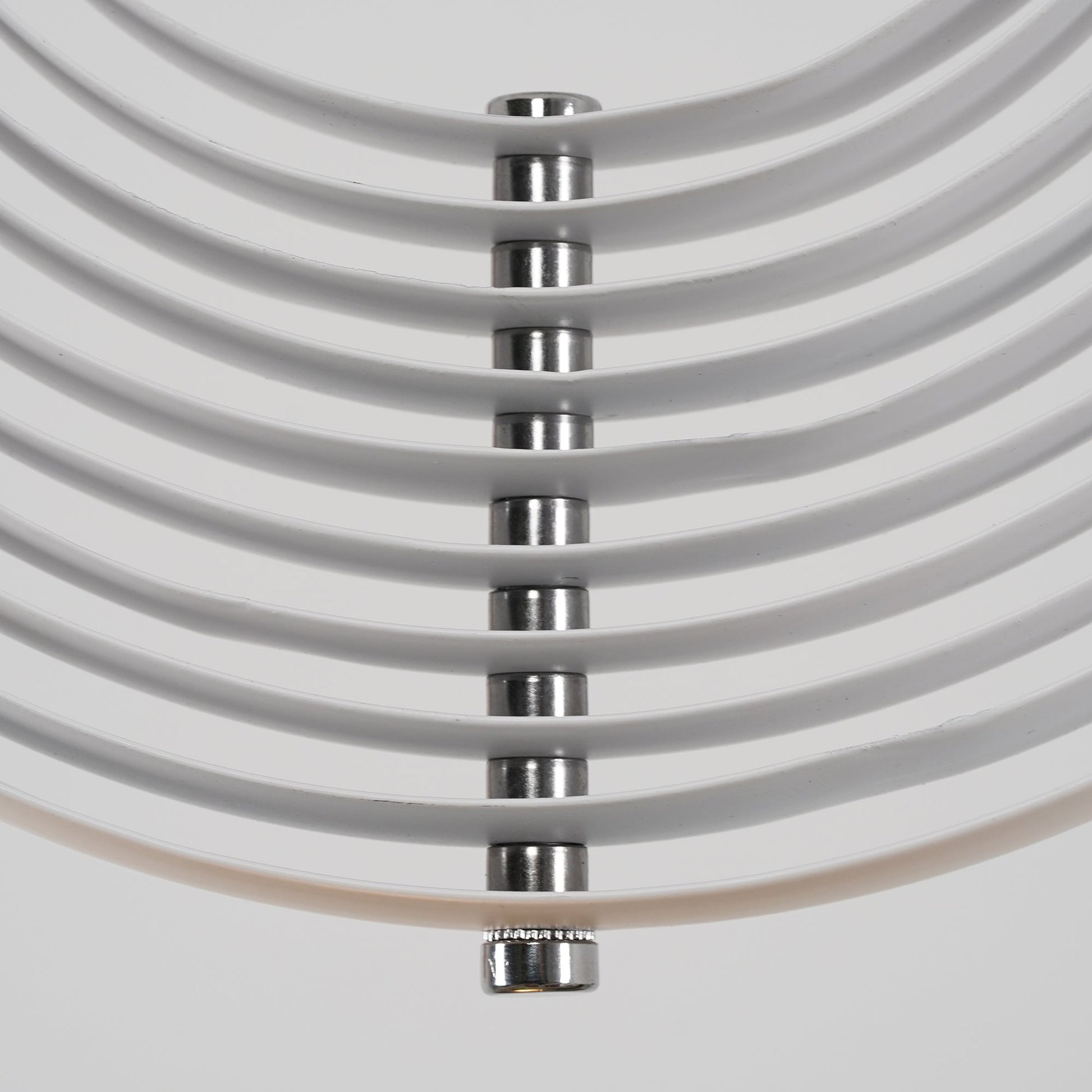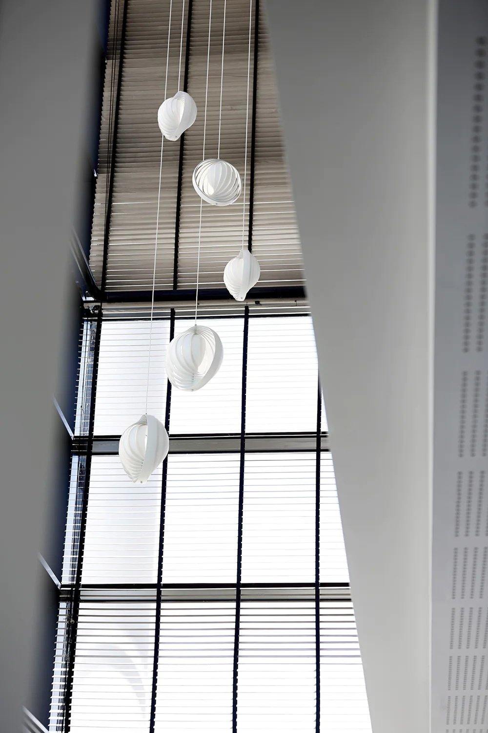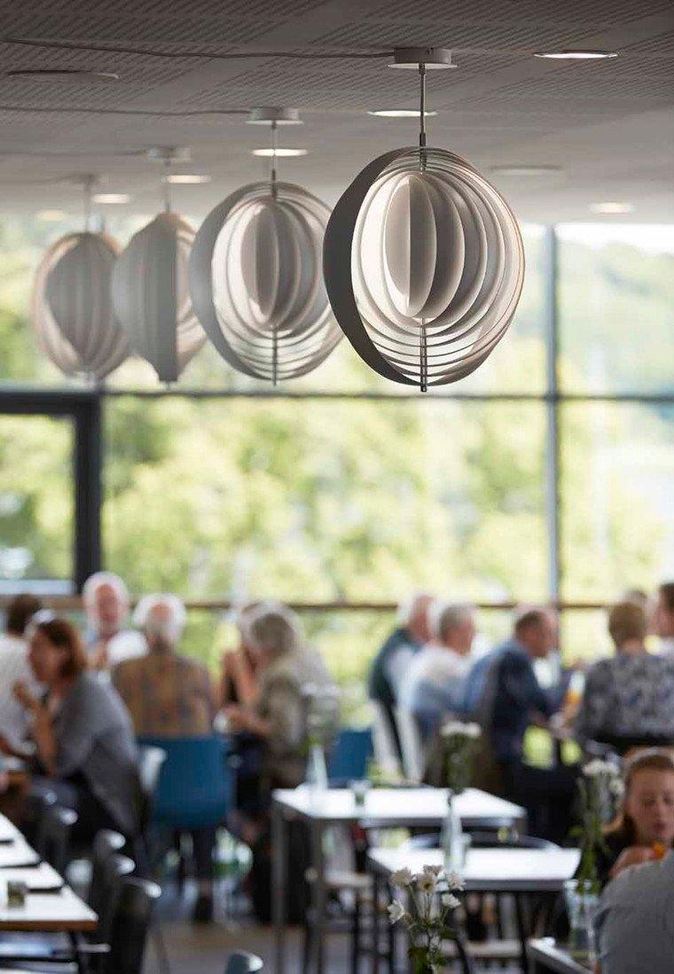 Designed in 1960, the Moon represents one of Verner Panton’s earliest designs in lighting. The iconic pendant is characterized by its fan-like design with ten ring-shaped aluminum lamellae perfectly positioned to provide a soft, ambient and glare-free light. The blades reflect and filters the light and the pendant changes its appearance depending on the angle at which you view it.
