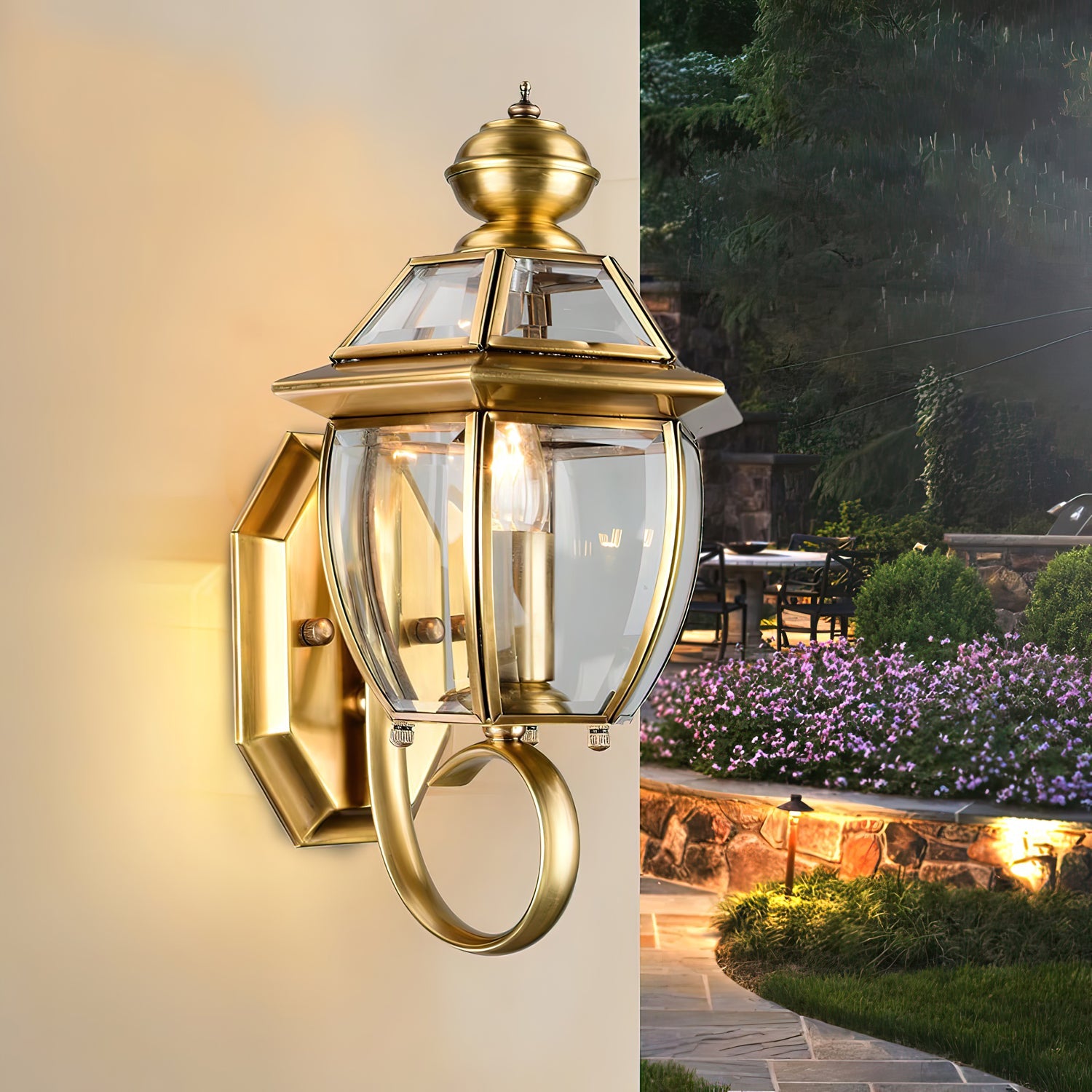 The Antunes Wall Light brings European elegance to your outdoor spaces with its classic brass and glass construction. Designed to enhance gardens and patios, this lantern wall sconce offers a timeless aesthetic that combines charm and sophistication. Its refined style not only illuminates but also elevates the ambiance, making it an expert choice for those seeking to enrich their outdoor decor with enduring beauty.