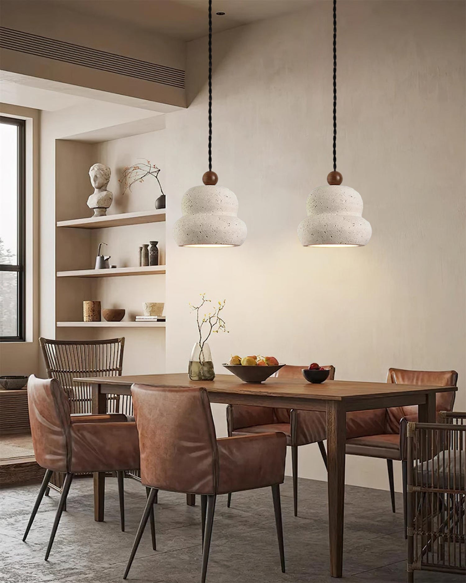 The Anzu Pendant Lamp showcases a sculptural design inspired by traditional Chinese gourds, expertly carved from natural travertine stone. Its softly rounded, stacked form introduces a warm, organic element to interiors, while the stone’s porous texture adds an earthy, tactile dimension. Emitting a gentle ambient light, it enhances minimalist, wabi-sabi, and Japandi aesthetics with a cozy, grounded atmosphere. Suspended by a twisted black cord and finished with a wooden top detail, this lamp harmonizes natural materials and refined craftsmanship for a timeless lighting feature.