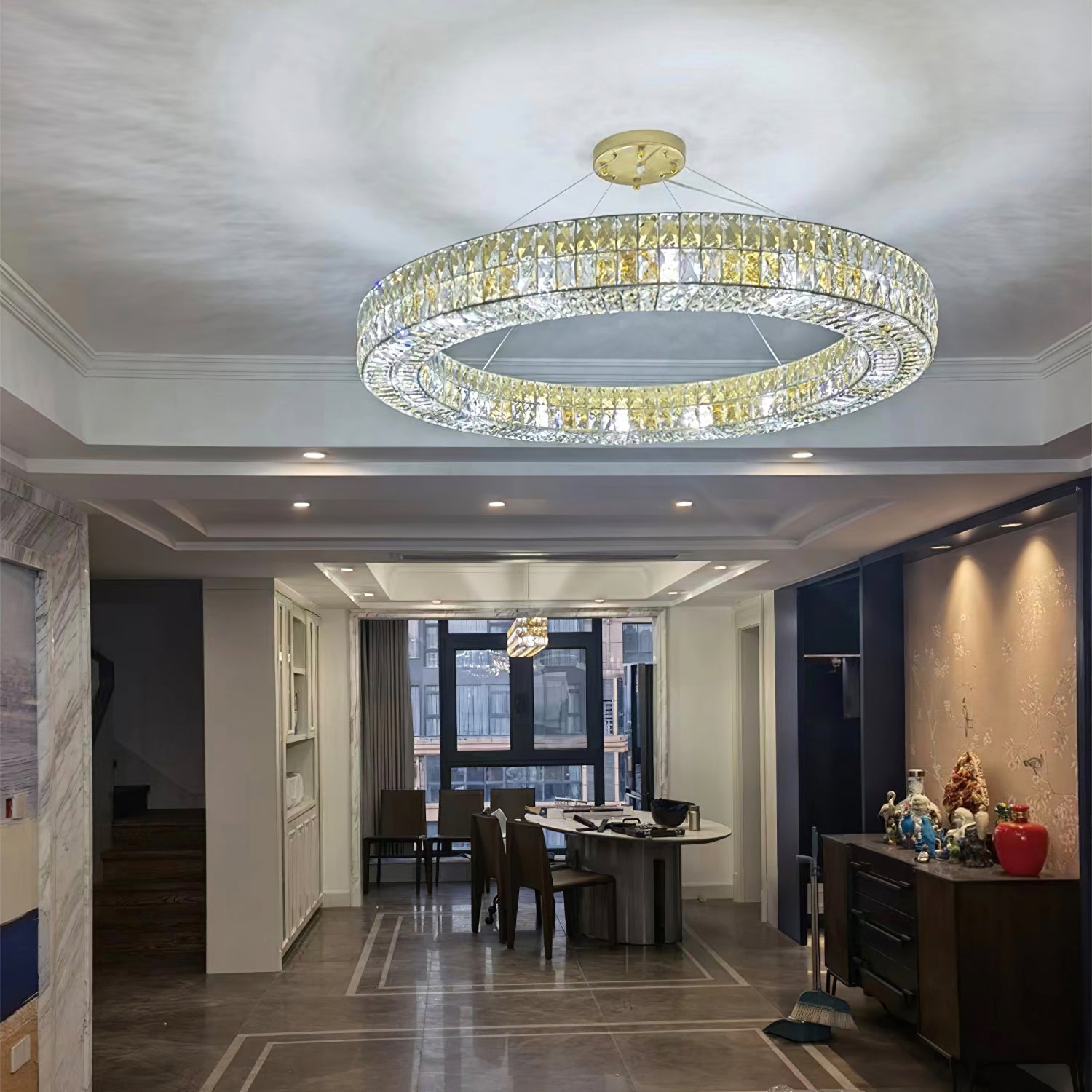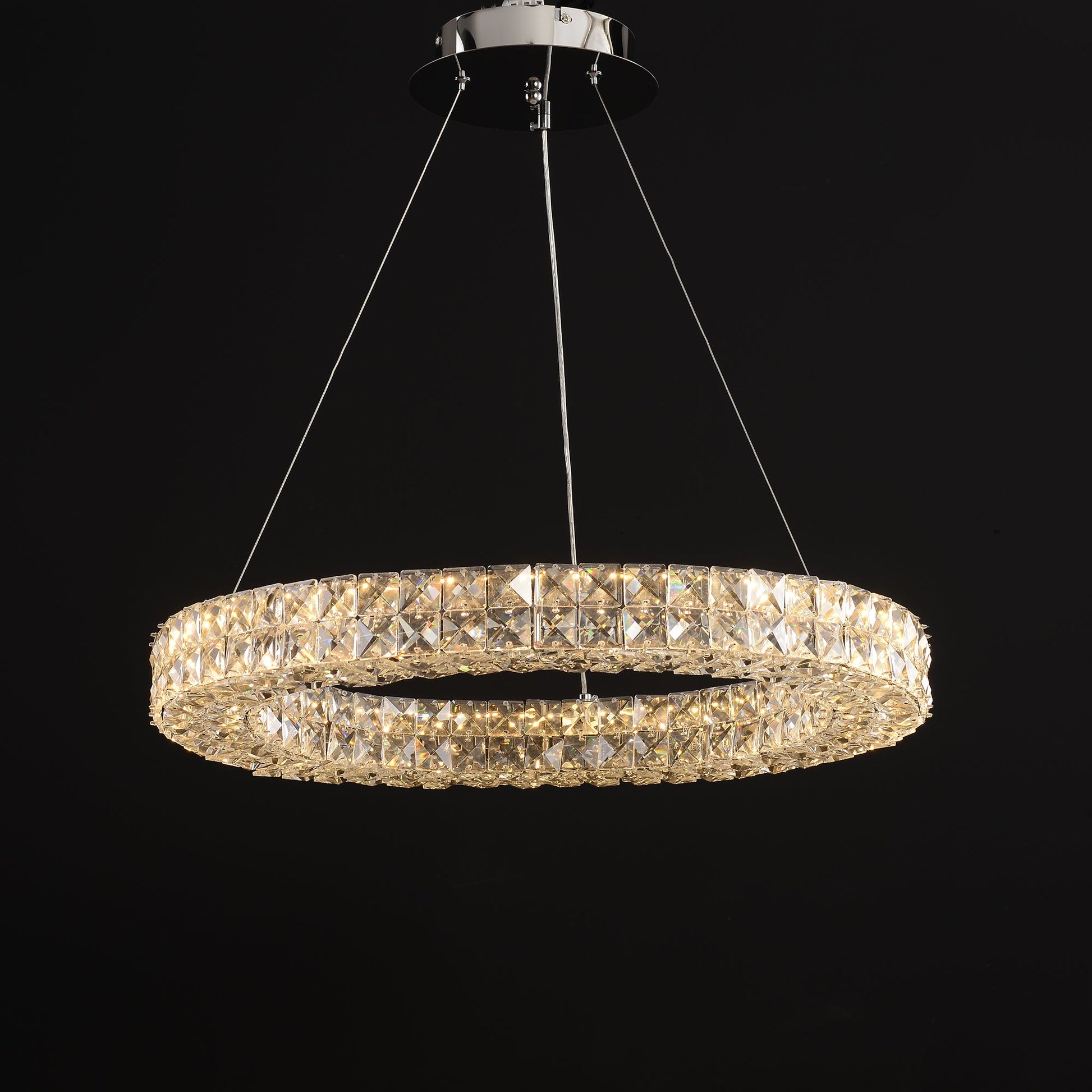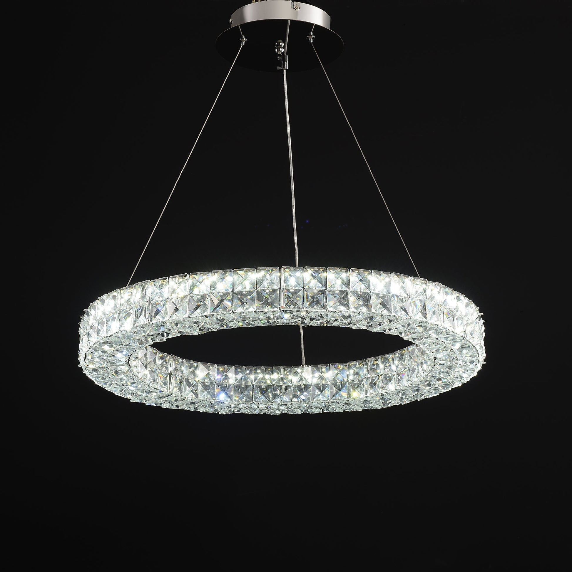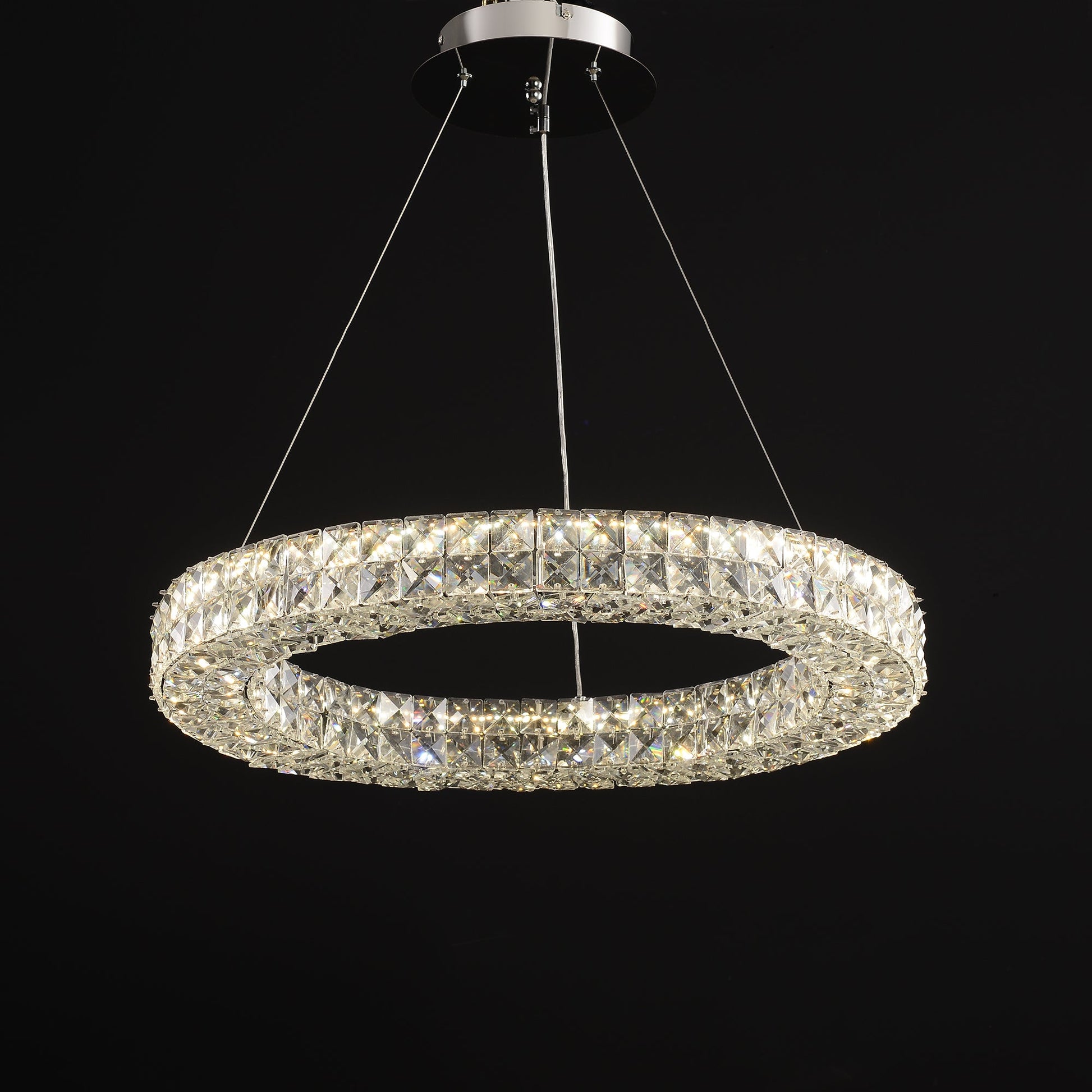 Echoing the luxe design of 1960s Austrian lighting, our fixture's faceted crystals are hand-set within a matte iron frame and suspended from slender wires, creating a sparkling focal point overhead.