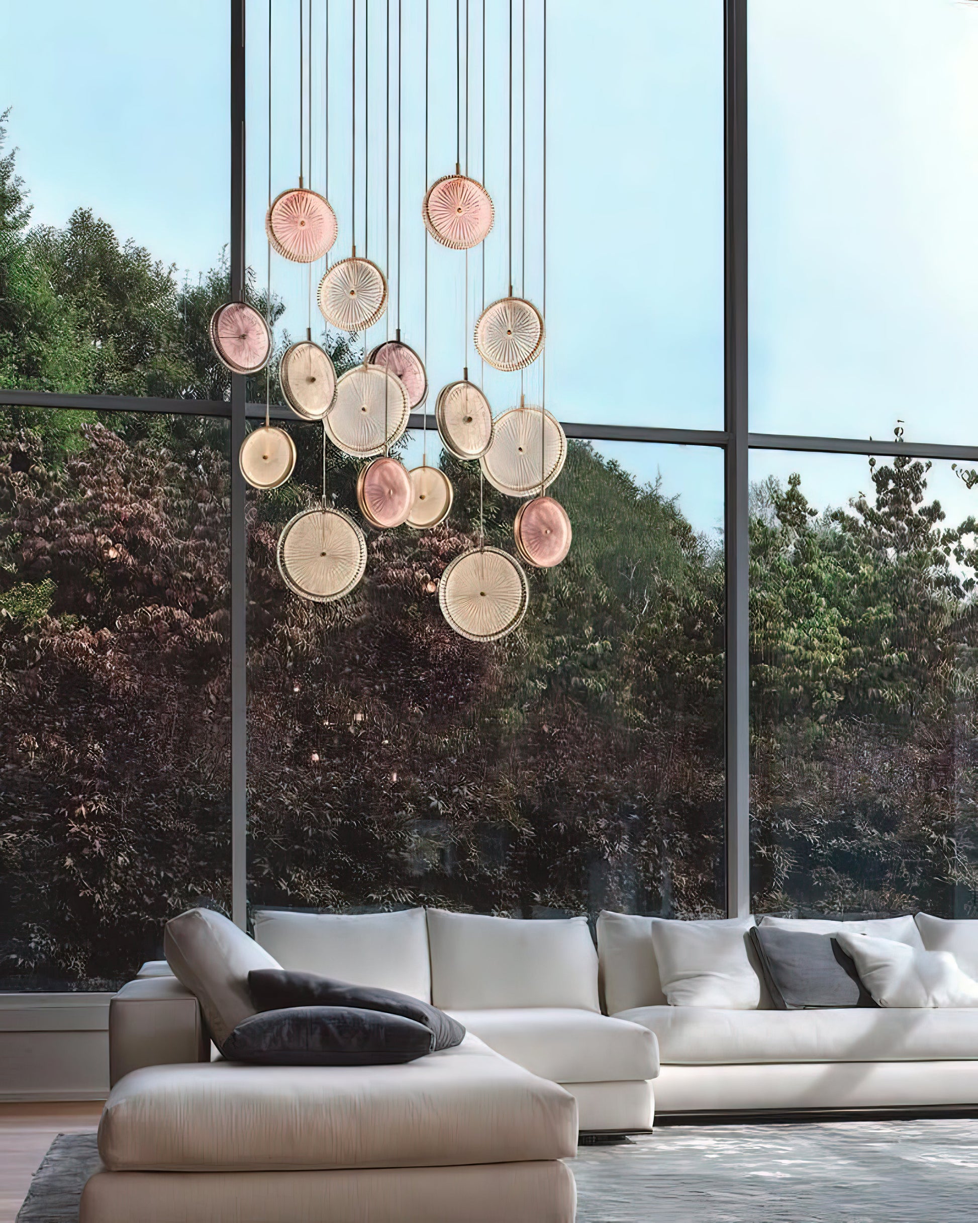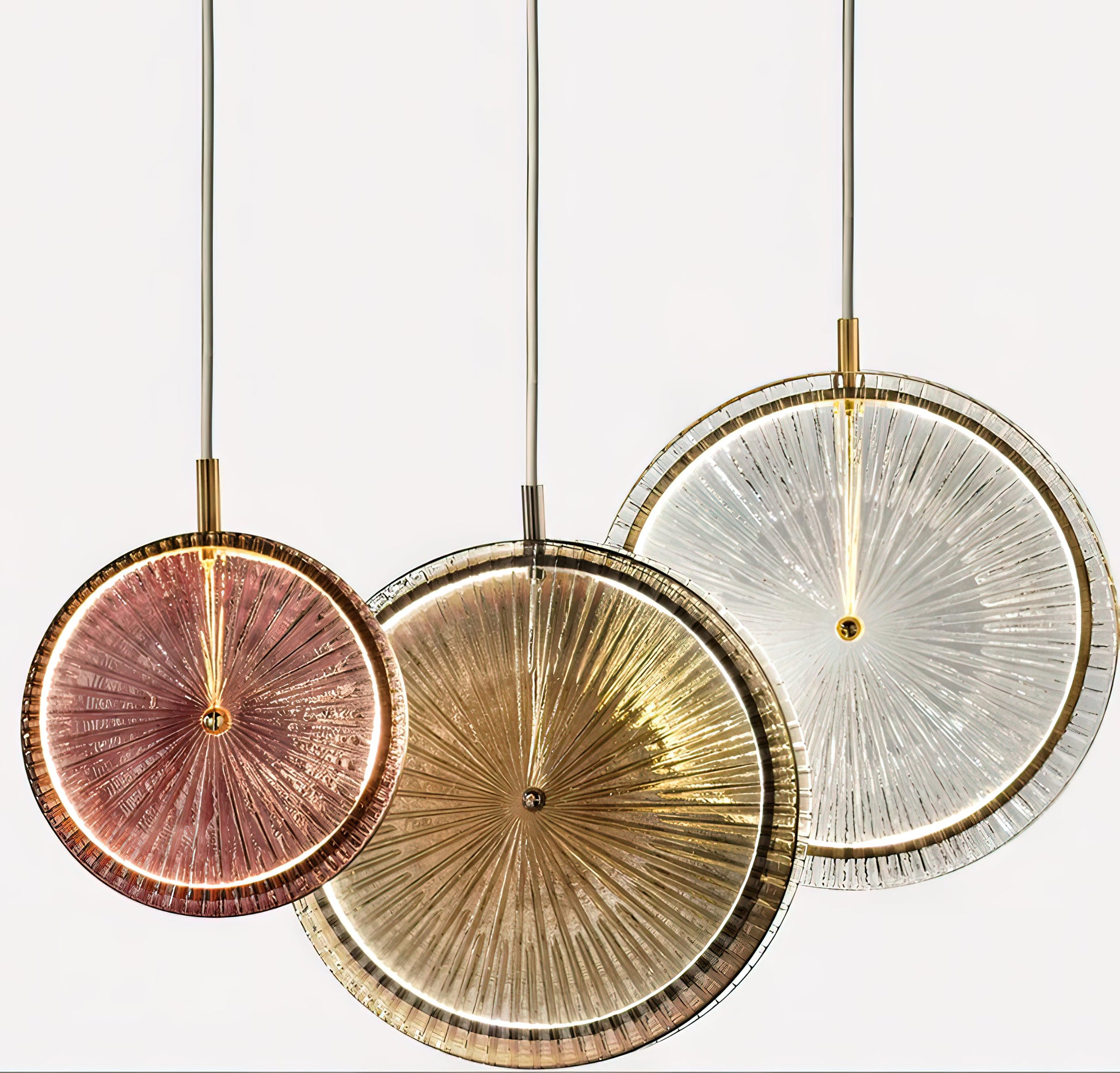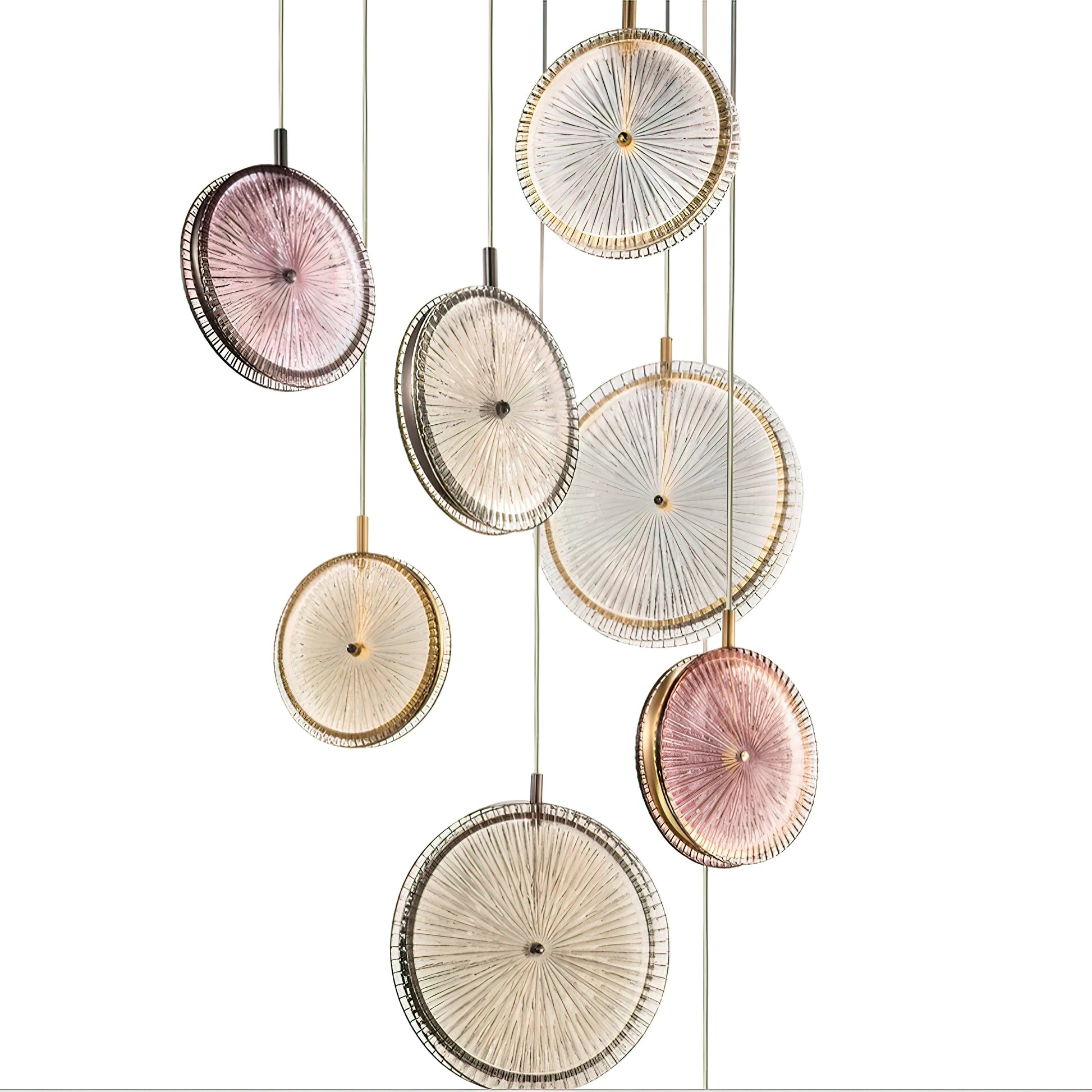 A masterpiece of modern elegance, the Beran Chandelier features stacked glass discs suspended at varying heights. Each disc boasts a unique textured pattern that softly reflects light, creating a warm, captivating glow that brightens any space. Soft pastel tones blend harmoniously with rich gold, adding a touch of luxurious sophistication. This Pendant Light is both a focal point and a source of soothing illumination, its dynamic and artistic appearance elevating any interior.