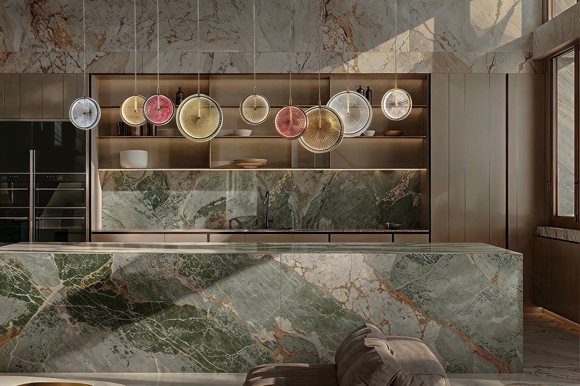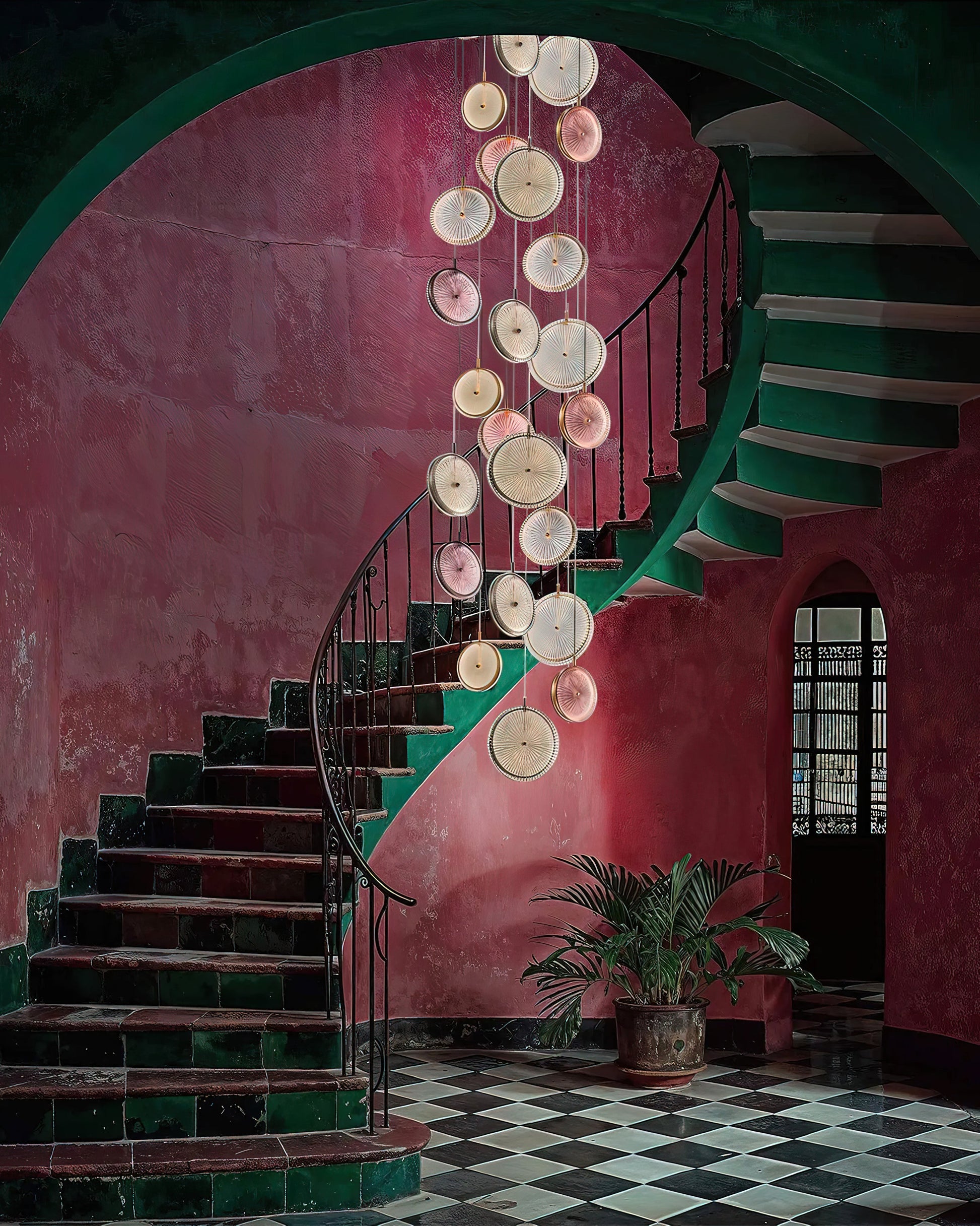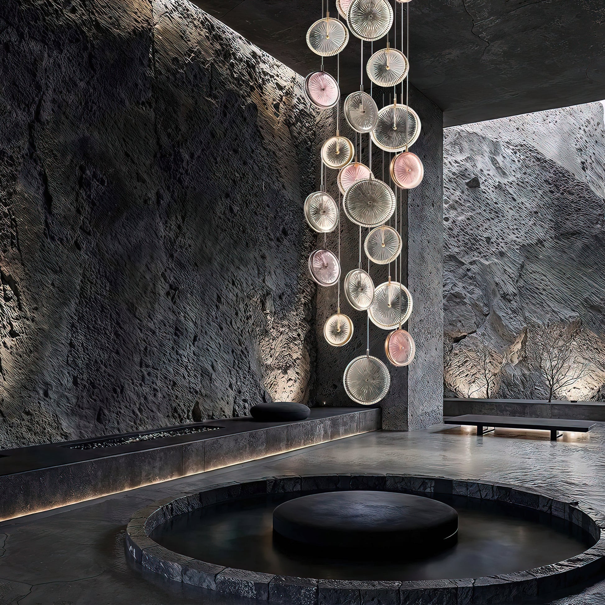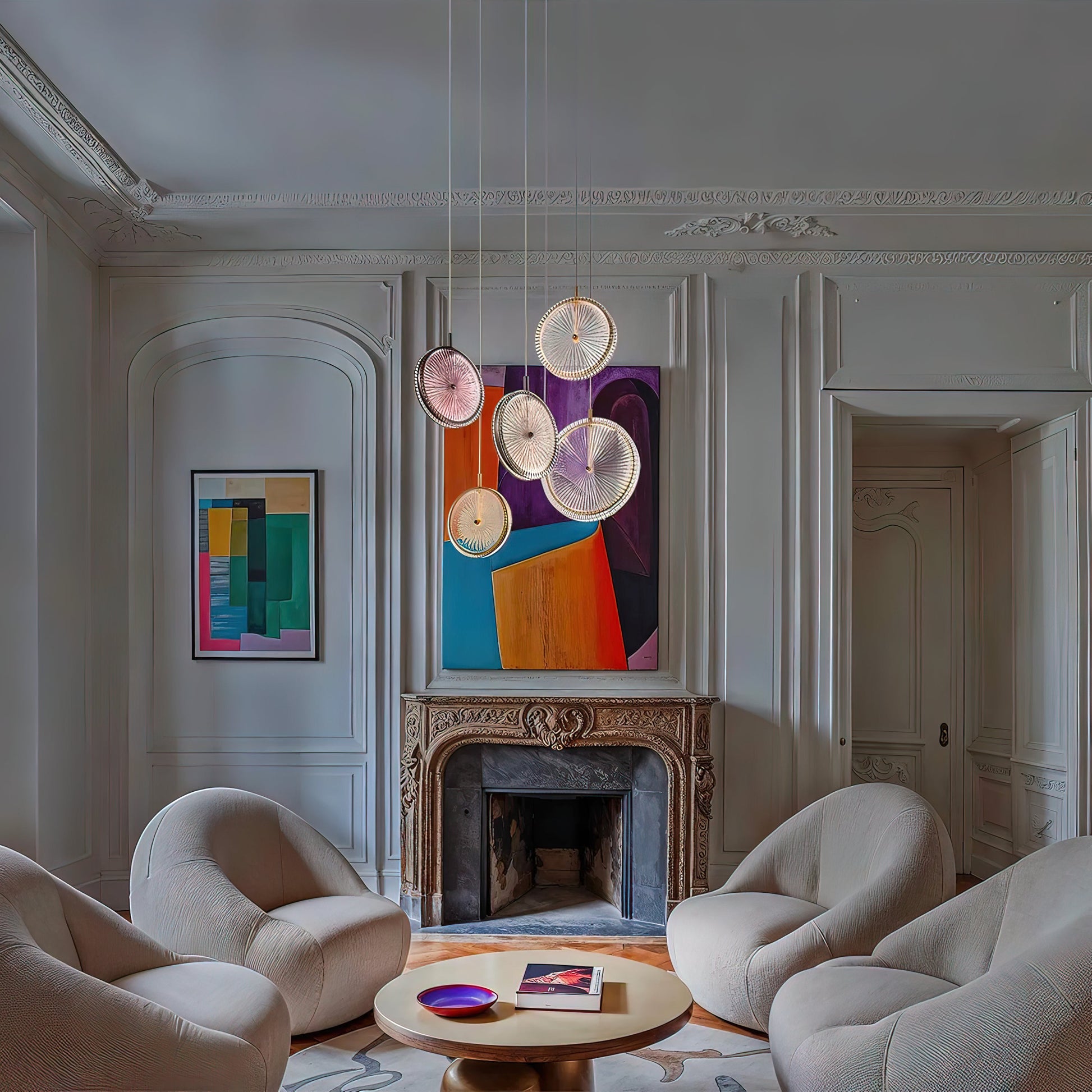 A masterpiece of modern elegance, the Beran Chandelier features stacked glass discs suspended at varying heights. Each disc boasts a unique textured pattern that softly reflects light, creating a warm, captivating glow that brightens any space. Soft pastel tones blend harmoniously with rich gold, adding a touch of luxurious sophistication. This Pendant Light is both a focal point and a source of soothing illumination, its dynamic and artistic appearance elevating any interior.