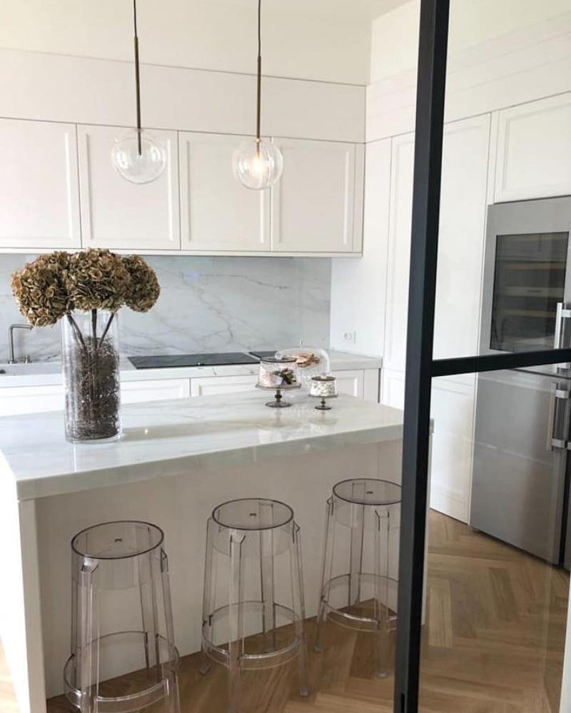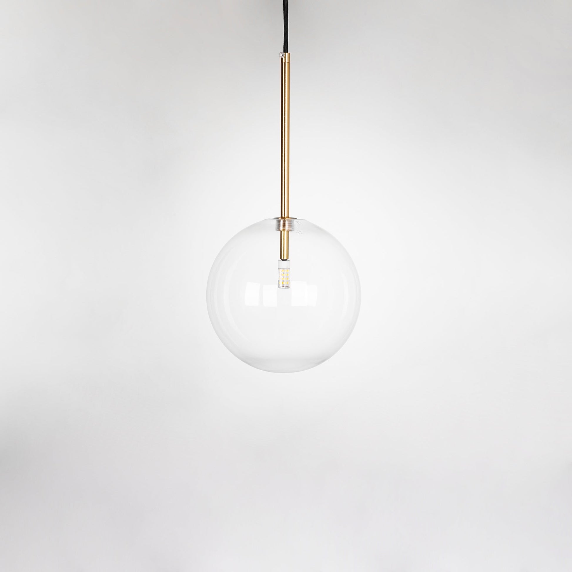 Hanging lamp with LED point light (G4 ). Transparent blown glass sphere. Metal parts in hand burnished brass. The hand-burnished brass finish looks naturally spotted and irregular. Due to this craft made processing, each product is unique and exclusive.