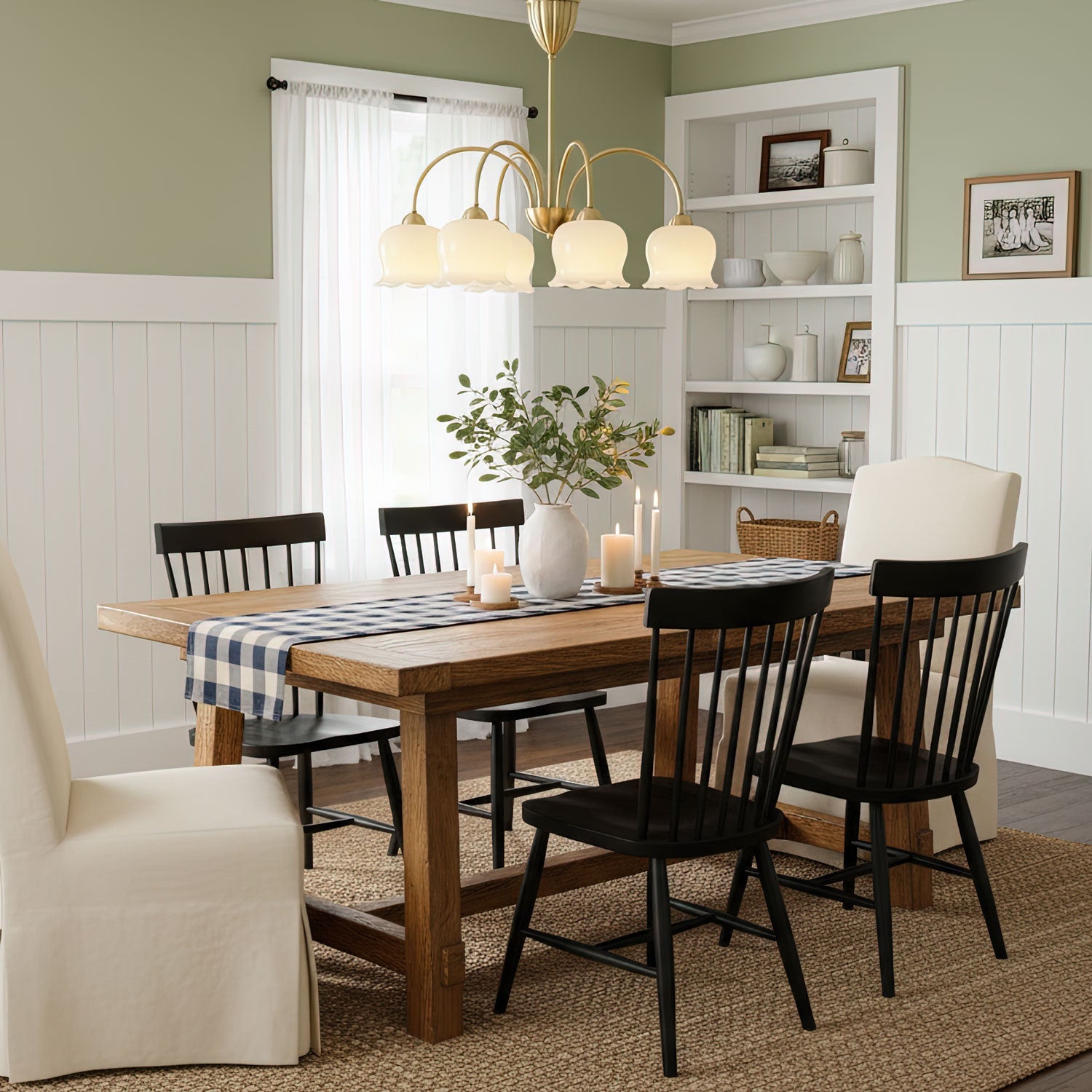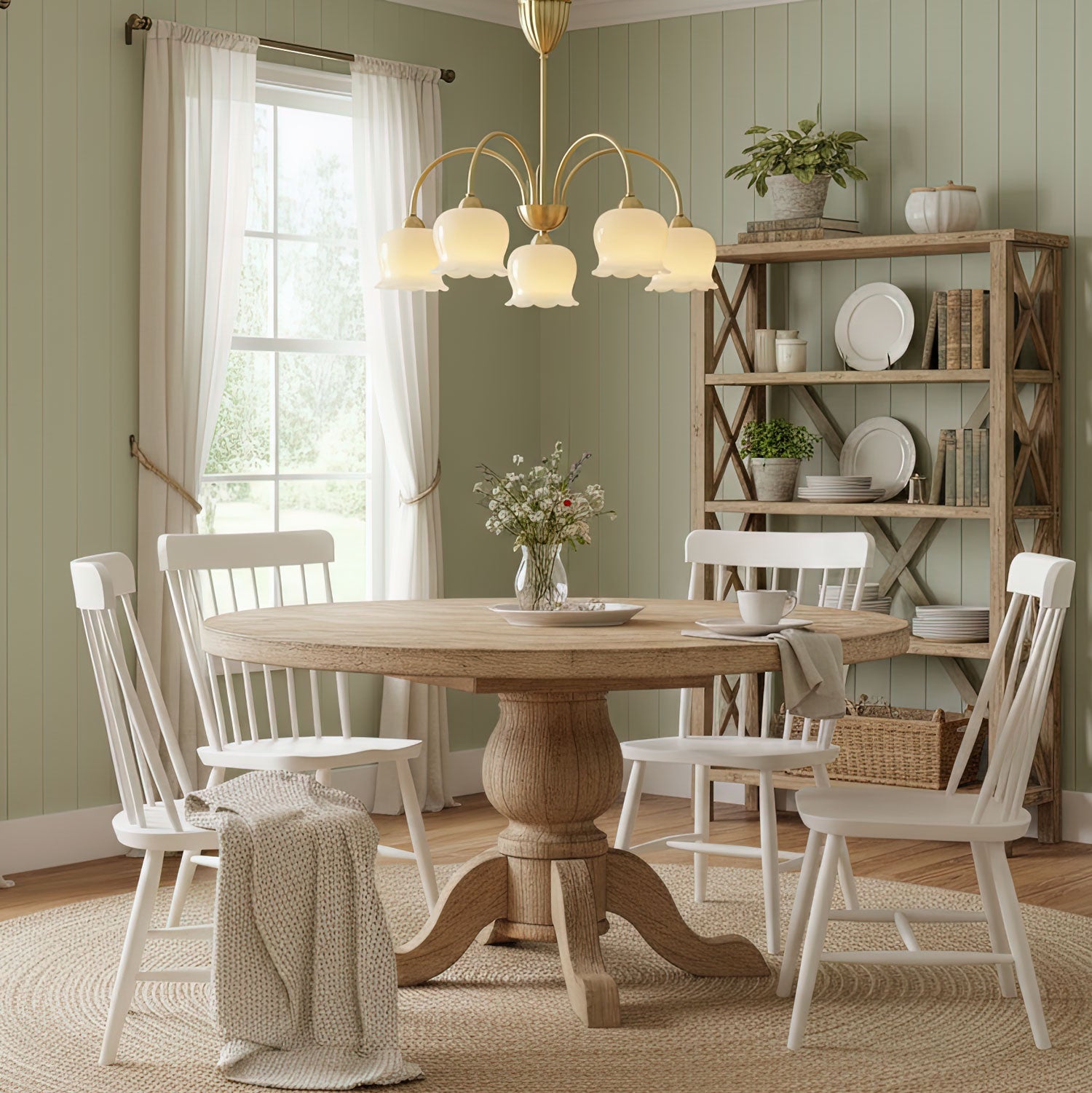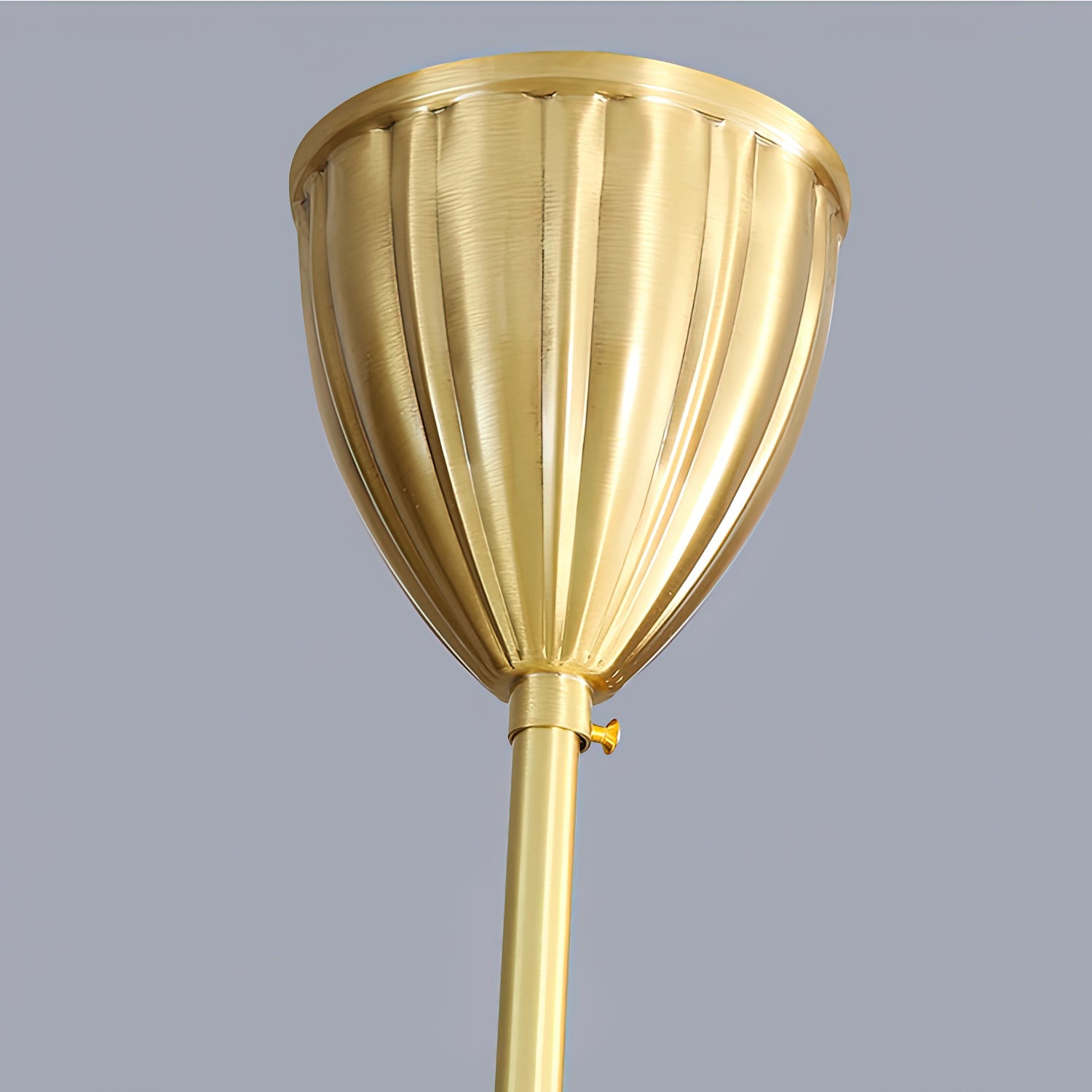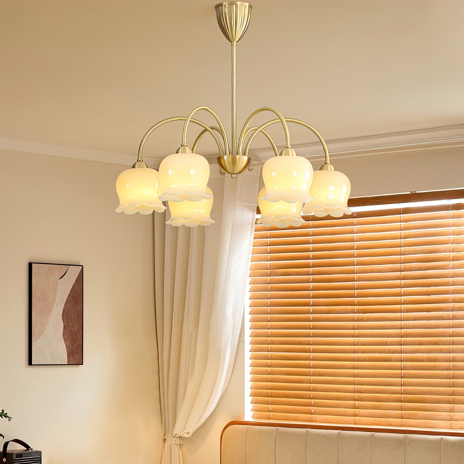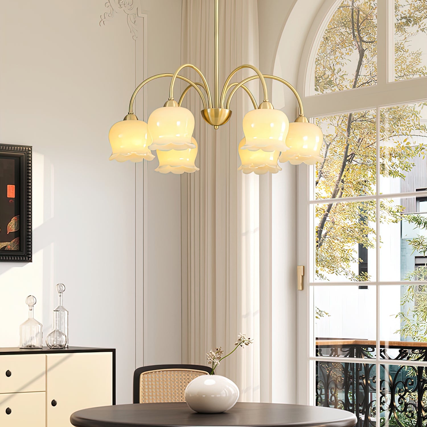 The Cavella Chandelier showcases gracefully unfurling golden arms that support five opaline glass lampshades, casting a soft, soothing glow. Its petal-inspired design and warm tones create a serene, romantic ambiance, adding refined elegance and subtle texture to dining rooms, bedrooms, or living spaces. This chandelier effortlessly enhances any interior with floral sophistication and gentle illumination.