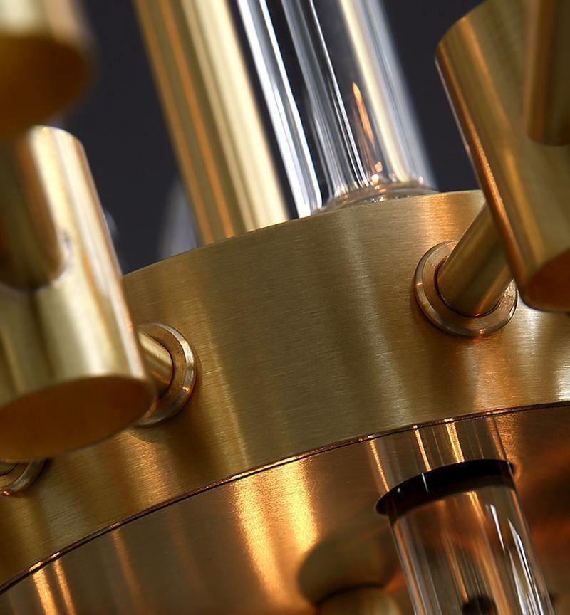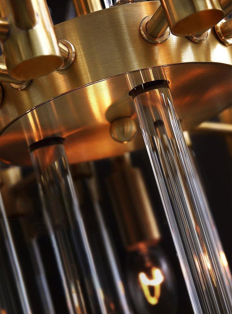 This classic brass chandelier features a unique design that includes clear glass rods for a unique look. Perfect for a formal dining area, the brass adds a touch of classic elegance and the glass rods create an element of light and texture to the space.