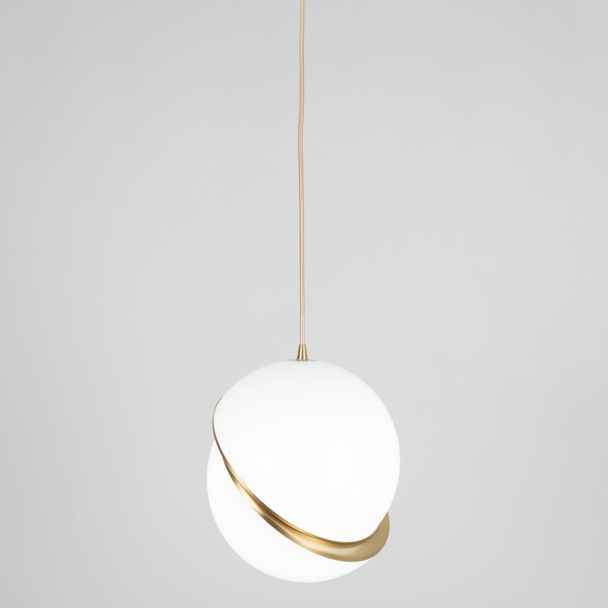 Crescent Pendant Lamp is an illuminated Opal sphere sliced in half to reveal a crescent-shaped brushed Brass fascia. Crescent seamlessly combines the solid and the opaque making this perfect in any setting.