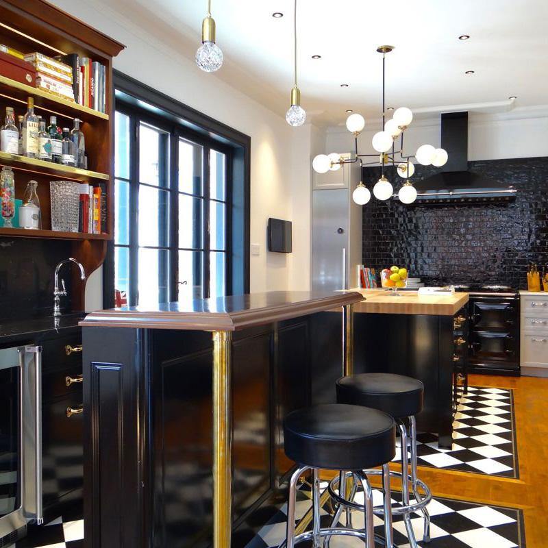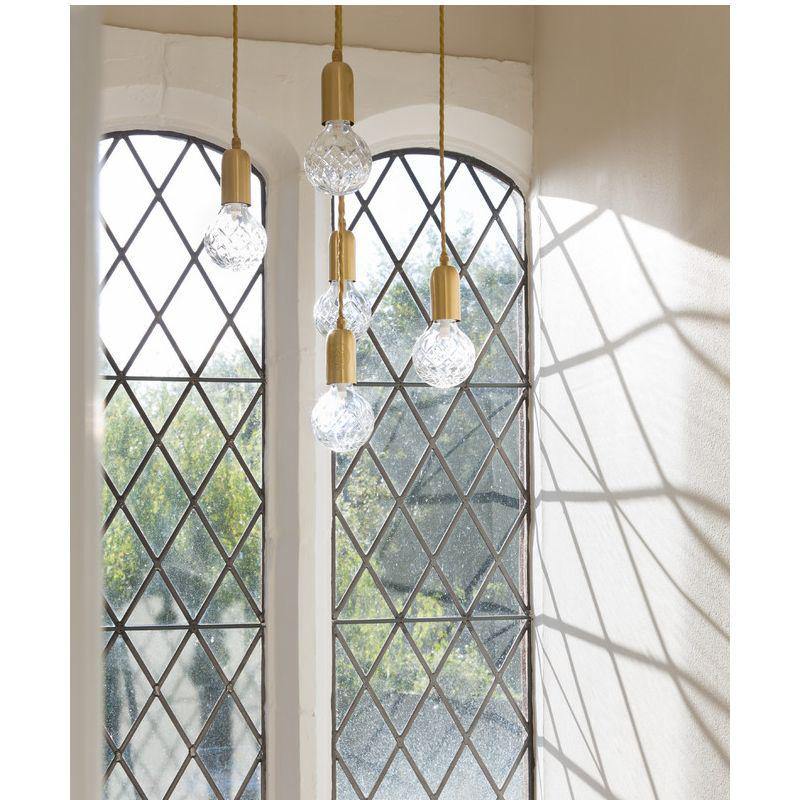 With the Crystal Bulb LED Multi-Light Pendant, takes inspiration from the exquisite and meticulous process of crystal cutting, commonly seen in traditional whiskey glasses and decanters. A grouping of spherical crystal shades suspends in an elegant composition, highlighted by their sophisticated hand-cut design. LED lighting diffused by the shades culminates into a clean ambient glow that accentuates the engraved ornamental logo on each of the Steel lamp holders.