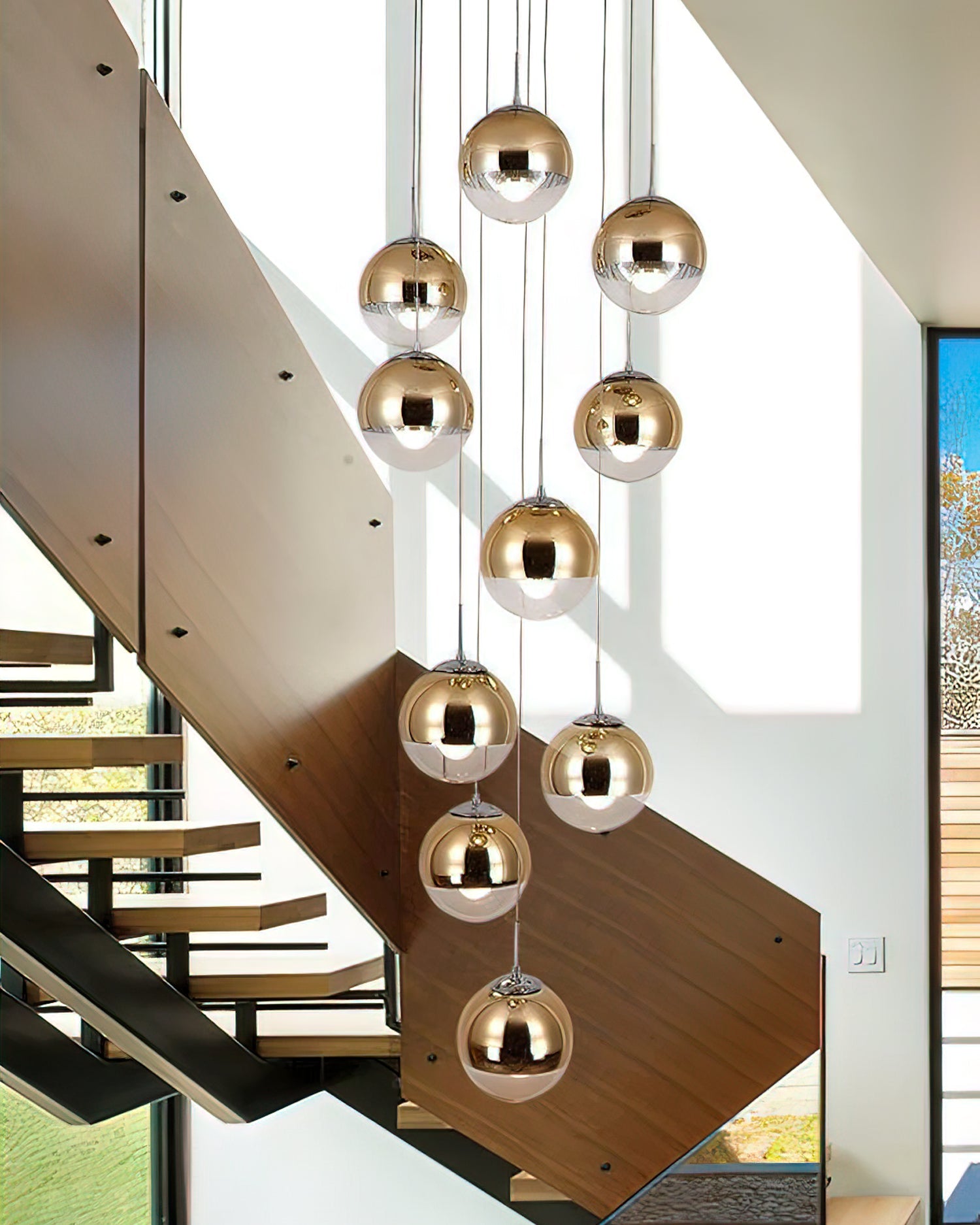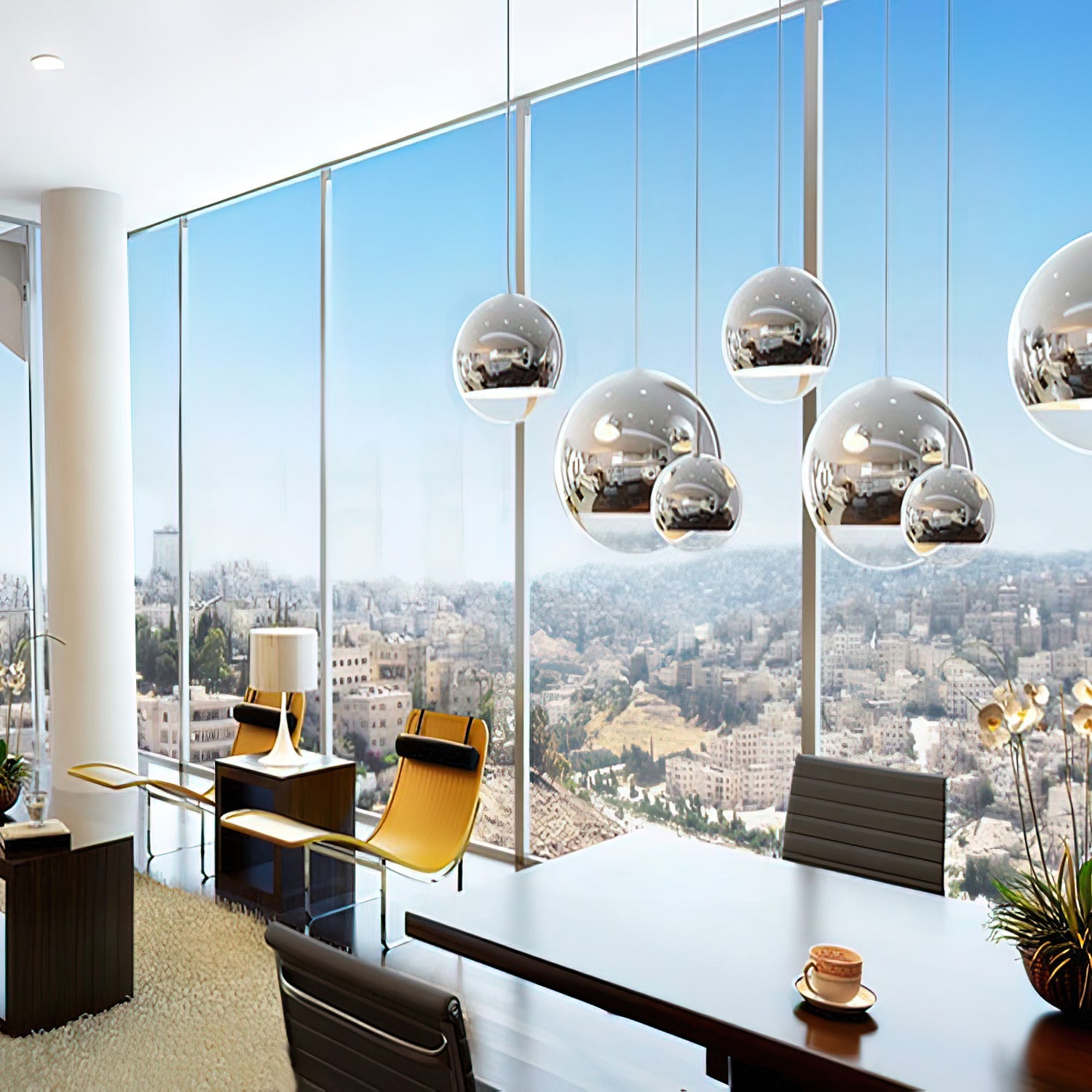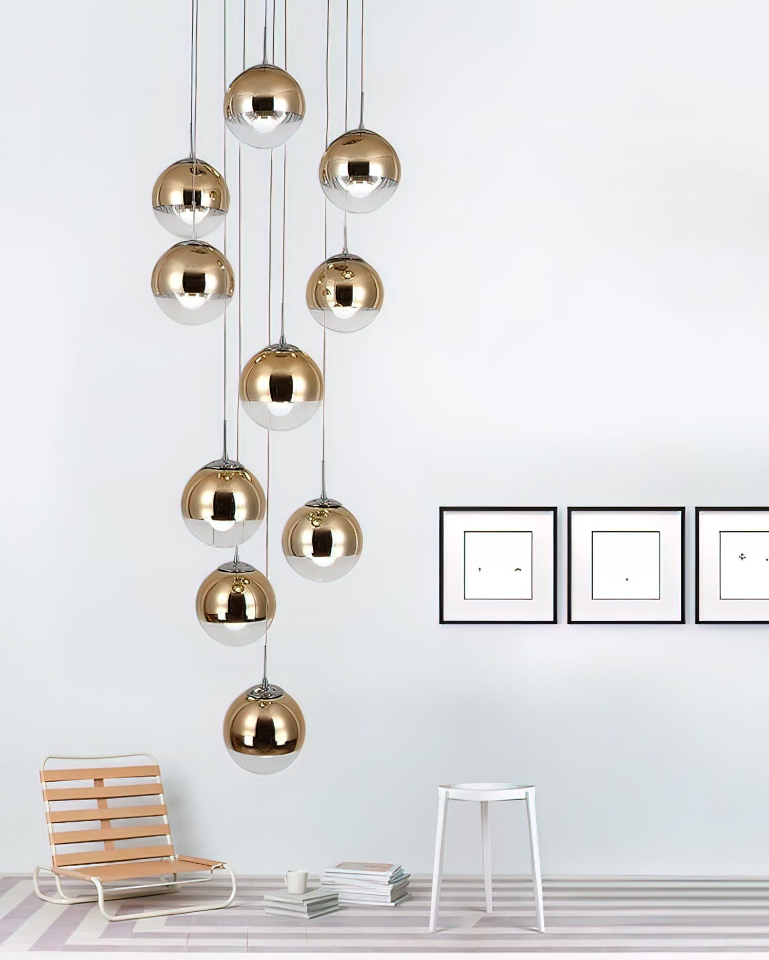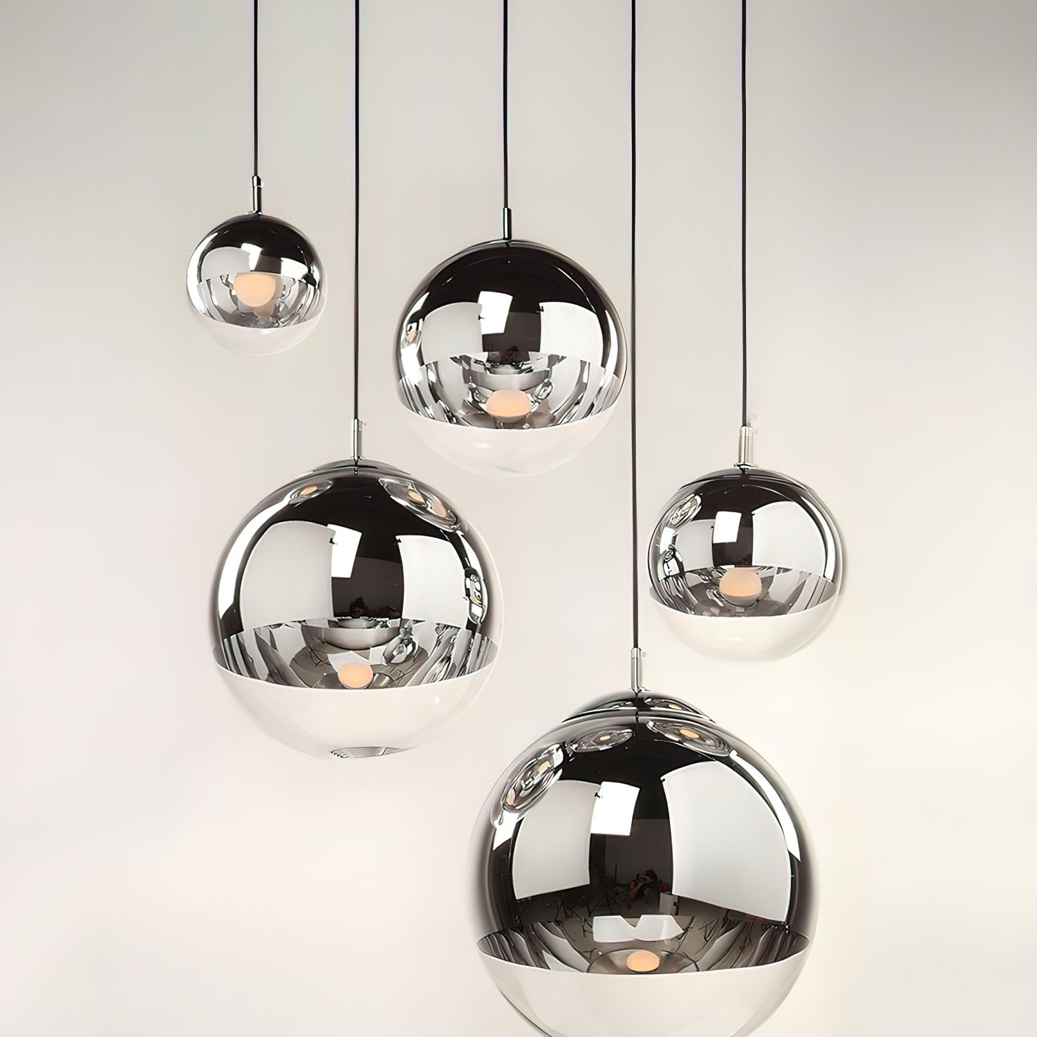 The Dalida Pendant Light seamlessly blends modern design with exquisite craftsmanship. Its mirrored glass globe is crafted from a sophisticated blend of glass and stone. Its fluid shape, accented by anodized finishes in copper, rose gold, and gold, enhances its sophistication and versatility. This chandelier adds a touch of understated charm to any room, seamlessly blending modern aesthetics with timeless elegance to create a sophisticated interior.