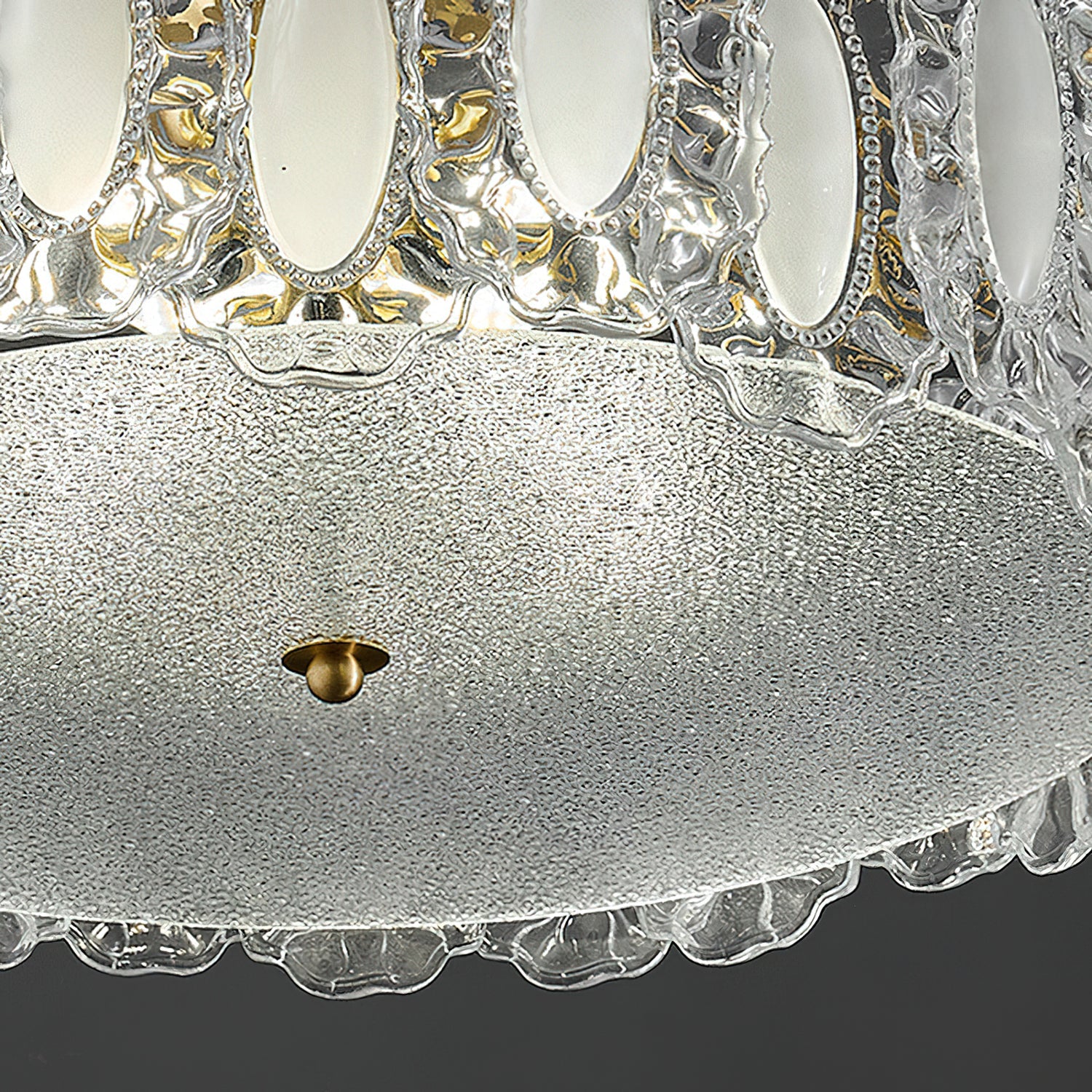 The Depuley Ceiling Light expertly blends vintage elegance with contemporary craftsmanship. Its circular frame features textured clear glass panels accented by slender frosted ovals that gently diffuse light, creating a warm, glare-free ambiance. Enhanced by warm gold details, this fixture adds a luxurious touch while providing soft illumination ideal for living rooms, bedrooms, or hallways. Combining decorative artistry with practical lighting, the Depuley Ceiling Light offers a refined solution for enhancing cozy spaces.