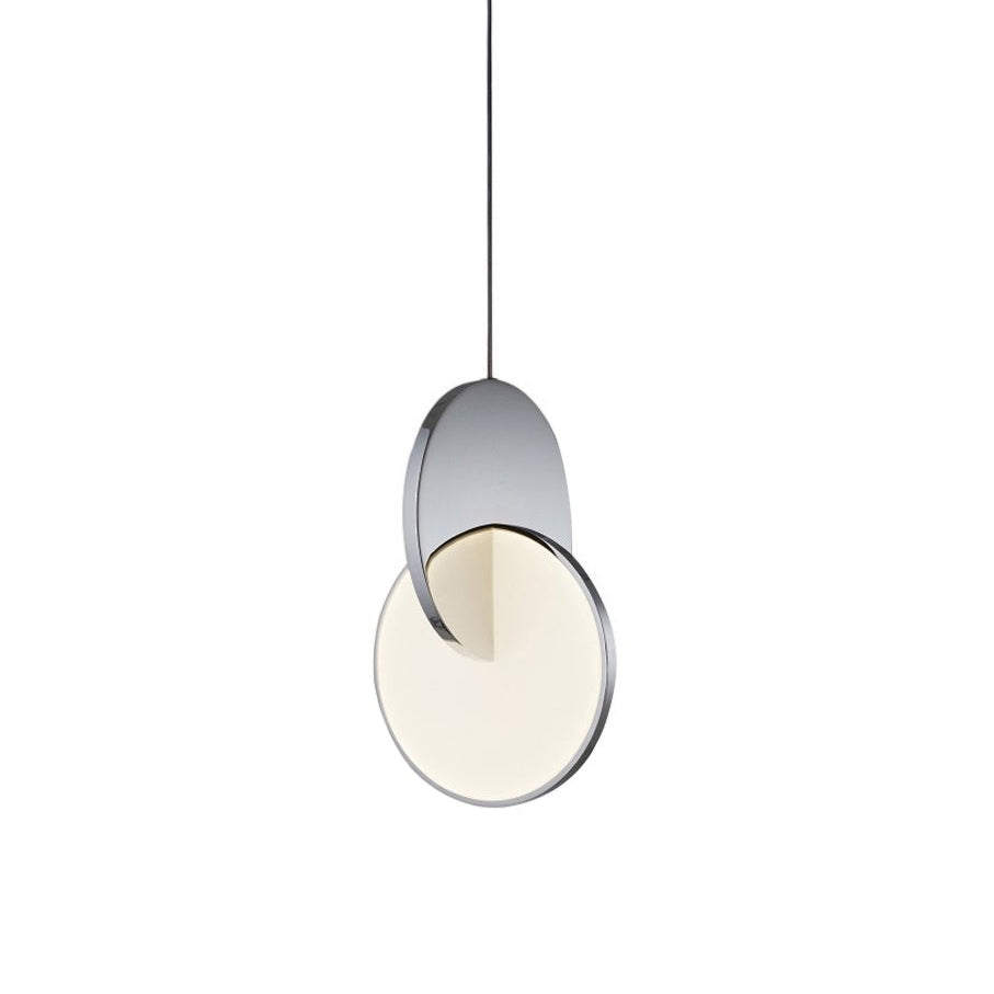 Eclipse Pendant is celestial in both its name and inspiration. Polished chrome and acrylic discs interact, dissect and obscure, which both eclipses and reveals its illumination to the viewer at the same time. Eclipse is available as a singular pendant light, tiered chandelier and table lamp in polished chrome and polished gold finishes.