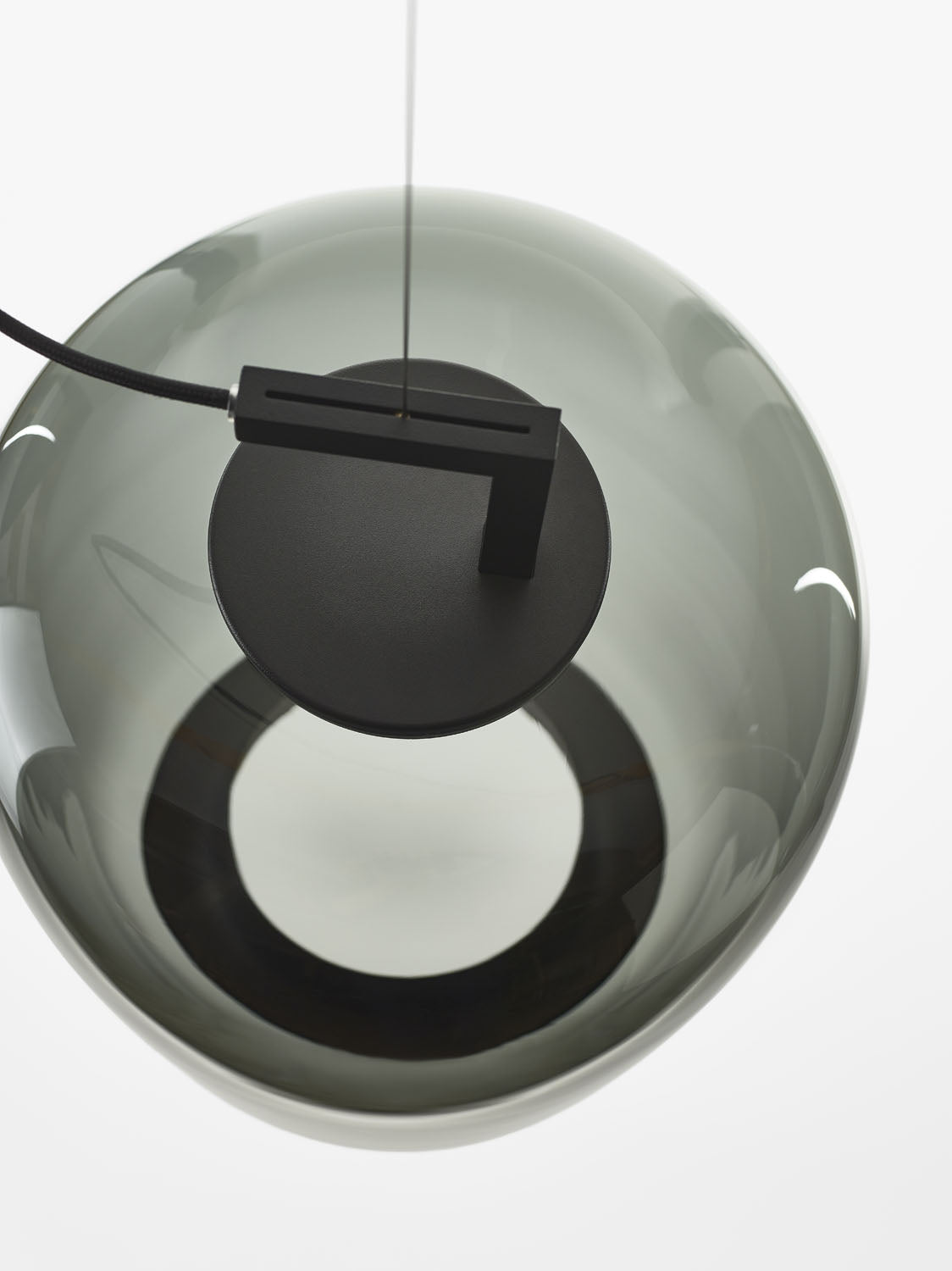 Double These elements depend on one another to generate a unique and consonant form. The glass globe terminating in a metal ring provides a suggestive effect, with the handle on top alluding to the idea of transporting the light.