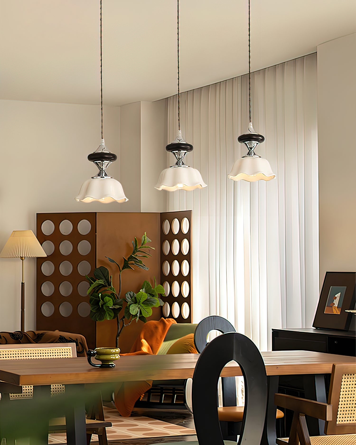 The Elena Pendant Light artfully merges vintage charm with contemporary elegance. Its sleek chrome finish contrasted by dark accents creates a visually striking centerpiece. The streamlined ceramic shade gently diffuses light, fostering a warm and inviting ambiance. Ideal for installation as a single statement piece or in multiples above dining tables, kitchen counters, or reading nooks, this pendant light delivers both refined style and effective illumination.