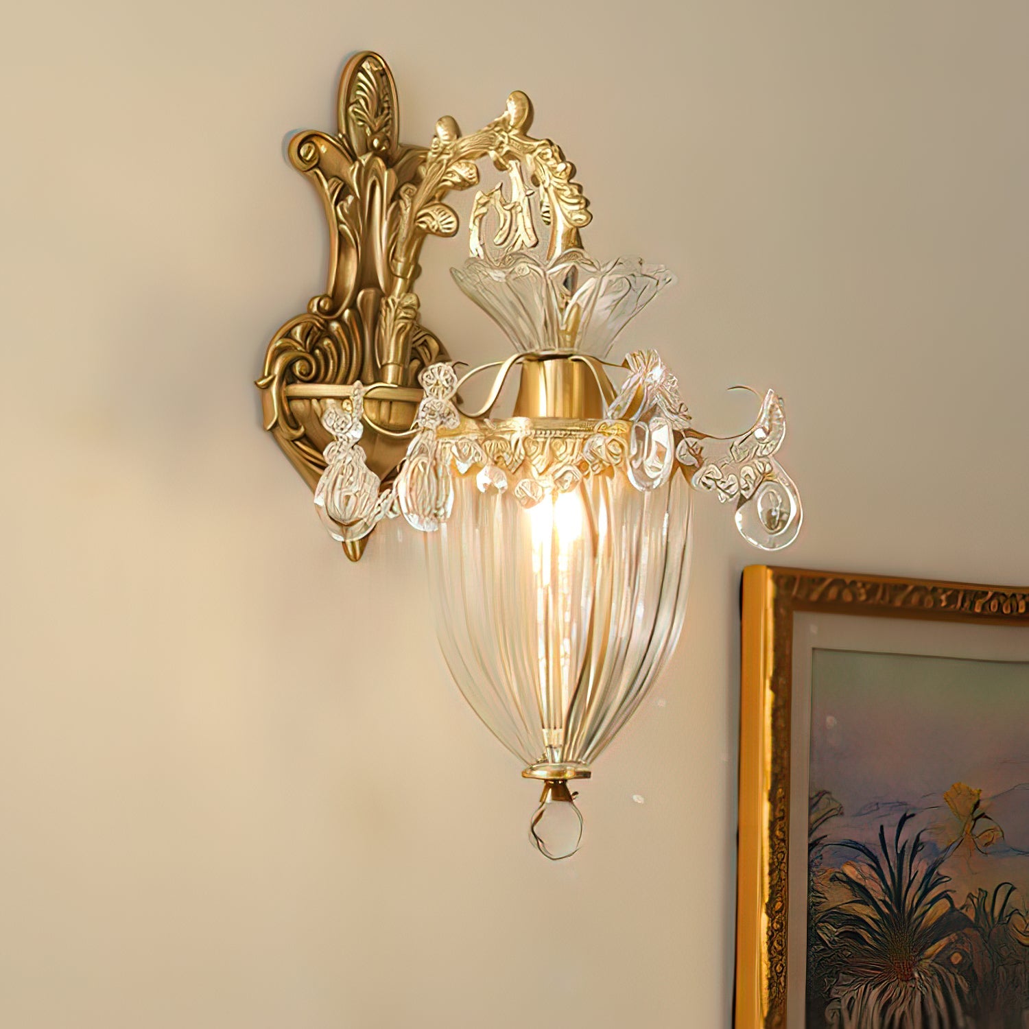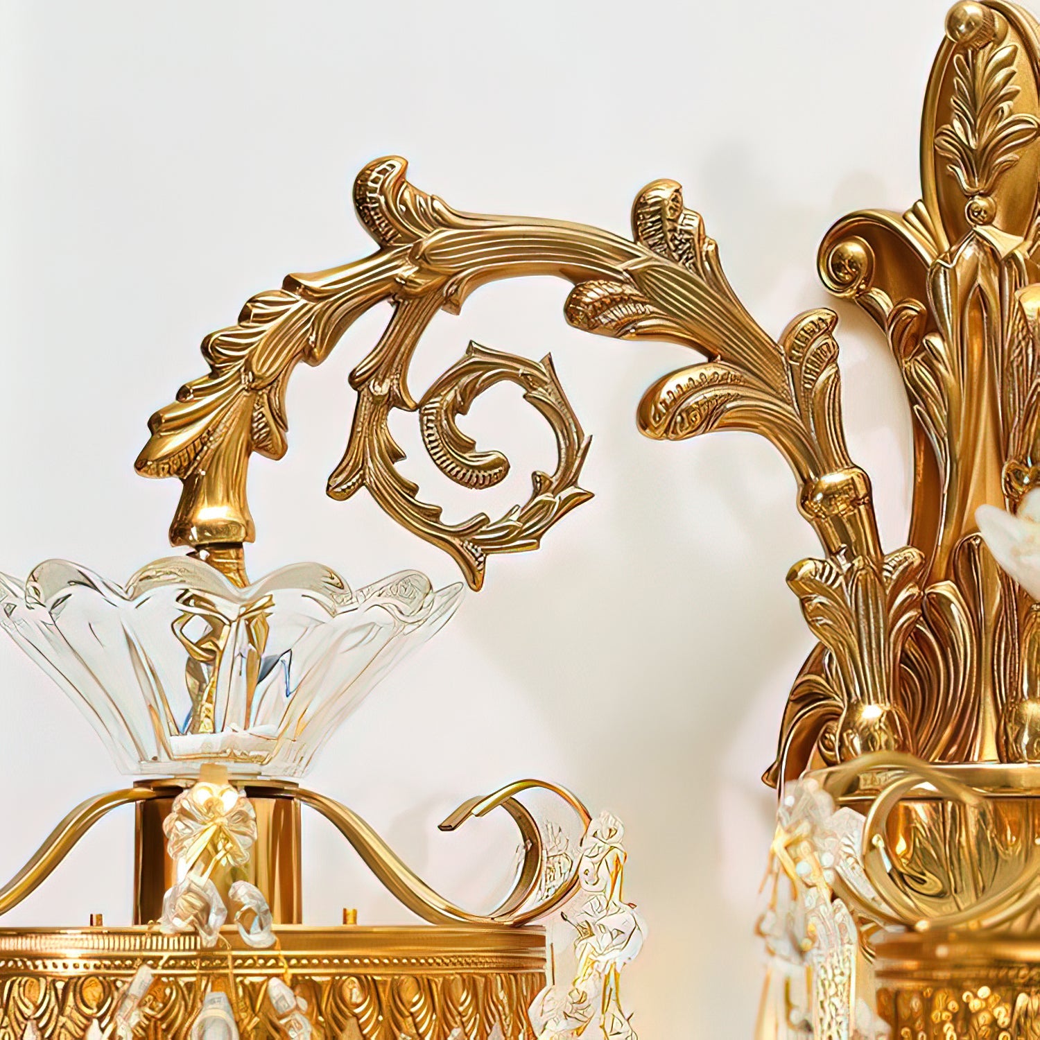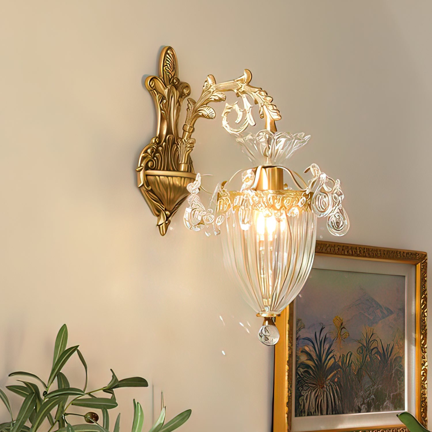 The Emiliana Wall Lamp combines classic French craftsmanship with luxurious brass and crystal materials. Featuring two elegantly crafted glass shades, it casts a soft, inviting glow that enhances any sophisticated living room or bedroom. This timeless piece adds refined charm and a touch of luxury, making it an ideal choice for those seeking both style and quality in their interior lighting.