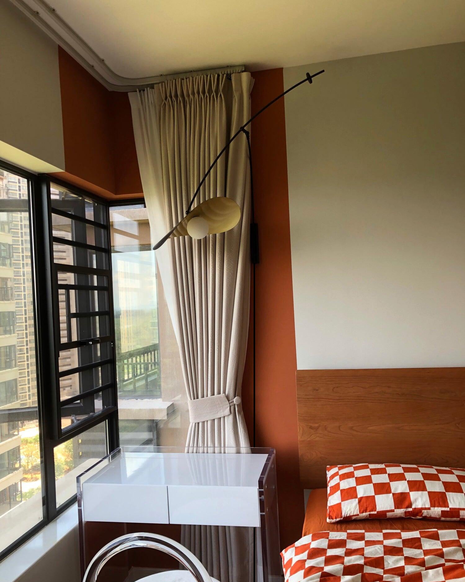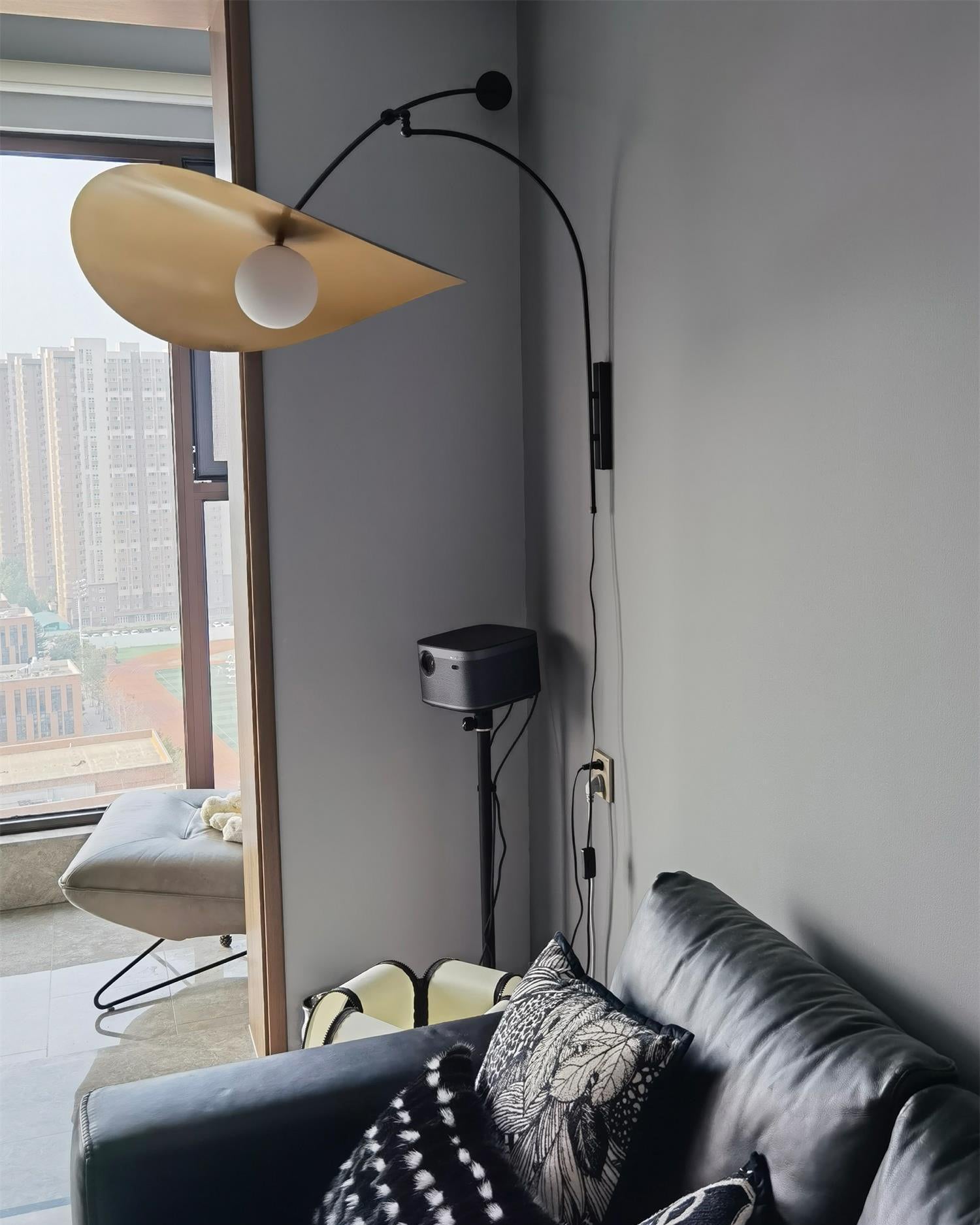 The Emma Plug-in Wall Light is a striking large-scale light sculpture mounted on an adjustable arm, allowing easy height adjustment through a movable round counterweight. Its handblown glass globe paired with a perforated reflector shade casts a gentle glow and subtle shadows, creating an intimate and inviting atmosphere around the fixture. This sophisticated design blends form and function, perfect for enhancing both residential and commercial interiors.
