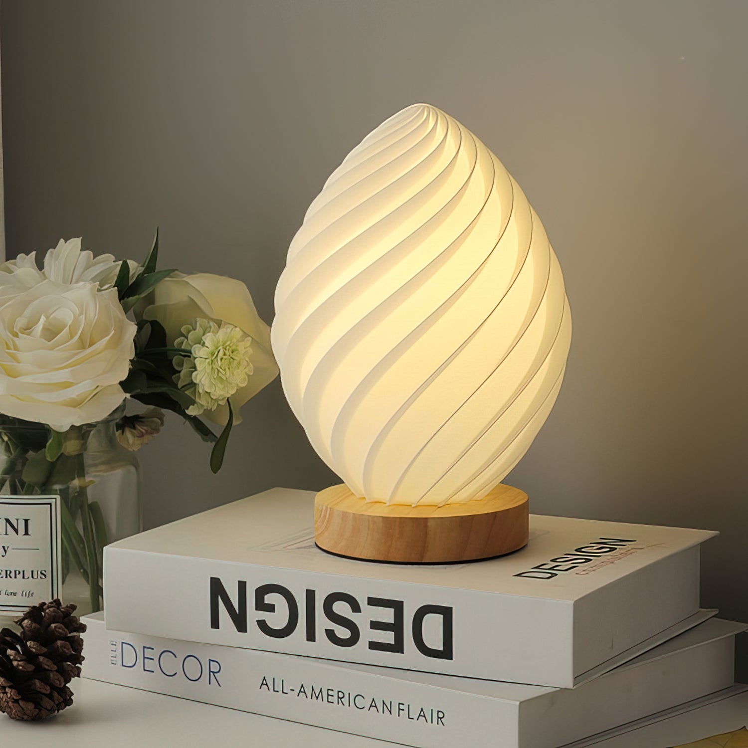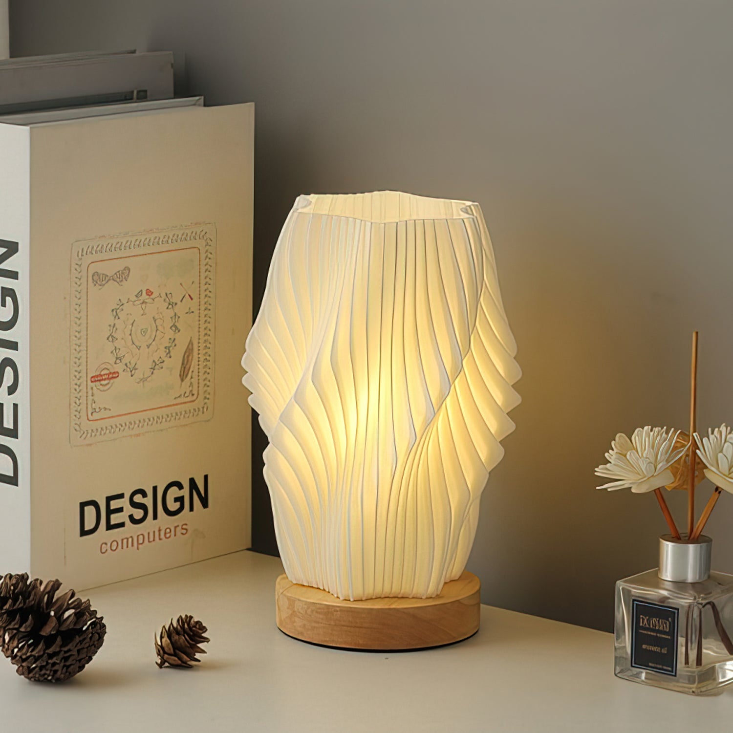 The Ernestine lamp is a fluid, dynamic lamp, with each delicate curve catching the light like flowing fabric, creating a sculptural work that is both lighting and art. The delicate pleating and warm wood base create a tranquil atmosphere. Perfect for a bookshelf, bedside table or creative space, it illuminates your daily life with understated elegance and harmonious visual effects.