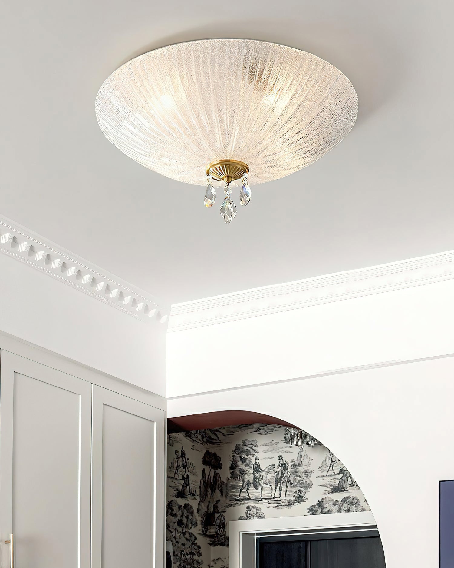 The Eurofase ceiling light creates an elegant focal point with a glass shade that subtly mimics a delicate finish. The suspended crystal chandelier adds a touch of sophistication and elegance, elevating the ambience of any room. This light is ideal for spaces that seek to combine luxury with artistic design.