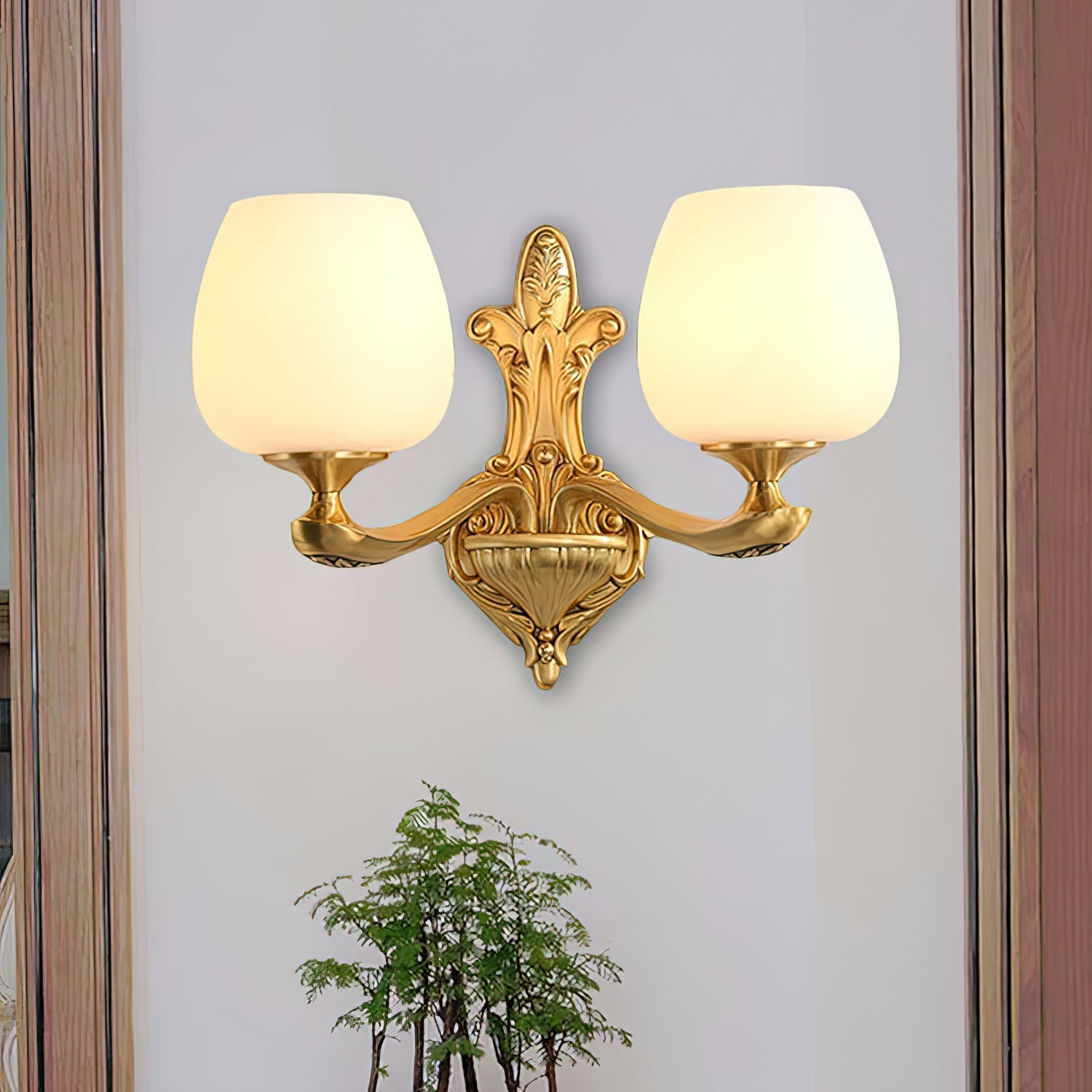 The Fateh Wall Lamp showcases a rustic cream glass shade that brings subtle elegance to any bedroom. Its brass finish and minimalist design blend seamlessly with various decor styles, making it a refined and versatile lighting choice for your home.