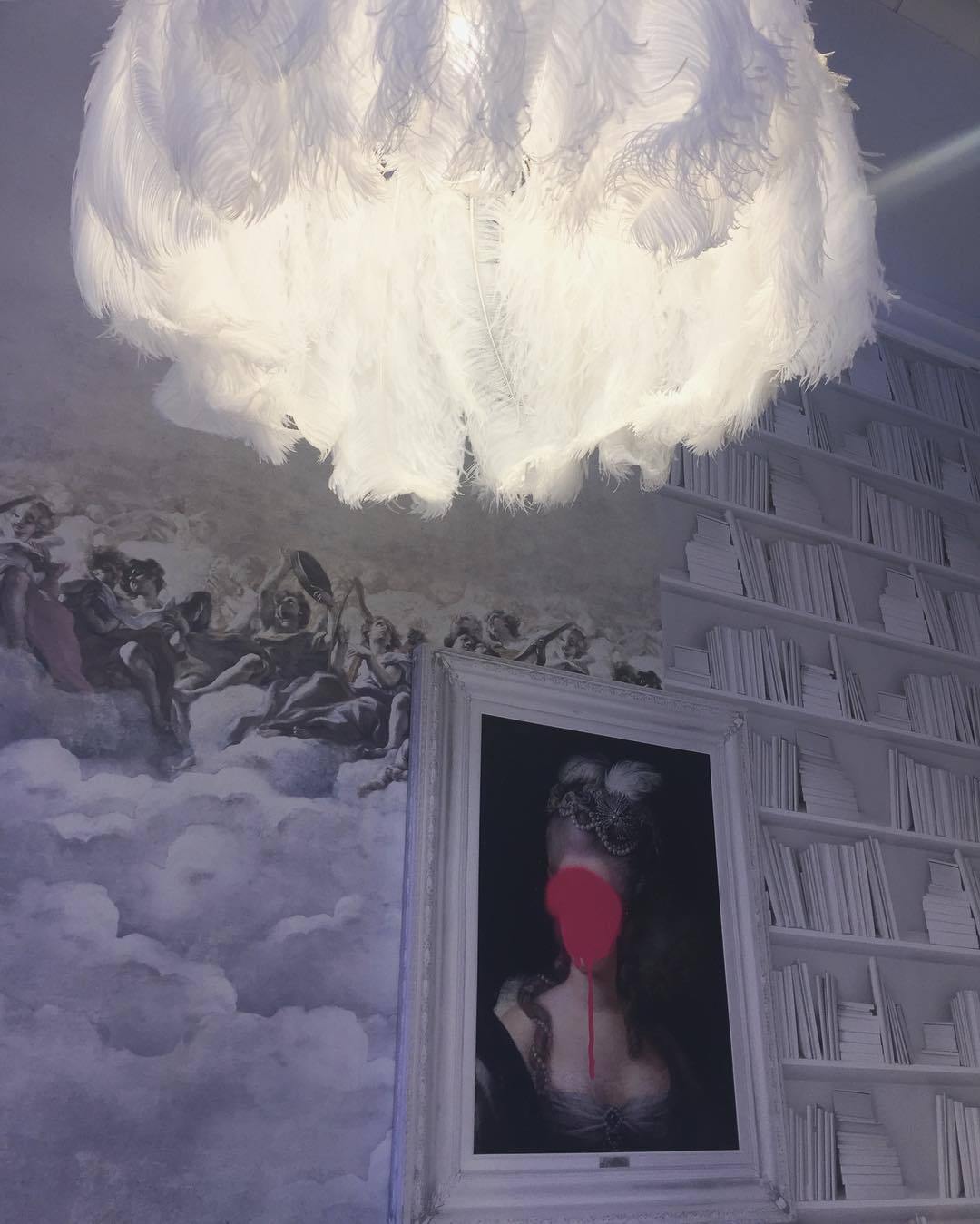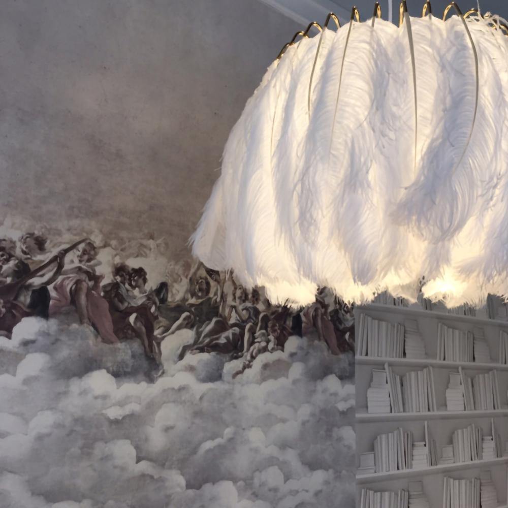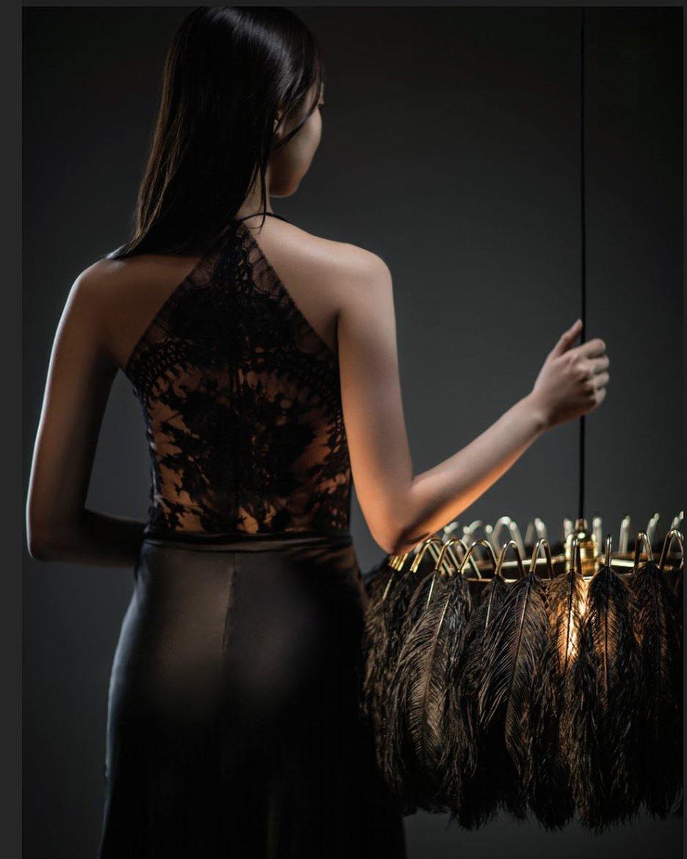 The Lamps feature a ring of authentic feathers secured by a series of metal gold arms which glow and glint seductively when alight. Available in jet black or pristine white, they come as a pendant or table lamp.