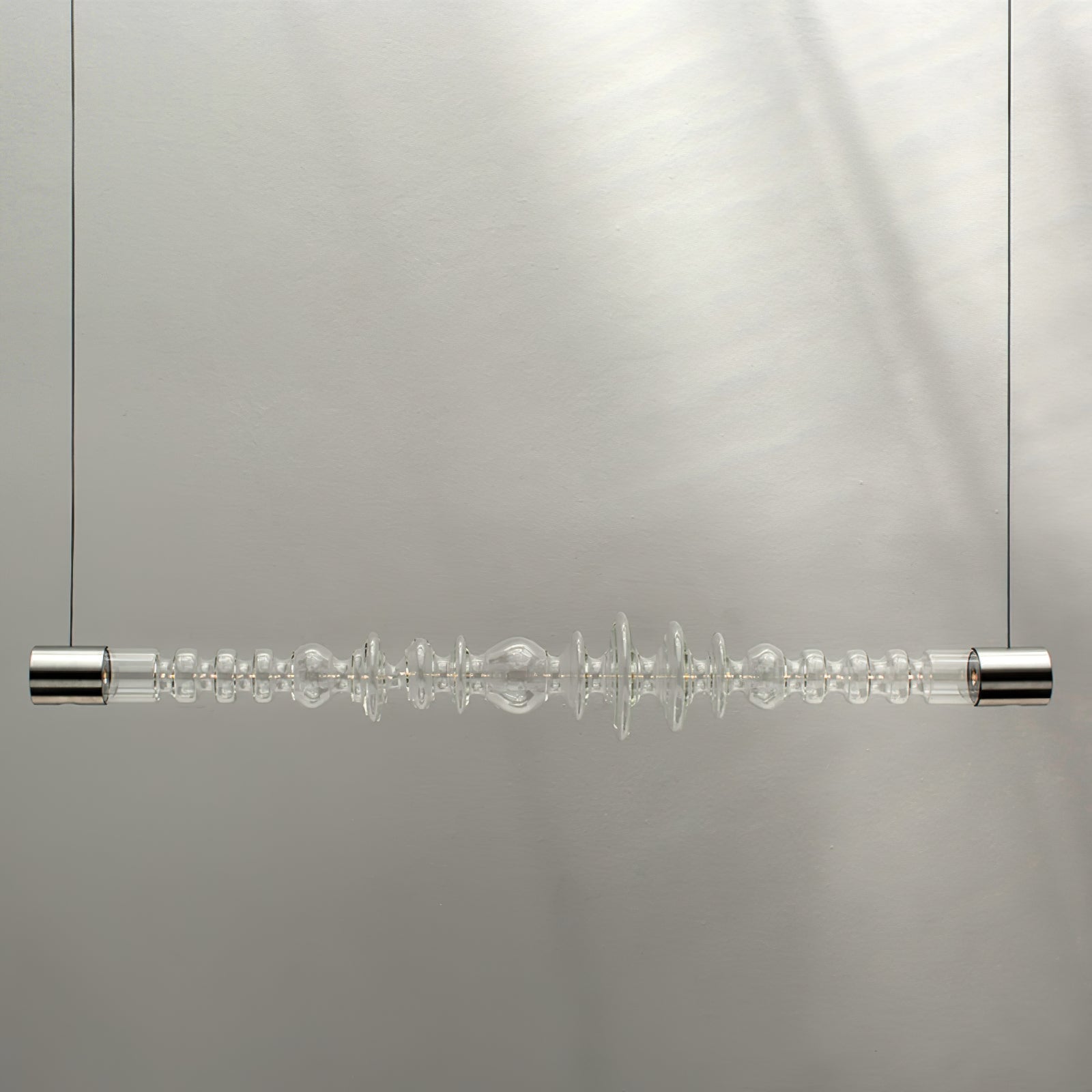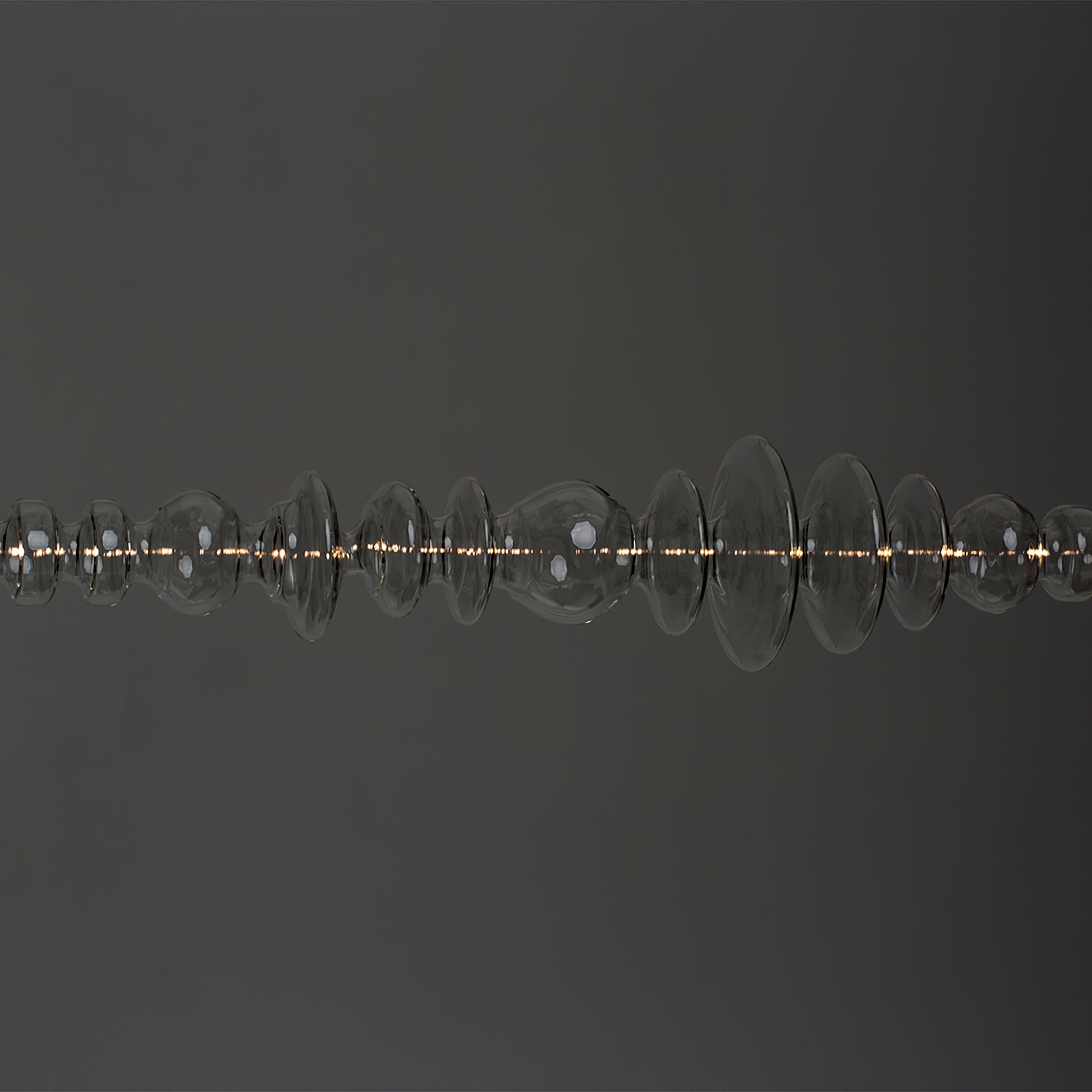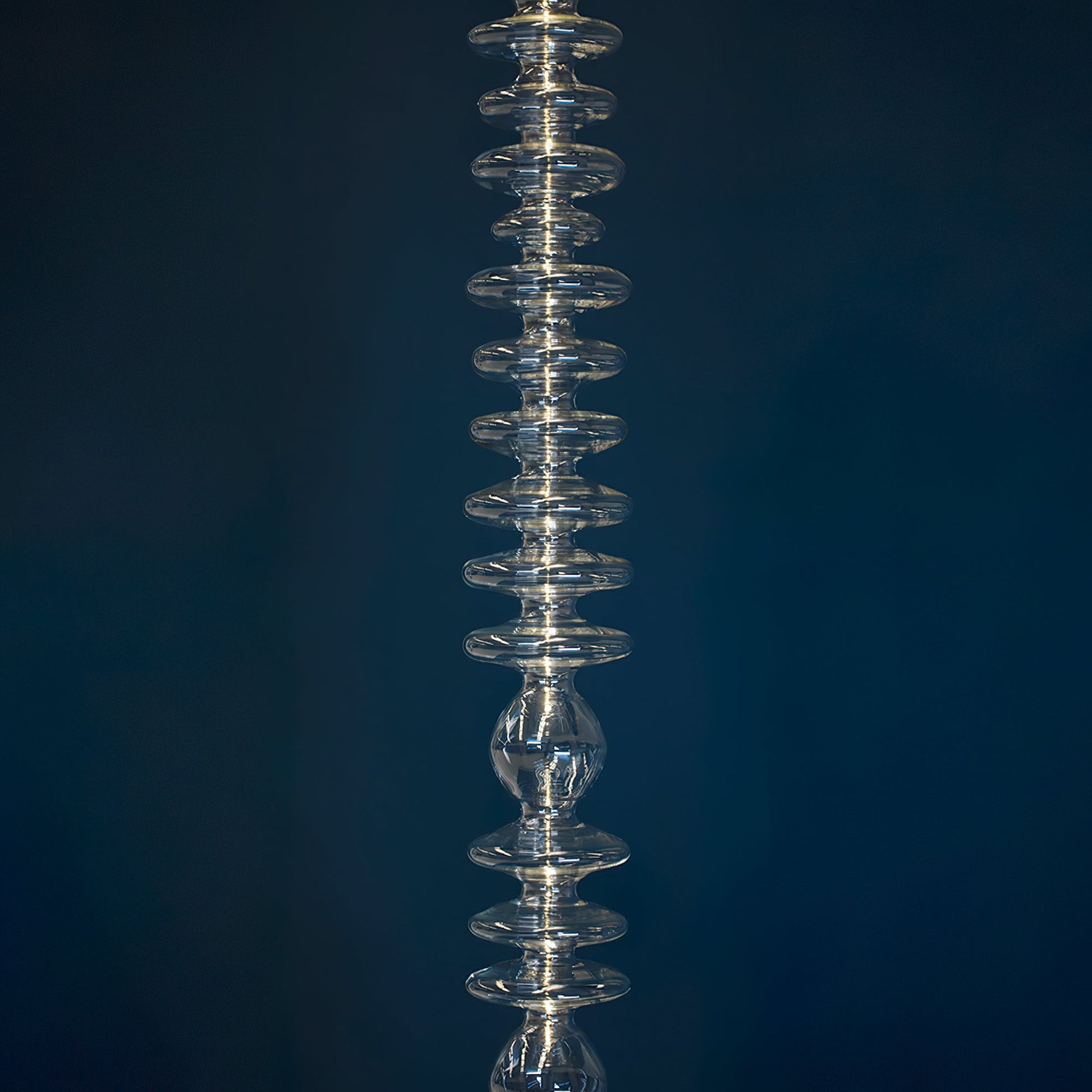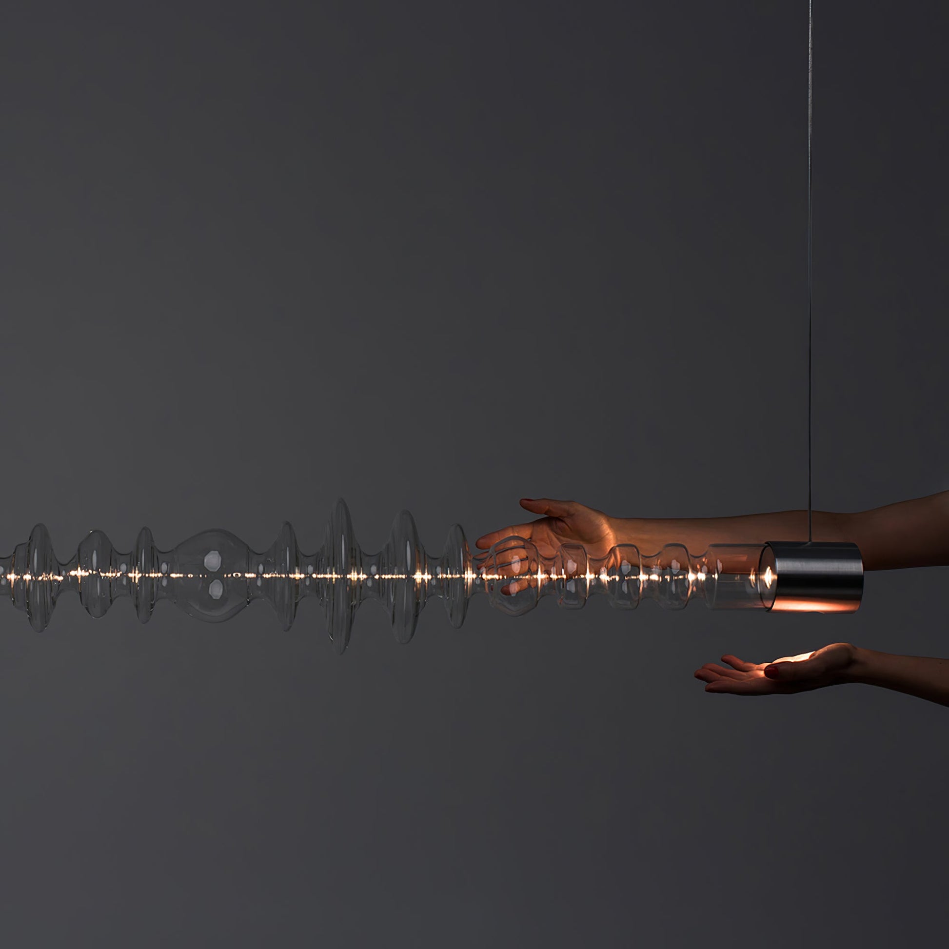 Filamento is a sculptural piece made of a single piece of glass more than one meter long. When illuminated, its form and matter disappear, giving way to a filament of light as a result of the study of its geometry. The propagation of particles called photons becomes a visible and linear form of energy. It serves as a study of how light travels through concave and convex glass. It can be used outdoor and indoors.