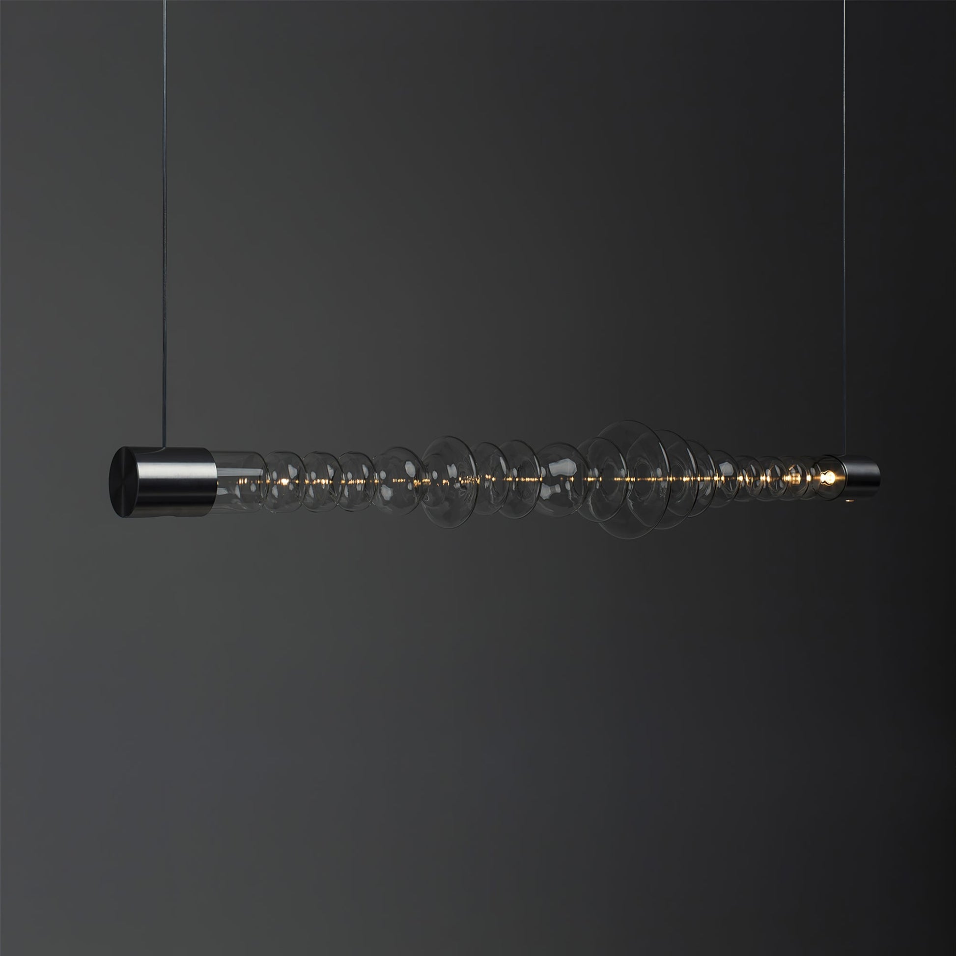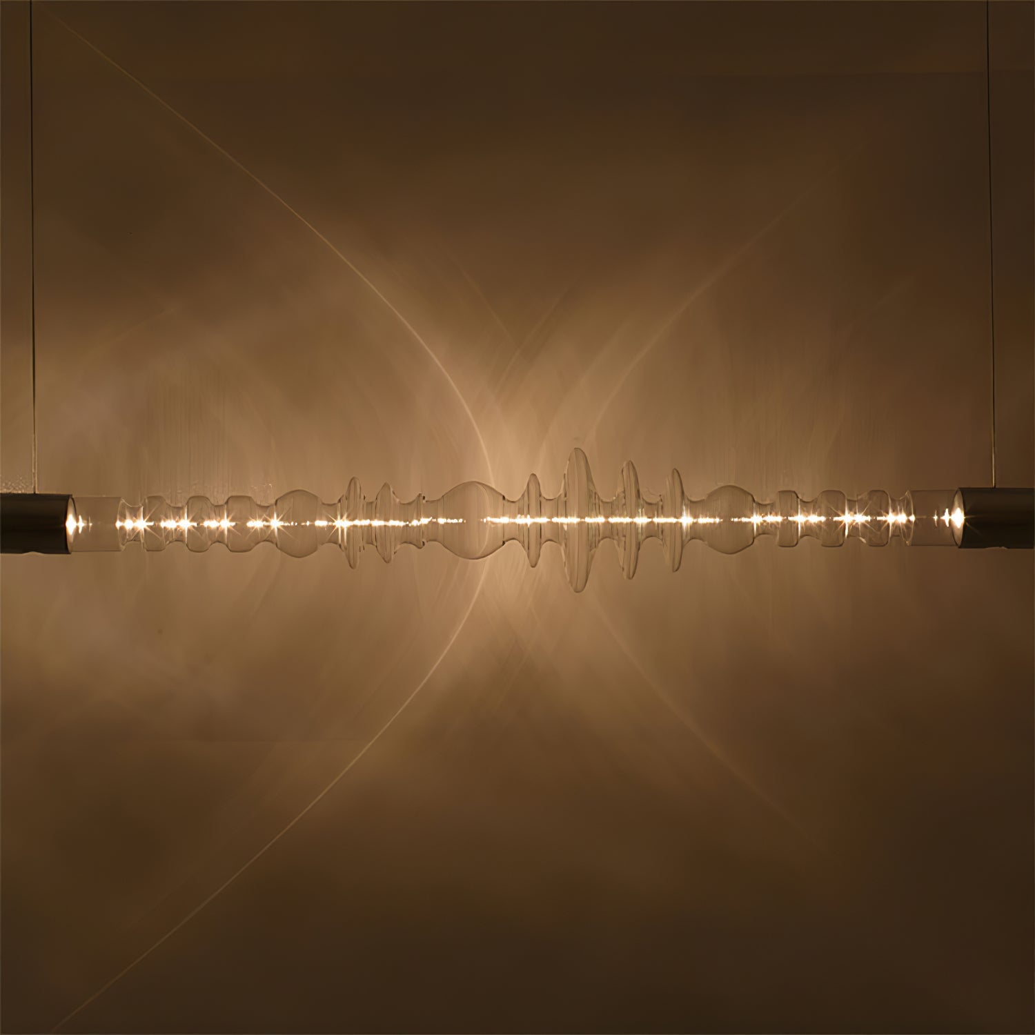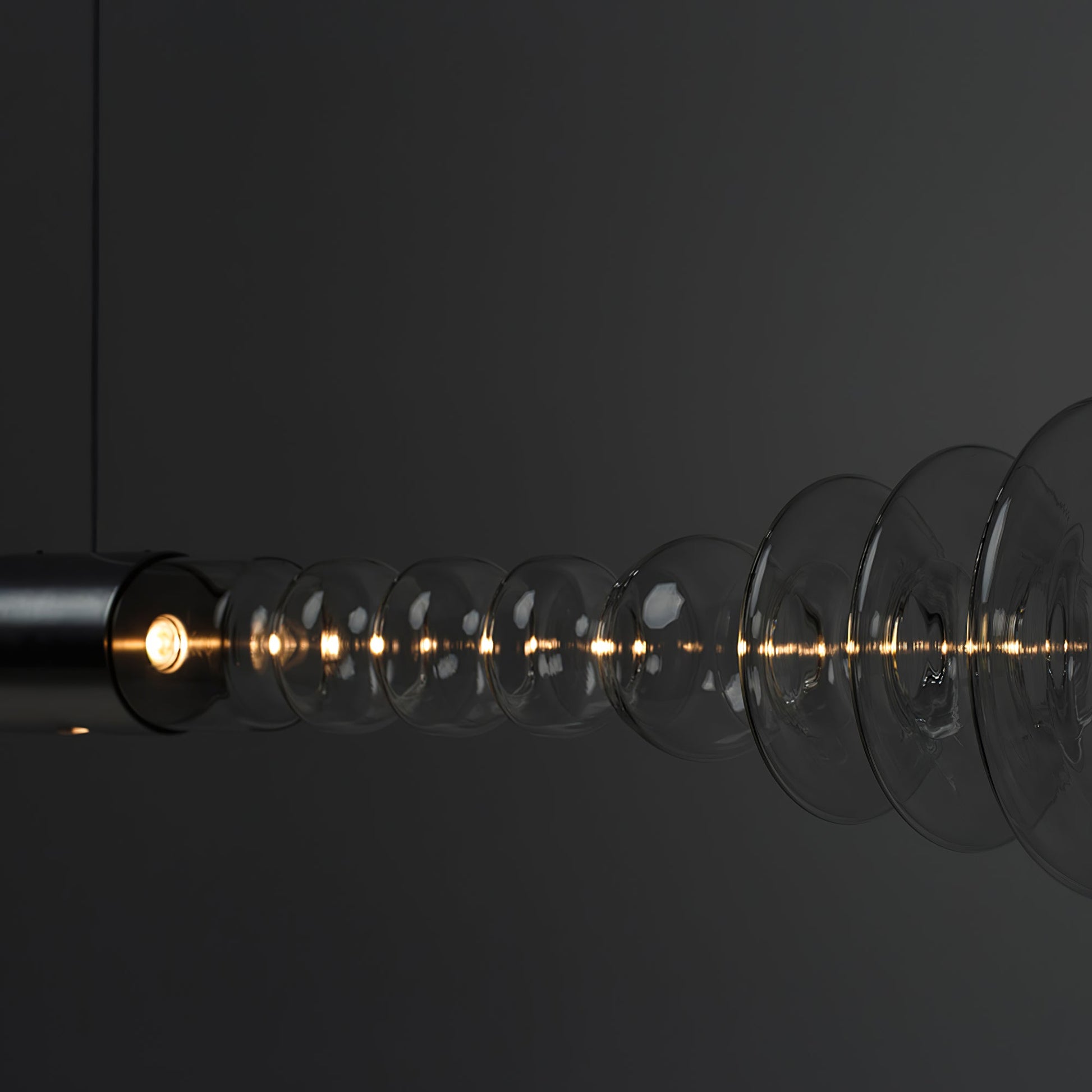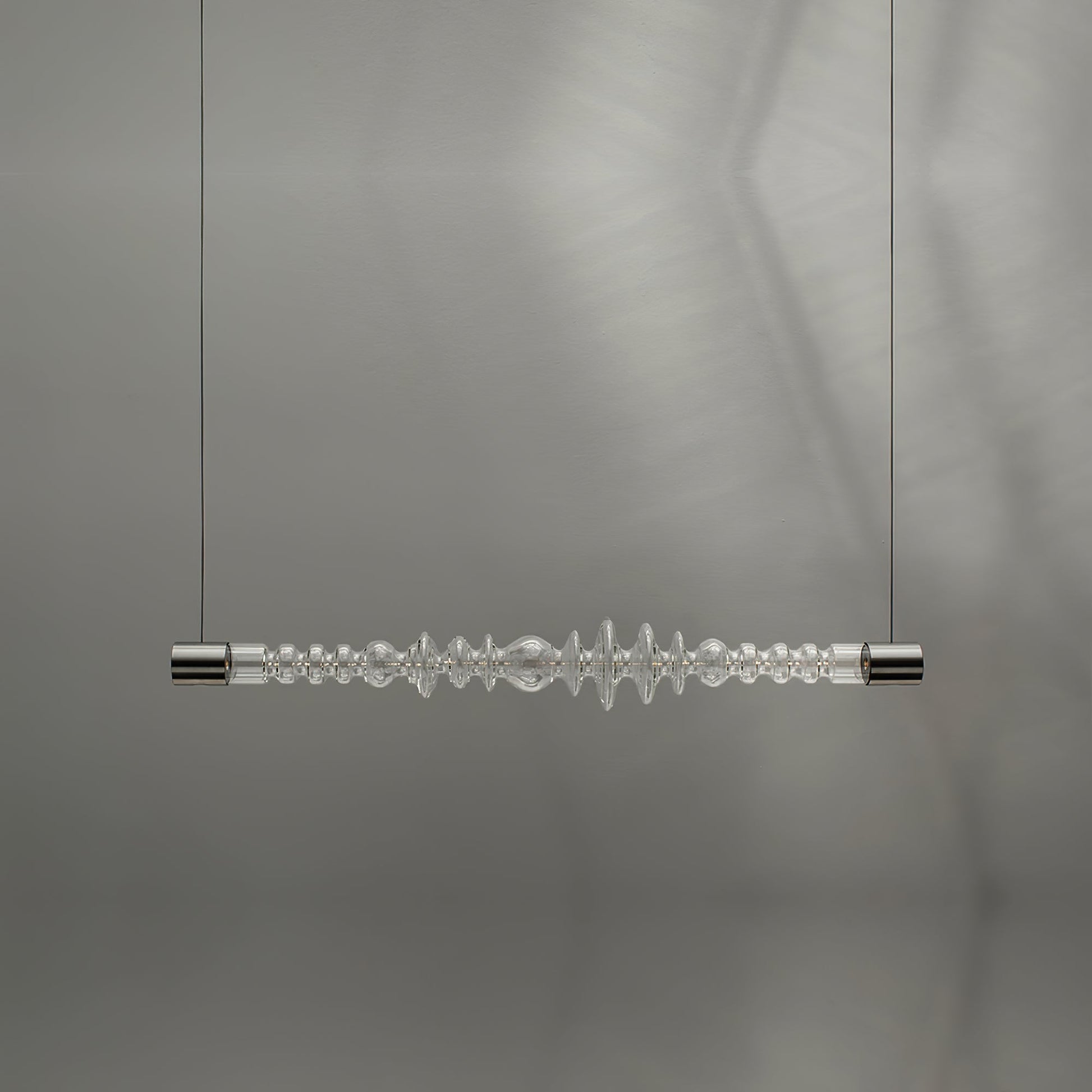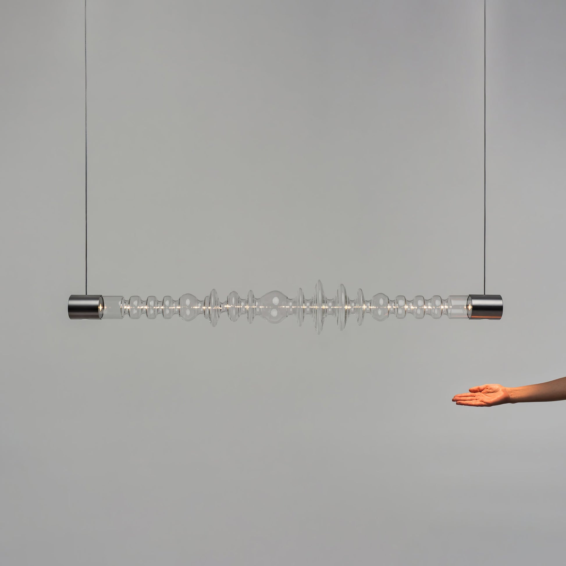 Filamento is a sculptural piece made of a single piece of glass more than one meter long. When illuminated, its form and matter disappear, giving way to a filament of light as a result of the study of its geometry. The propagation of particles called photons becomes a visible and linear form of energy. It serves as a study of how light travels through concave and convex glass. It can be used outdoor and indoors.