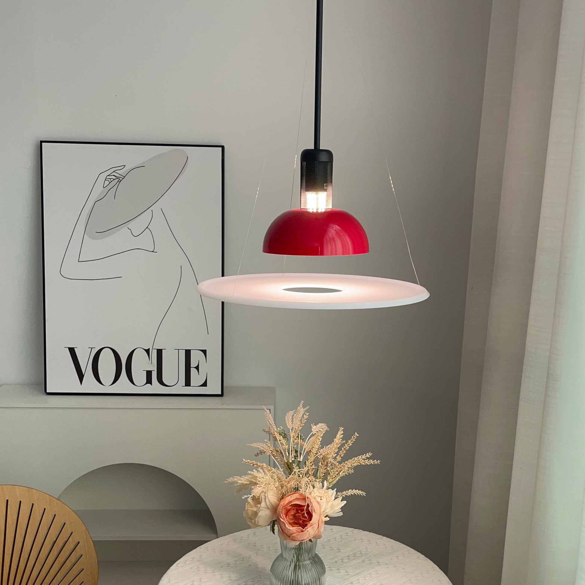 Suspension lamp providing direct, diffused and reflected light. Opaline polymethylmethacrylate (PMMA) injection-molded diffuser plate suspended by three fine steel cables. Polished, nickel-plated, and zapon-varnished stamped sheet metal reflector painted gloss-white inside. Black painted, injection-molded ABS ceiling fitting and rose.