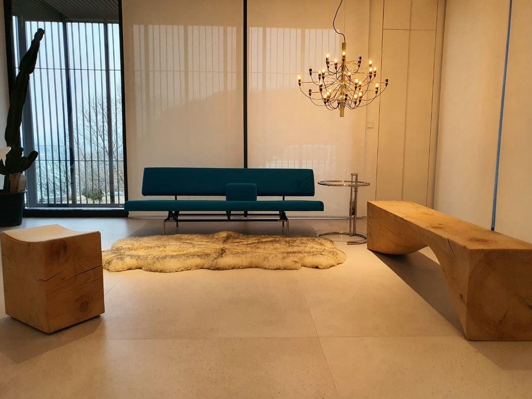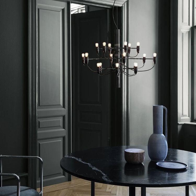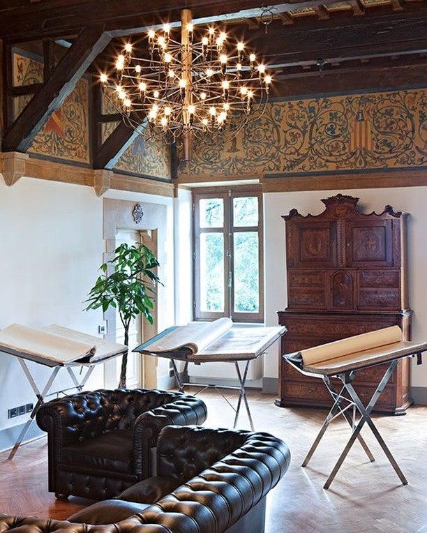 Since 1958, this iconic Gino Sarfatti design has served as an ultra-modern representation of the traditional mid-century chandelier. Every detail of this state-of-the-art ceiling light is exceptional, from the mirror-polish finish of its main steel structure to the way each bulb is fitted with its own horizontal arm and the graceful wiring meanders down the stem.