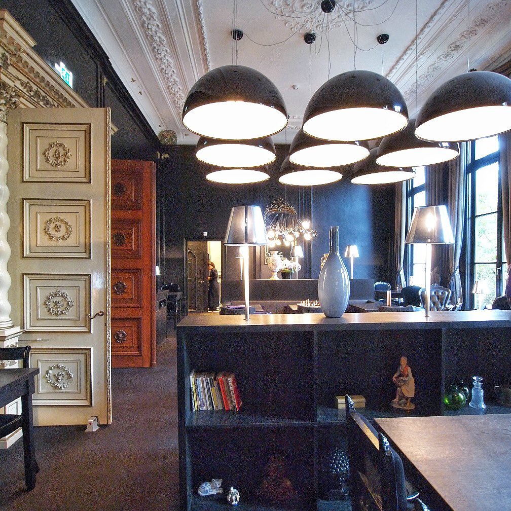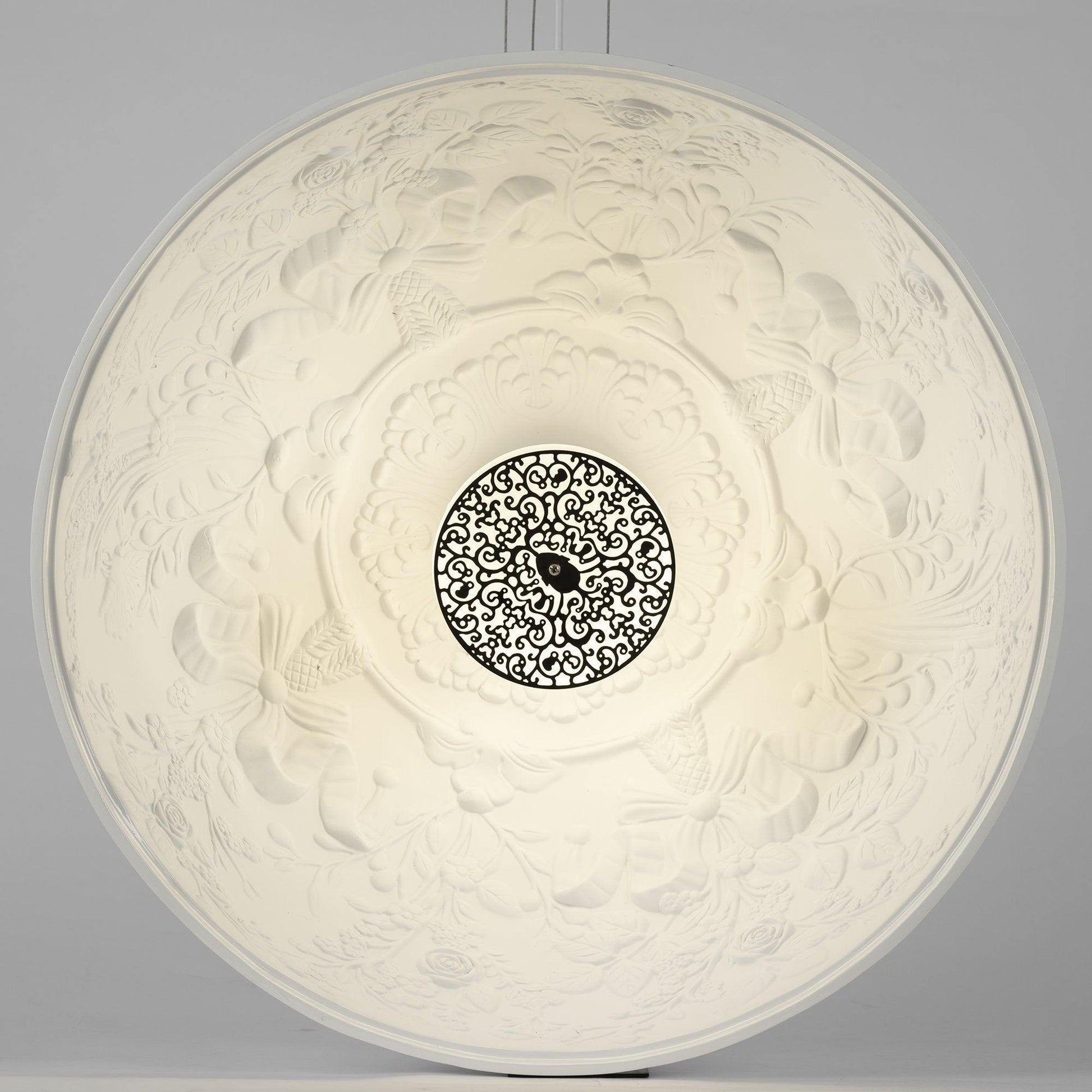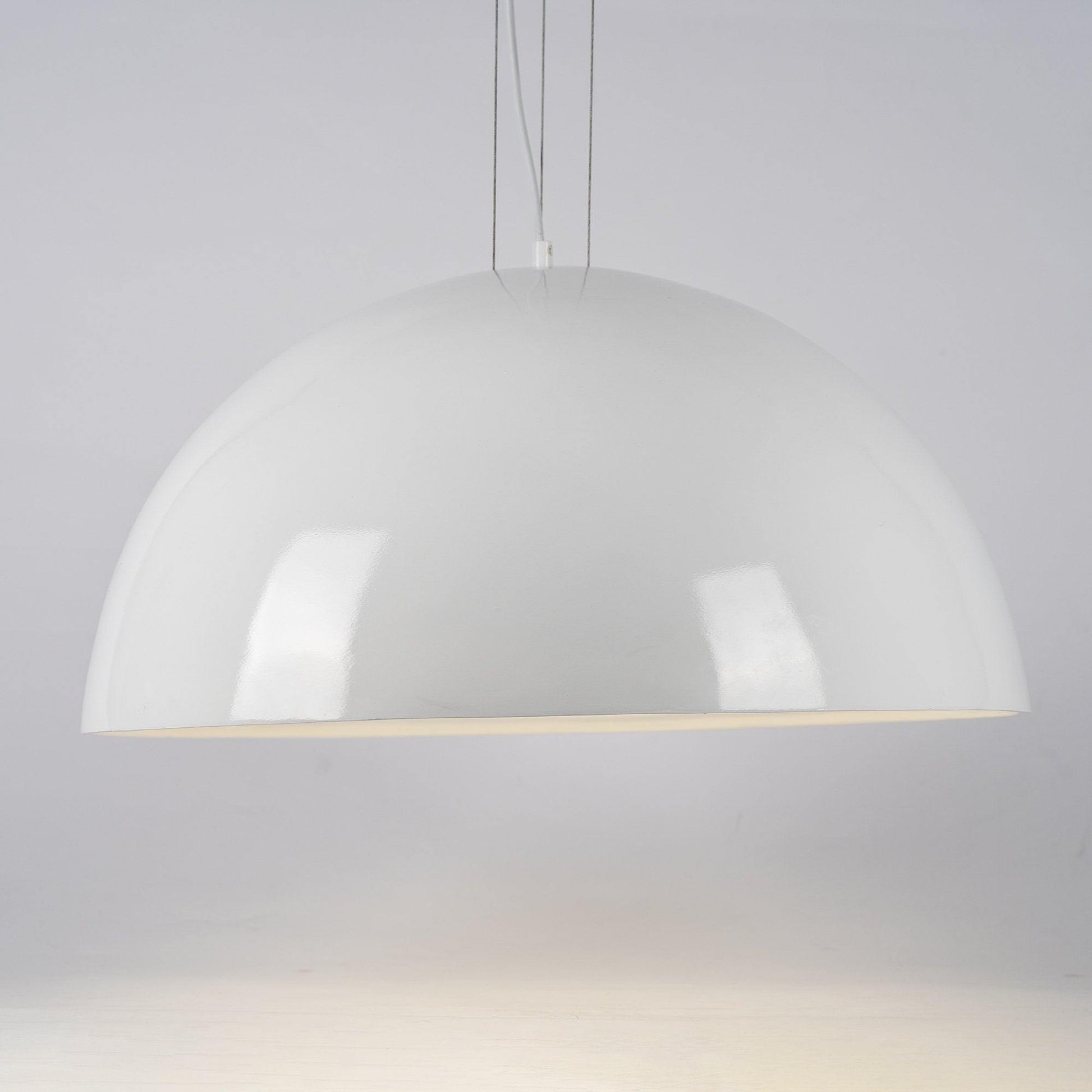 Suspension luminaire providing diffused lighting. Hemispherical, mechanically-processed cast plaster diffuser, painted white inside. Outer finish: rust, glossy black, glossy white or matte gold. Plaster diffuser support in die-cast aluminum alloy. Upper cable gland and blocking ring nut in black injection-molded PC. Shaped, adjustment screws.