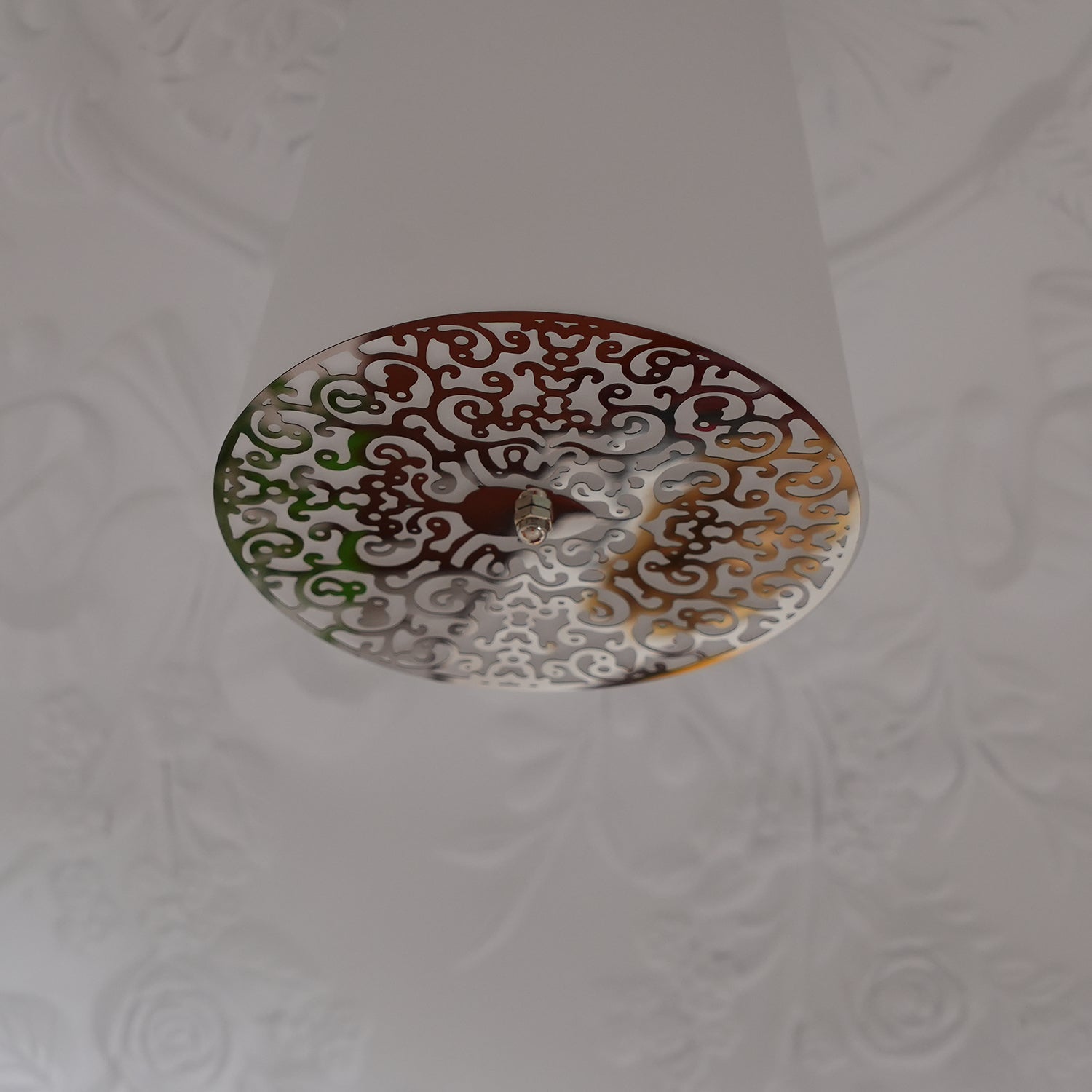 Transparent, injection-molded, upper and lower silicone shock absorbers. Lampholder and fixing support in PPS. Flashed and blown opal glass diffuser. Molded fixing ring nut in die-cast aluminum alloy with alodine plating. Frieze in photo-etched and mechanically drawn AISI metal. Molded and galvanized steel ceiling attachment.
