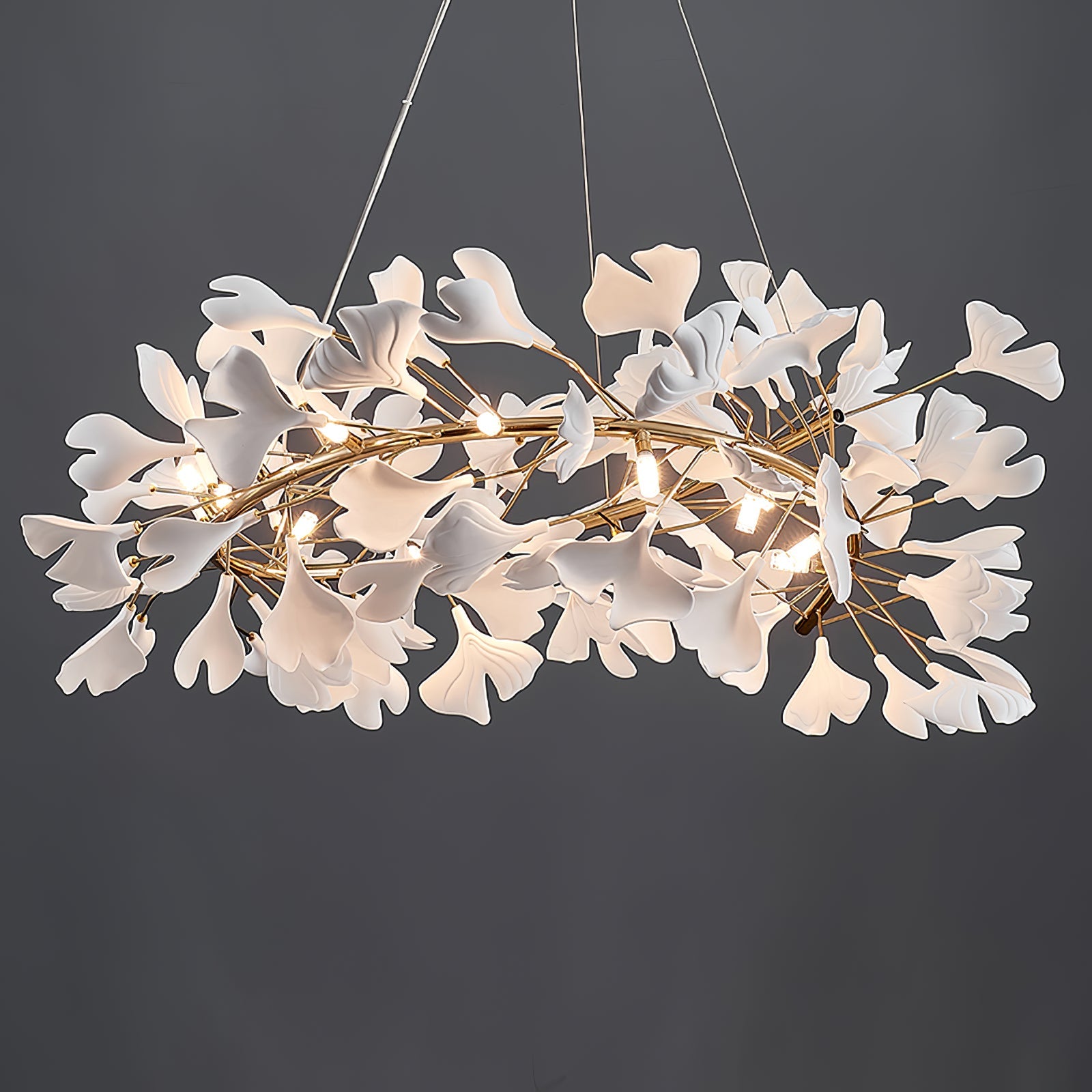 Its shape has a natural and organic flow the beautiful irregularity found in nature. Each of its porcelain leaves are individually handcrafted, then positioned to best capture and reflect the light, creating an atmosphere of extraordinary warmth.