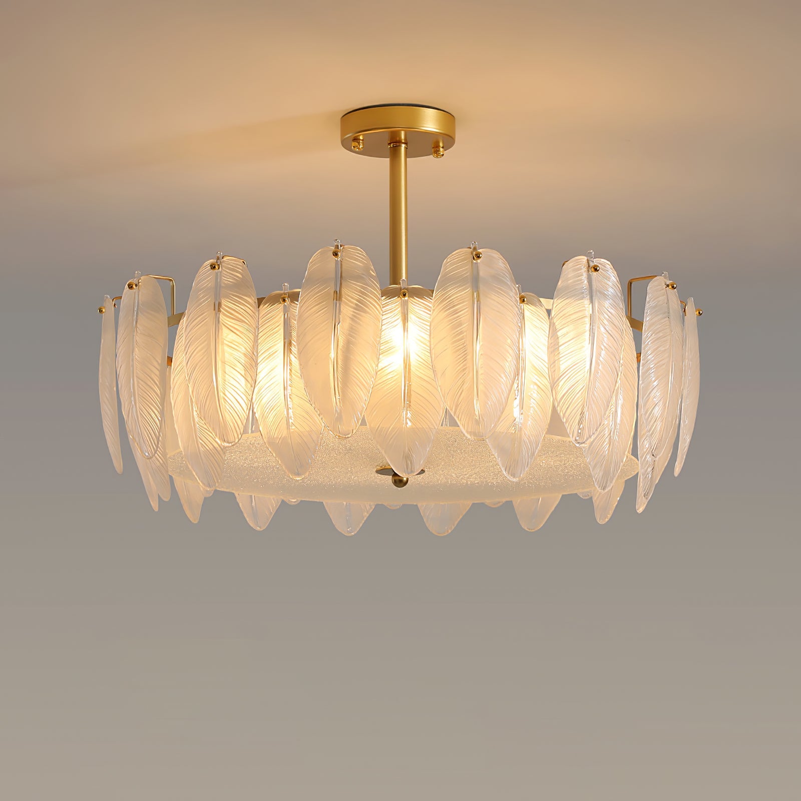 The combination of feather shape and wrought iron lines and circles reflect the full sense of three-dimensional richness. The lighting design has a sense of hierarchy and depth, and the glass lampshade with diamond texture is comfortable and not dazzling, creating a comfortable light environment.