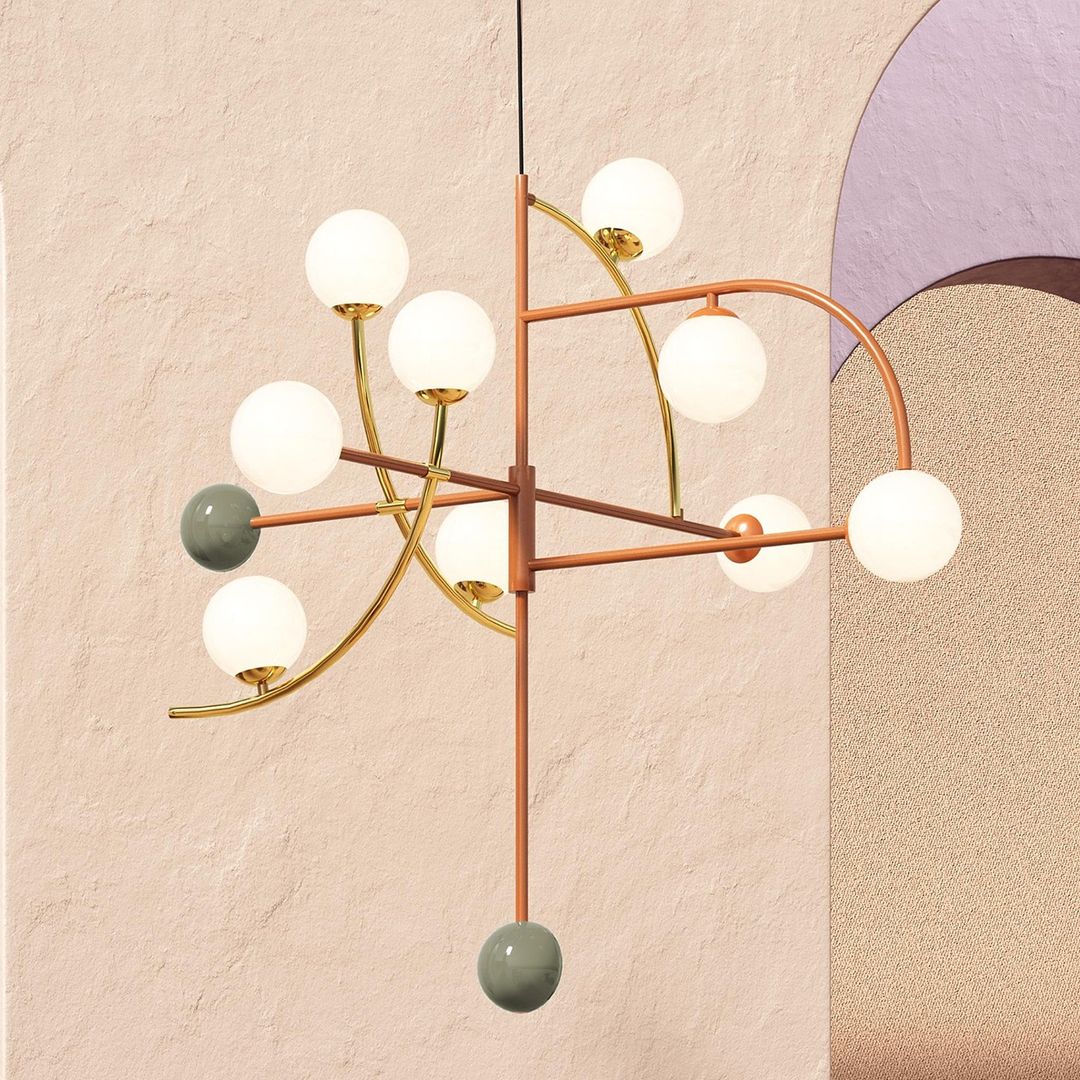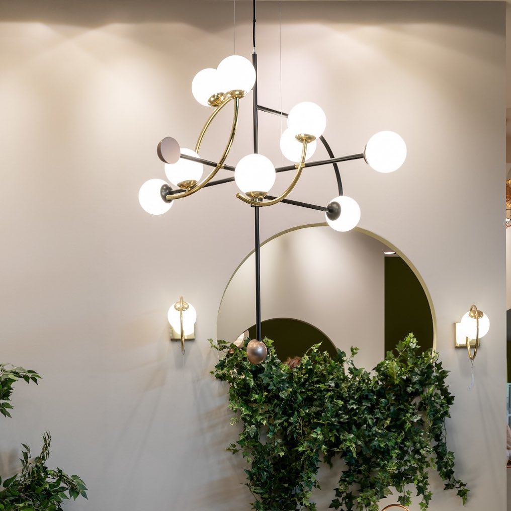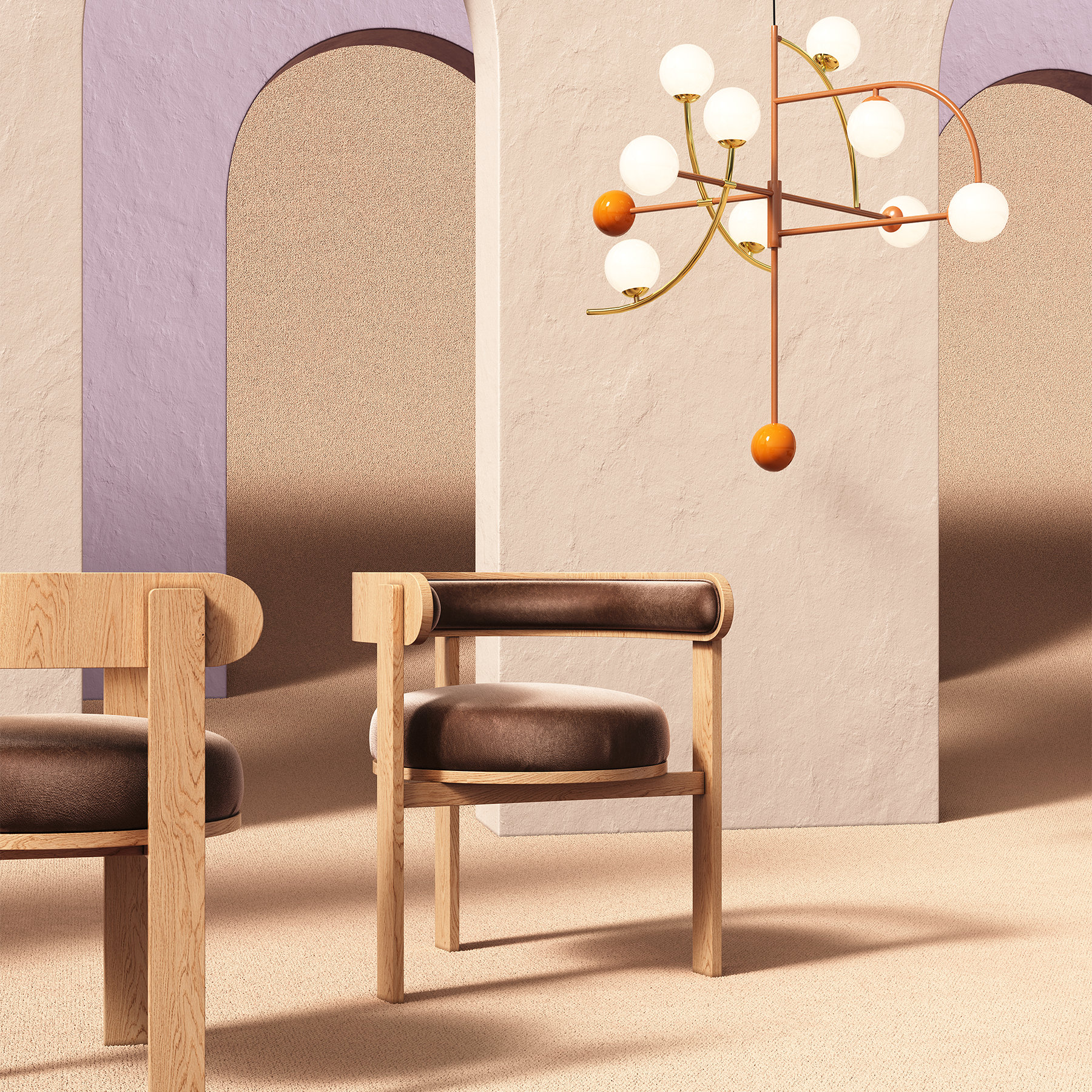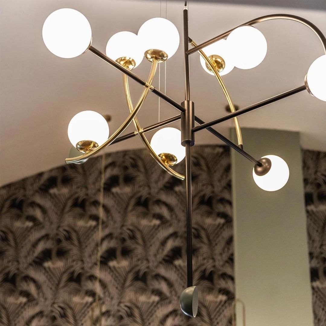 Helio is a playful and sculptural suspension light created . The light features glass spheres with lighting elements as well as decorative wooden half-spheres poised delicately on arc-shaped metal arms, resulting in an abstract shape that resembles a mobile sculpture. Helio is a spectacular statement light which works well in both residential and commercial spaces from living rooms and dining rooms to restaurants and reception areas.