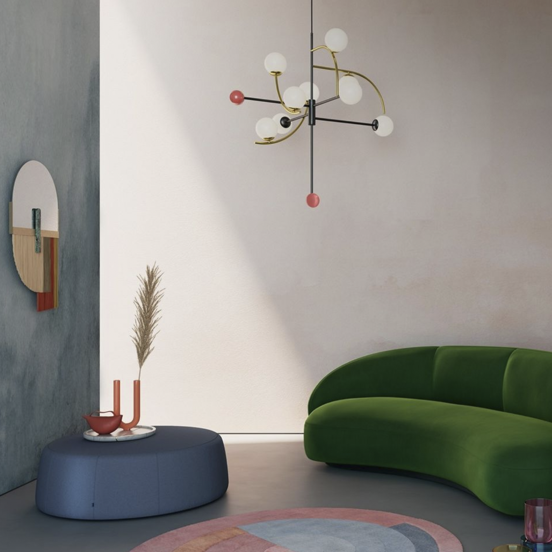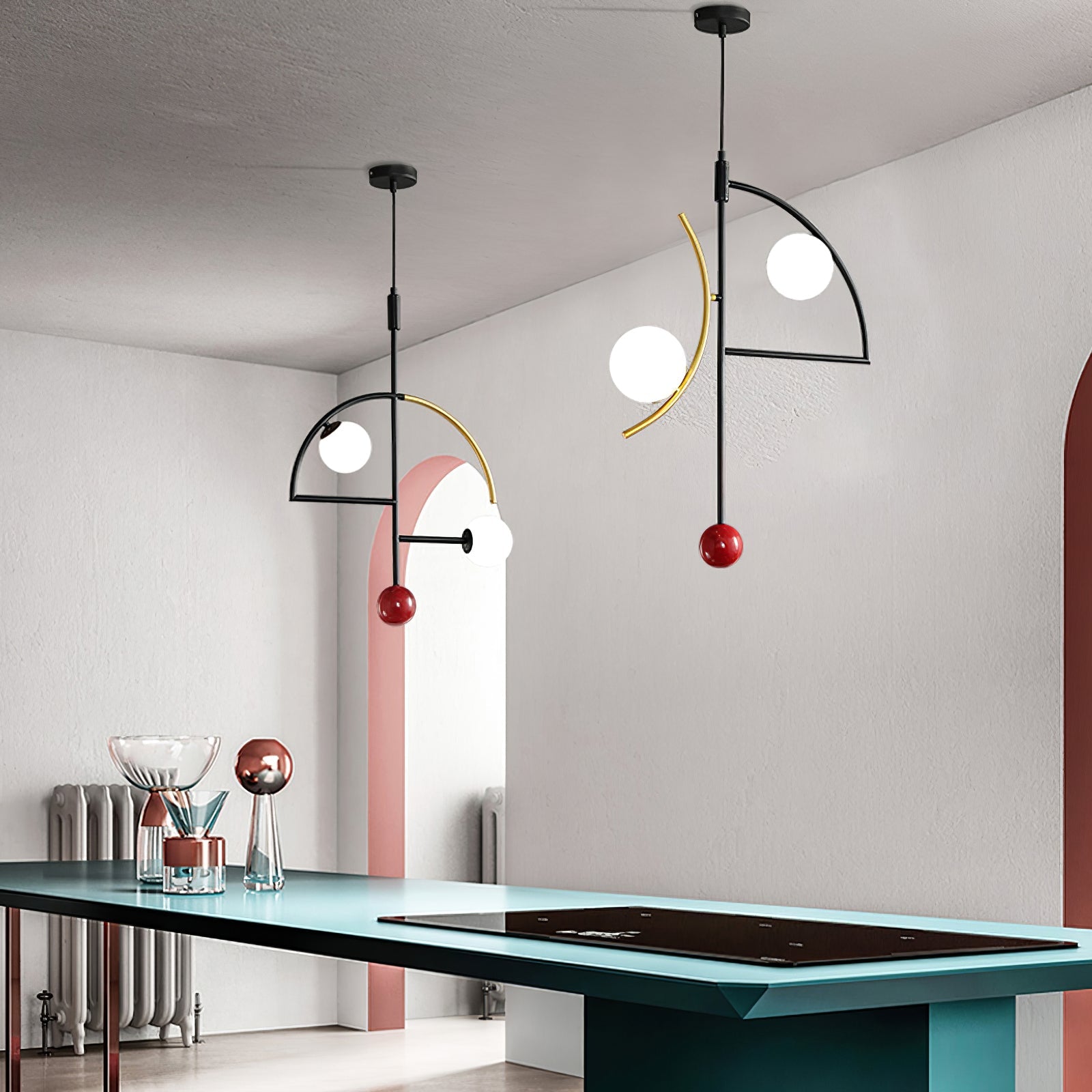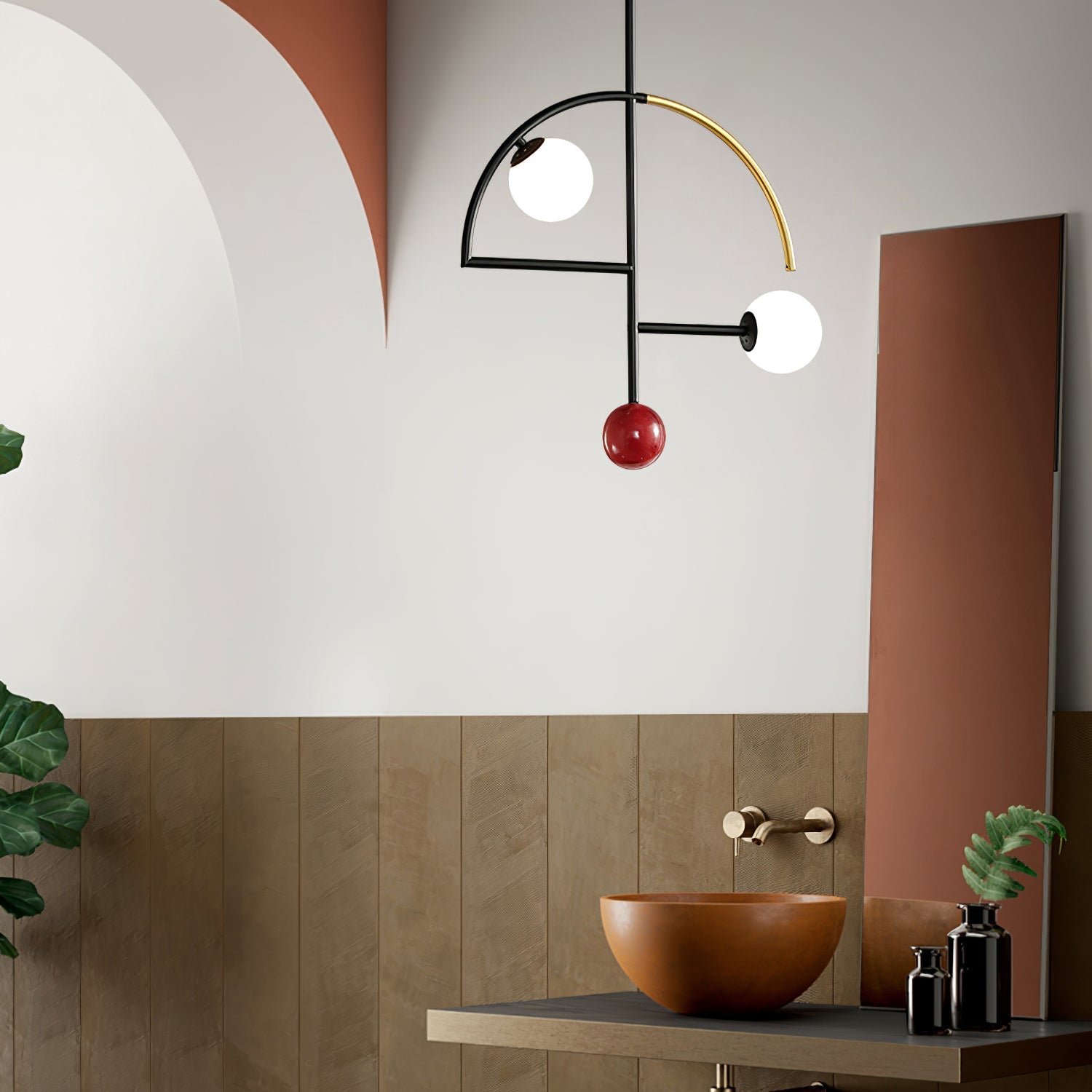 Helio is a playful and sculptural suspension light created . The light features glass spheres with lighting elements as well as decorative wooden half-spheres poised delicately on arc-shaped metal arms, resulting in an abstract shape that resembles a mobile sculpture. Helio is a spectacular statement light which works well in both residential and commercial spaces from living rooms and dining rooms to restaurants and reception areas.