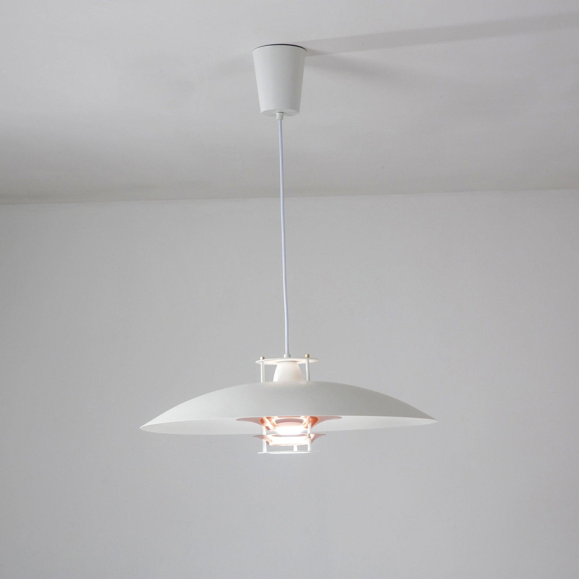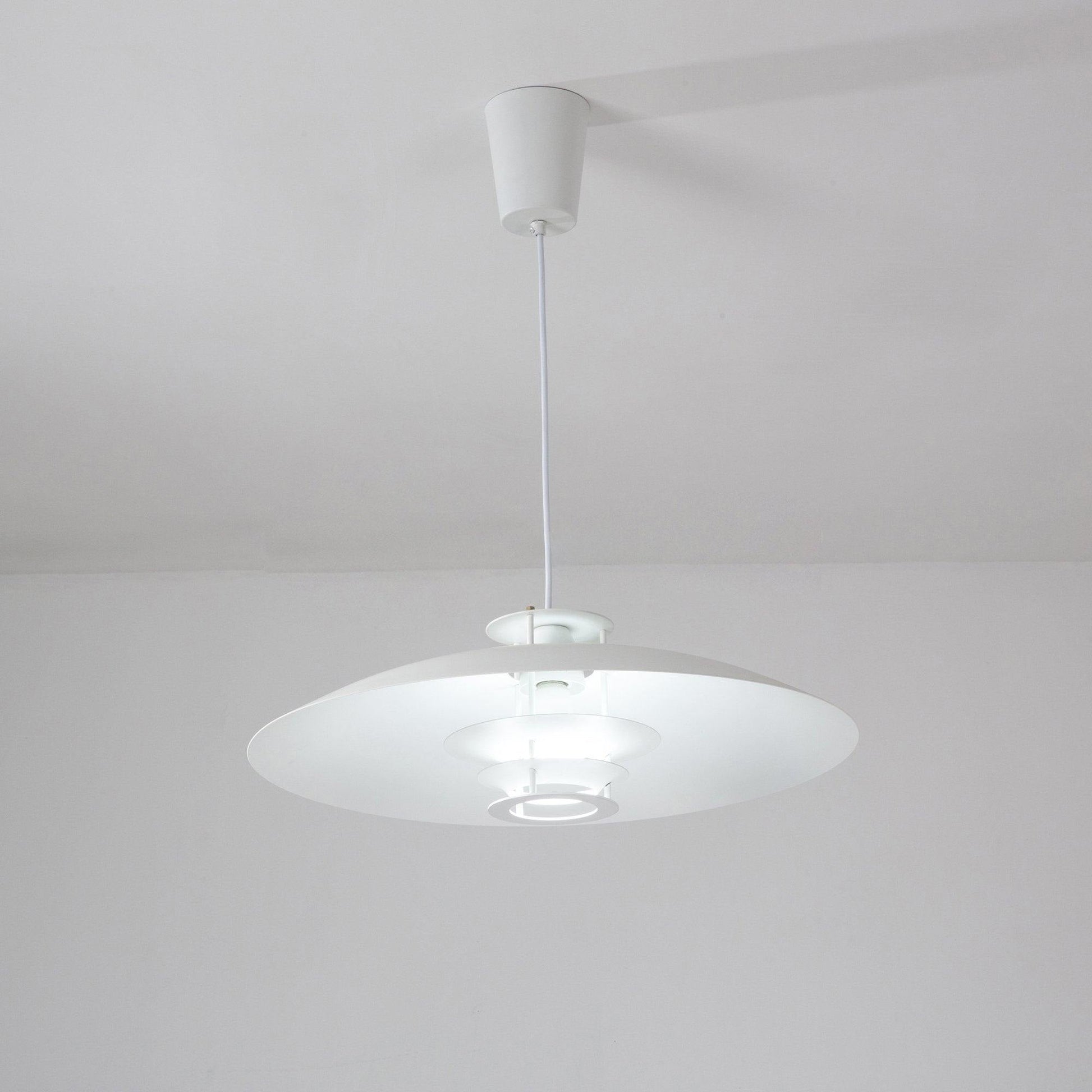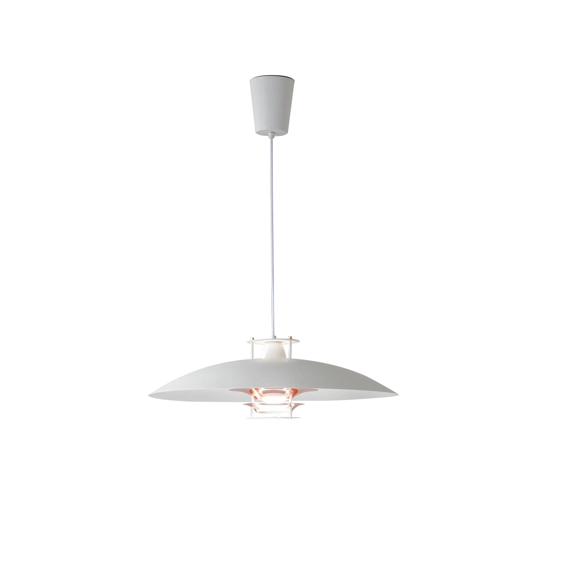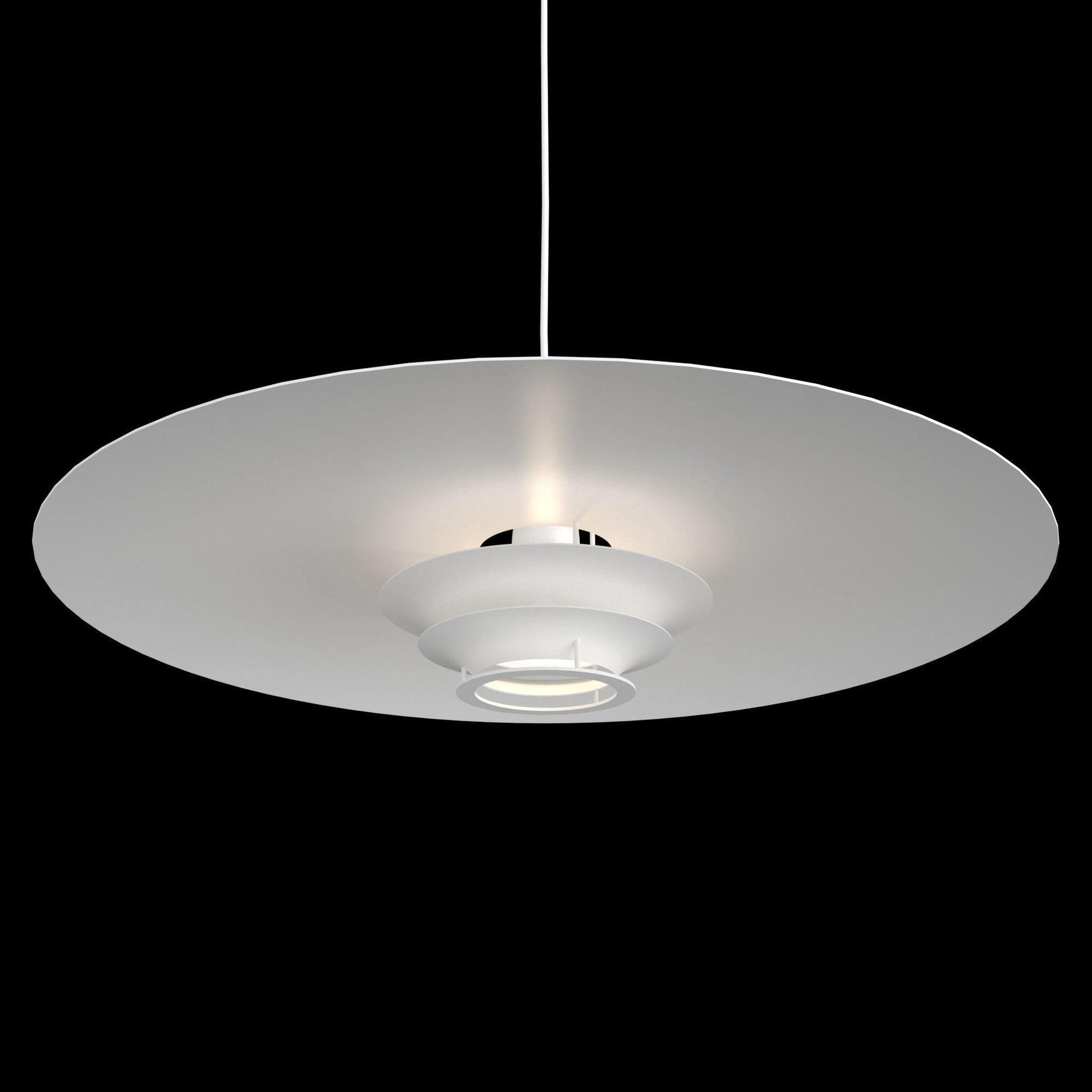 Finding beauty in simplicity, architect used lightweight white aluminum to create this generous ceiling light. The light hangs effortlessly from a single white cable, while its thin, disk-like shade illuminates with a bright glow, emitting a delicate and warm light.