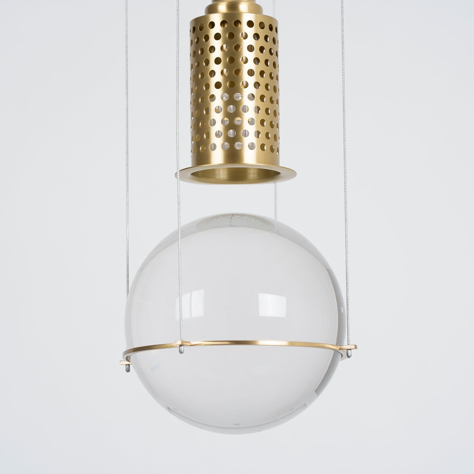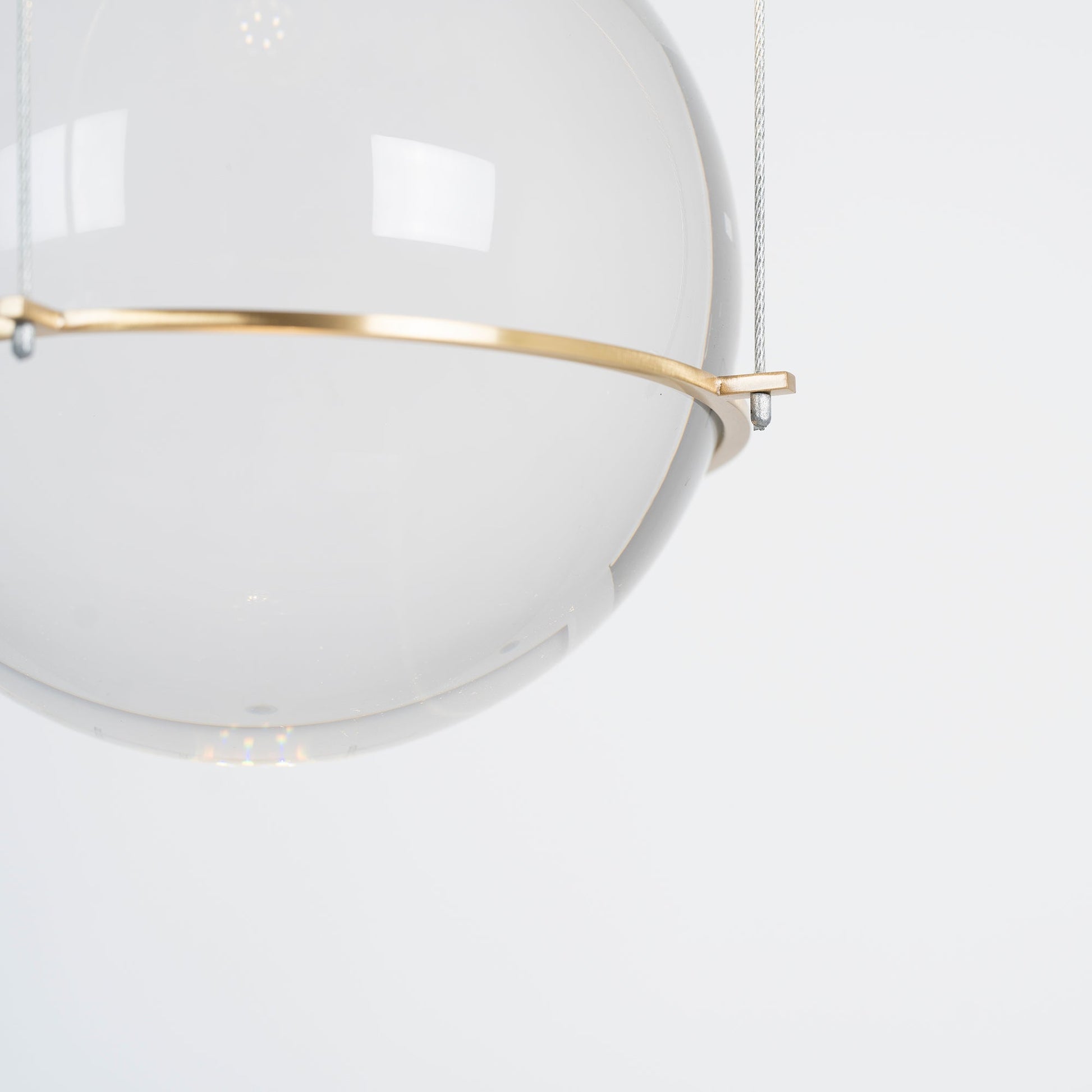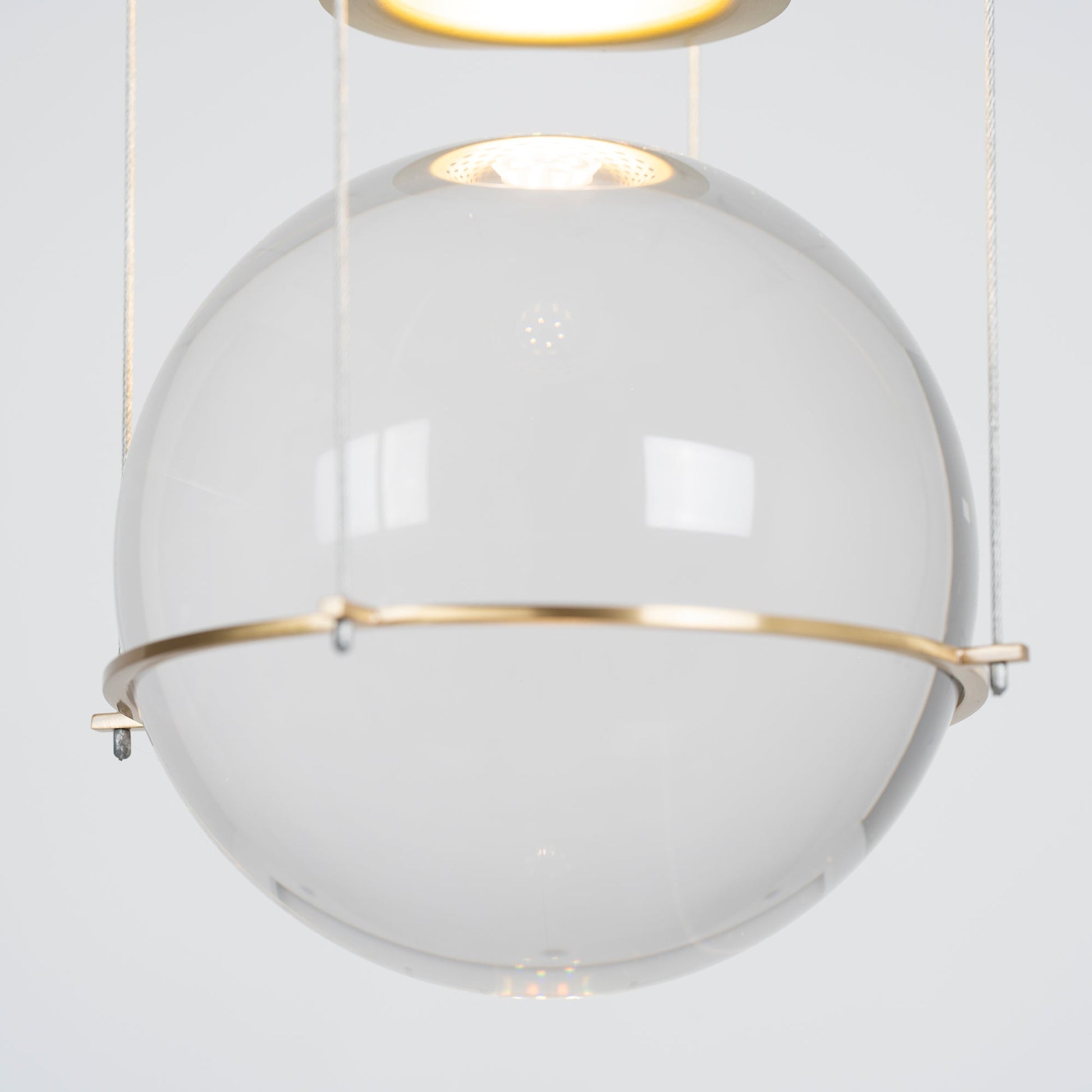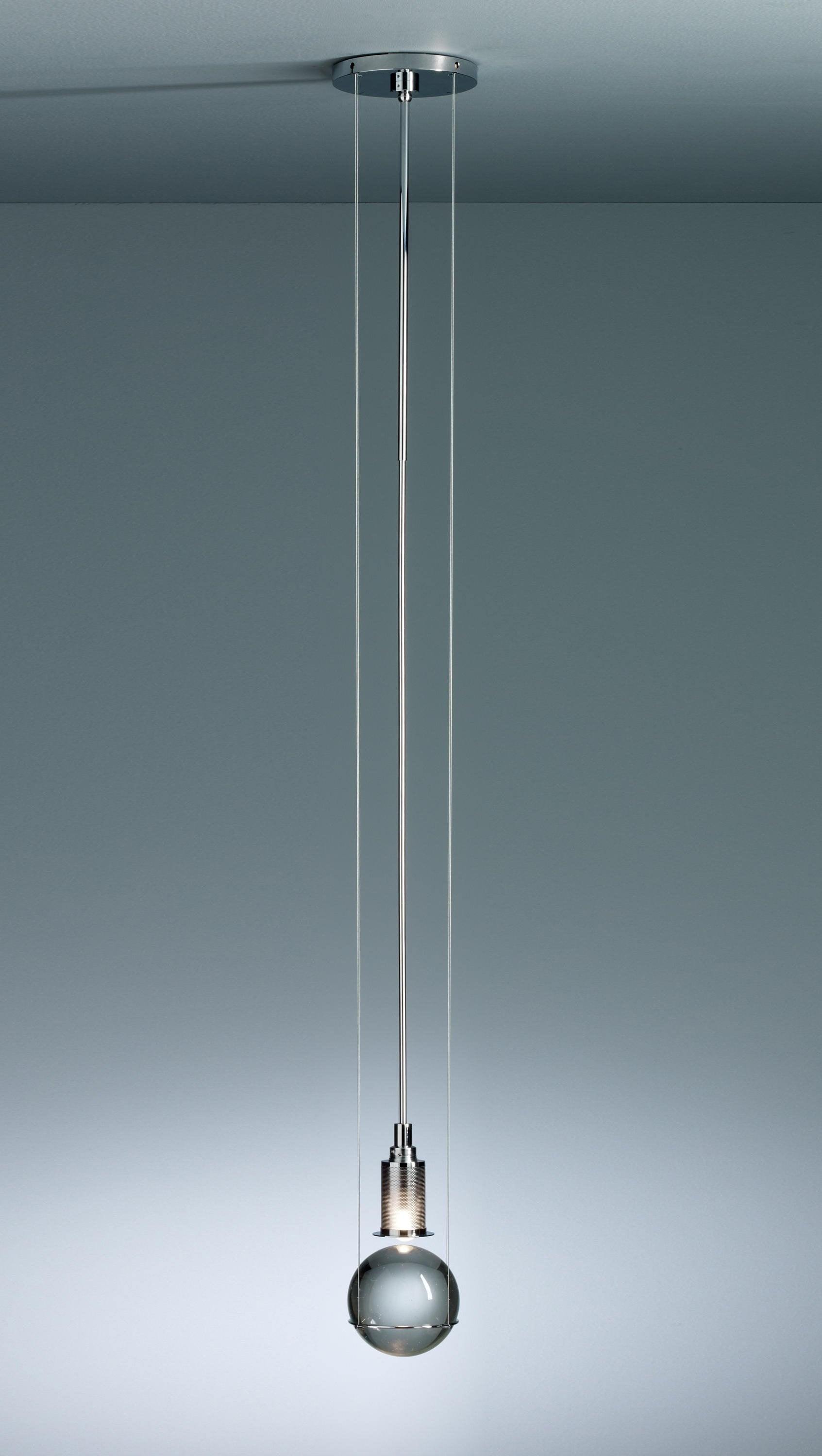 Originally developed in 1981 for the Hamburg restaurant "Le tre streghe" (The Three Witches), you can now bring the high-quality and elegant luminaire into your home. The solid, handmade glass globe is a special feature of the luminaire, which provides interesting lighting effects when switched on. The LED light source is located above the almost floating globe.
