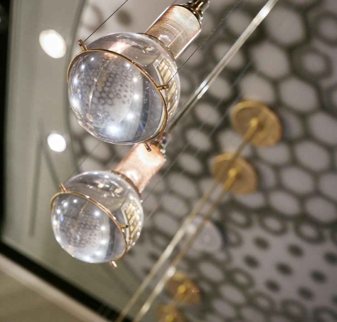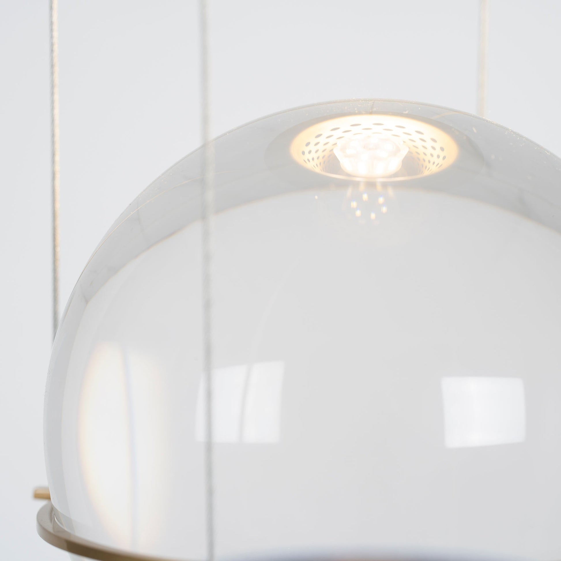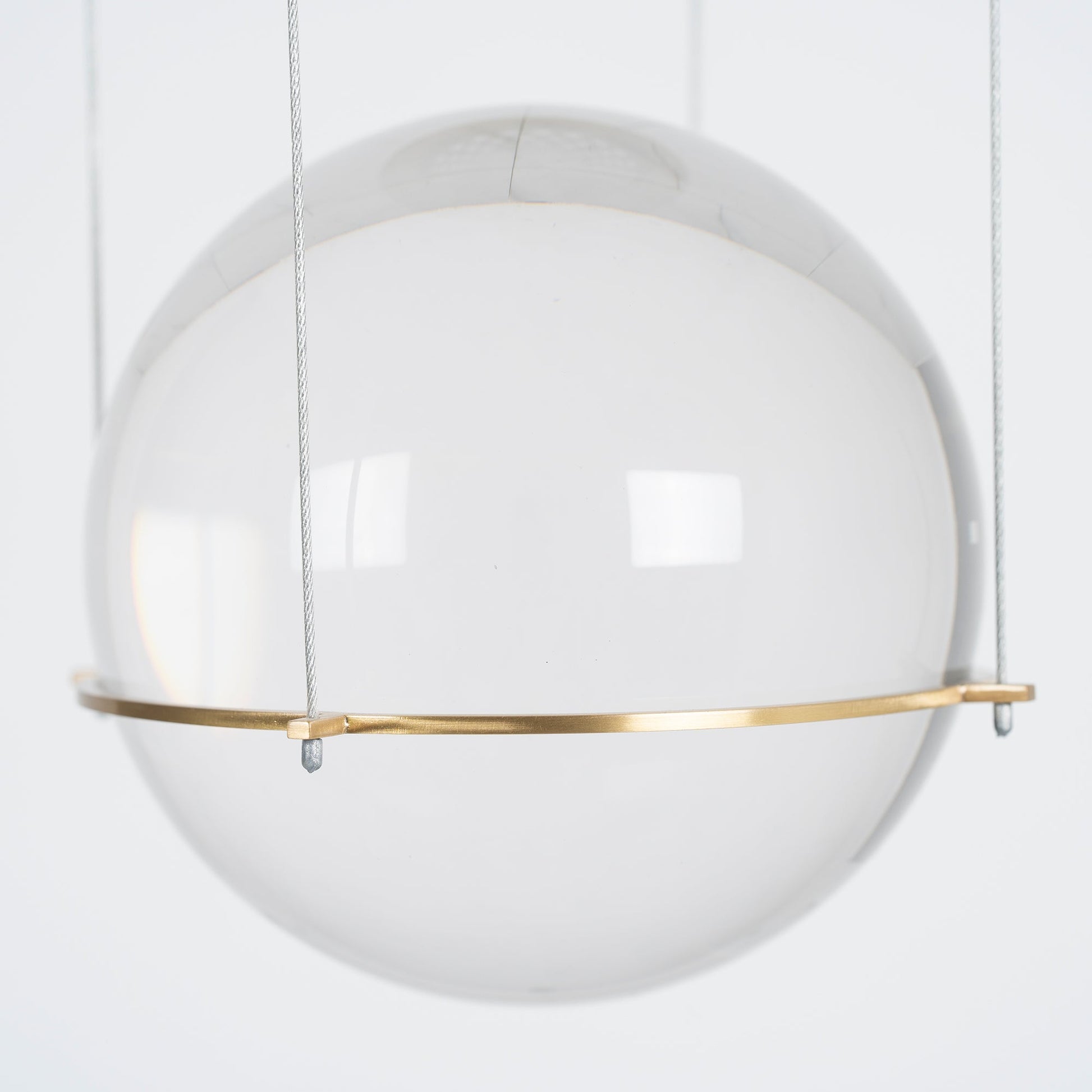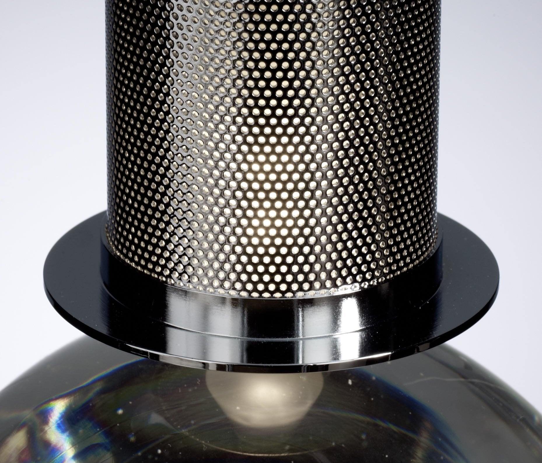 Originally developed in 1981 for the Hamburg restaurant "Le tre streghe" (The Three Witches), you can now bring the high-quality and elegant luminaire into your home. The solid, handmade glass globe is a special feature of the luminaire, which provides interesting lighting effects when switched on. The LED light source is located above the almost floating globe.
