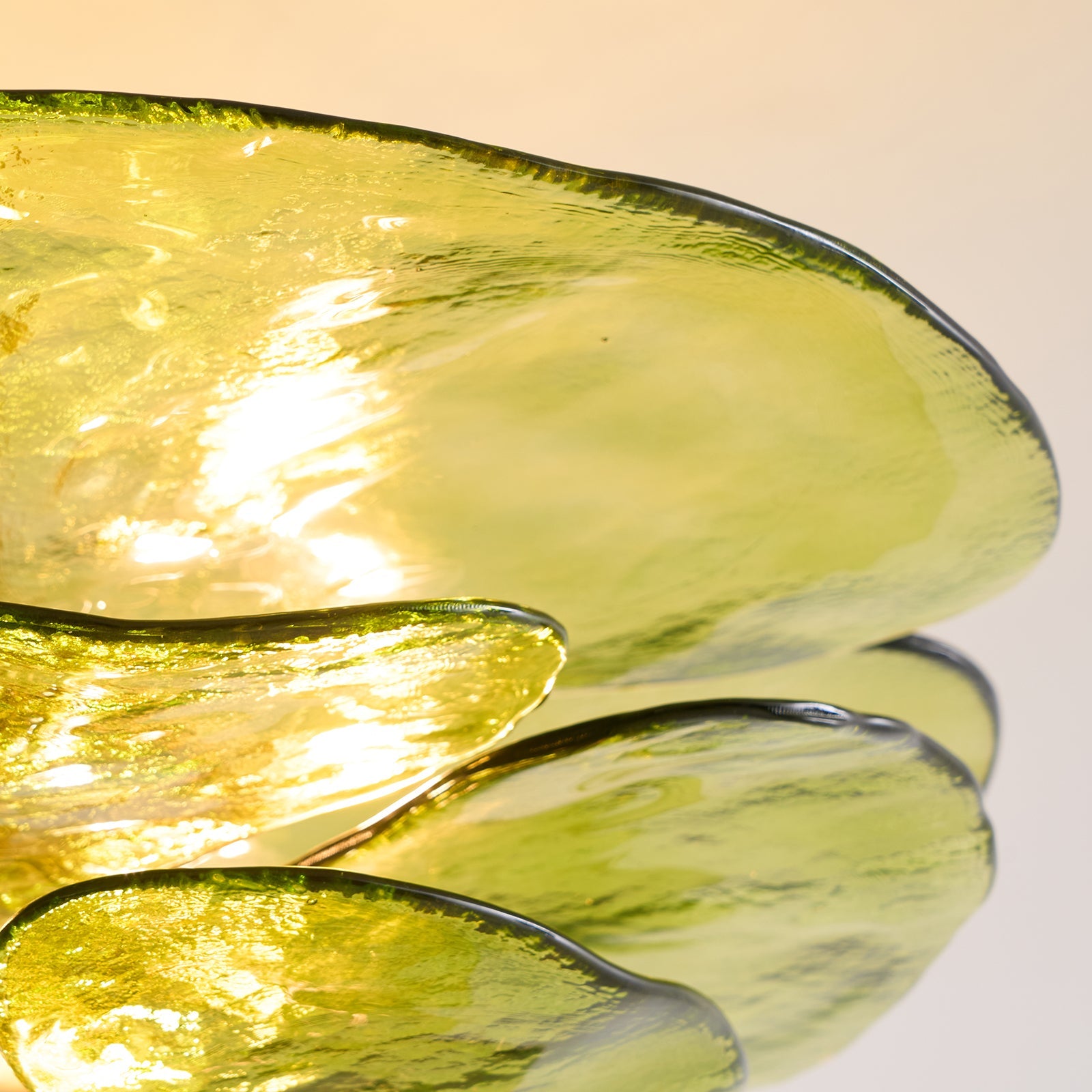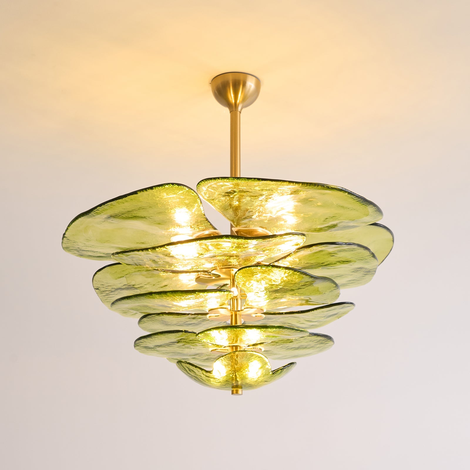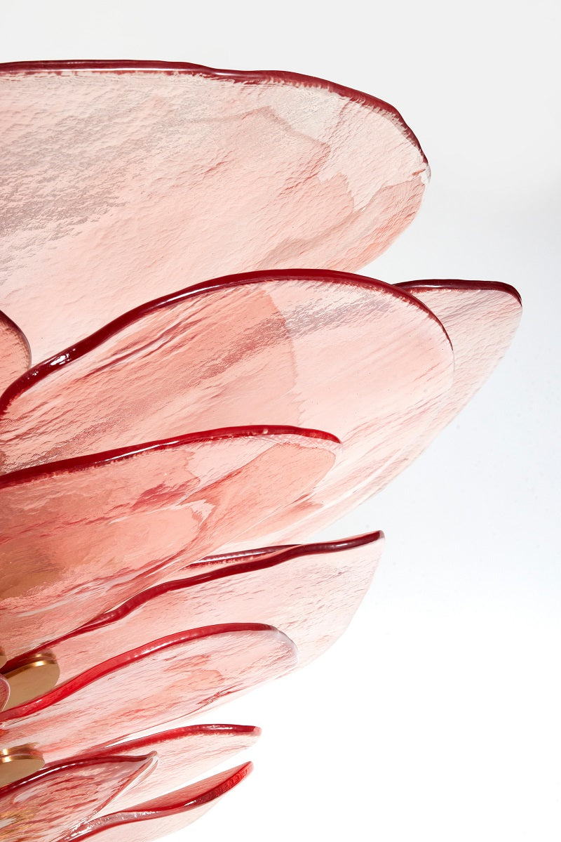 Exquisite chandelier composed of hand-molded glass petals mounted on a satin-brushed brass rod; water lily flower shape. Each tier of petals is individually illuminated, creating a diffused light.