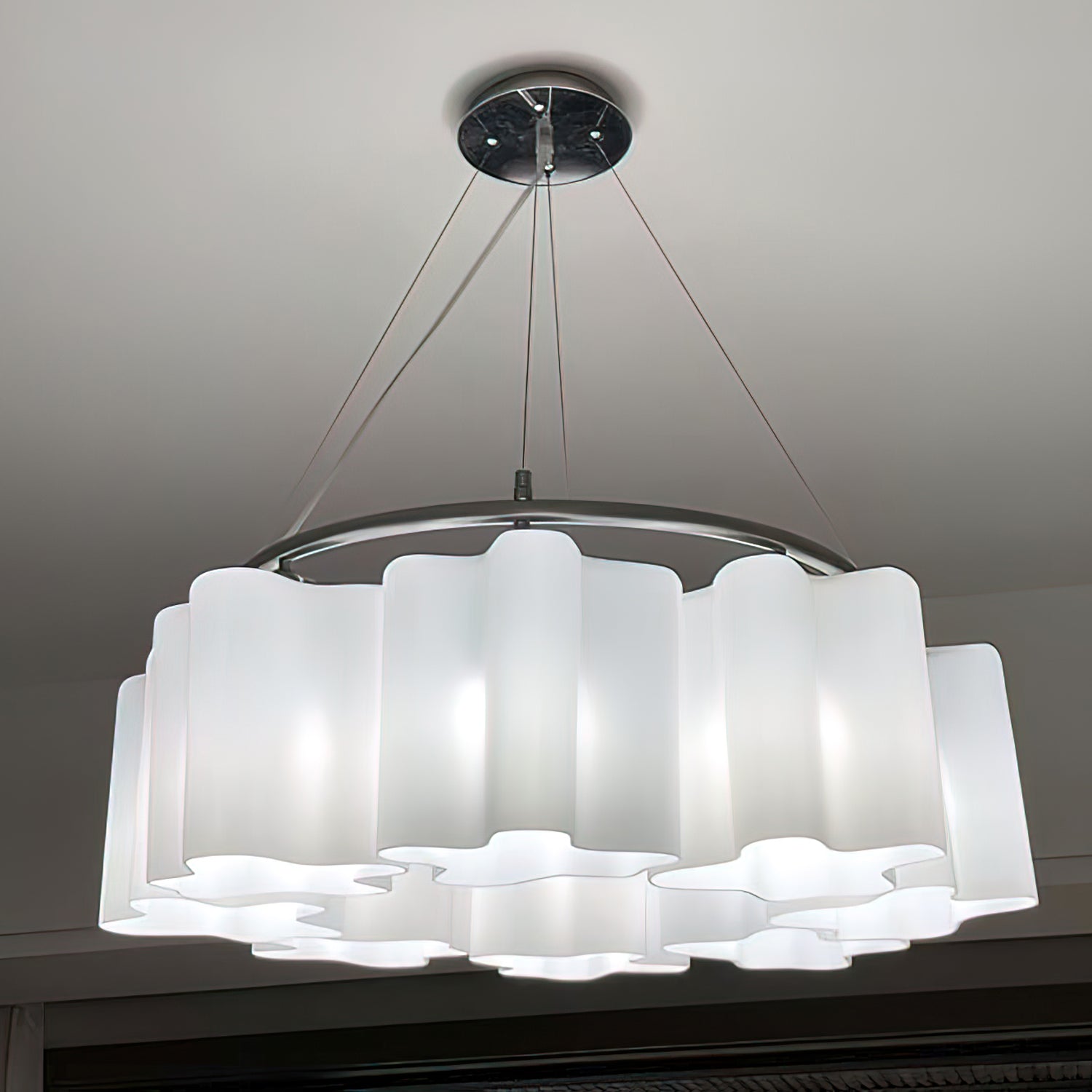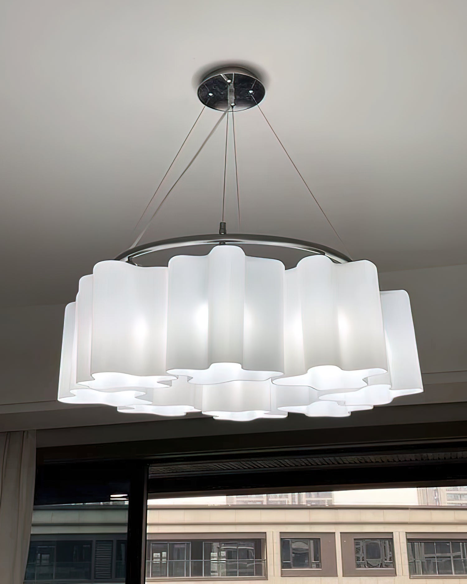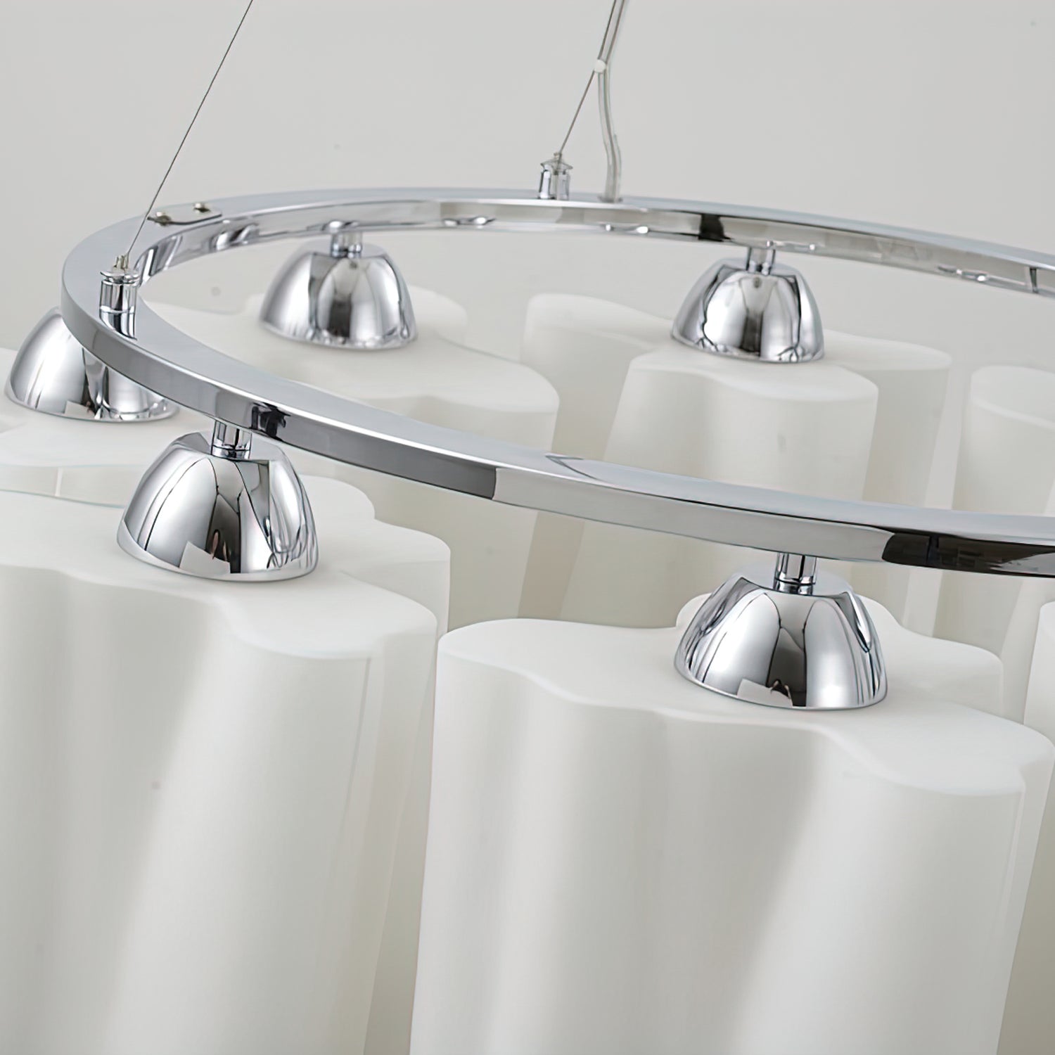 The Marjorie Chandelier combines a sleek chrome-plated metal frame with a frosted white glass shade, delivering both durability and refined style. Its distinctive design serves as a centerpiece, enhancing any room with a sophisticated, modern elegance while providing soft, ambient lighting that elevates the overall atmosphere.