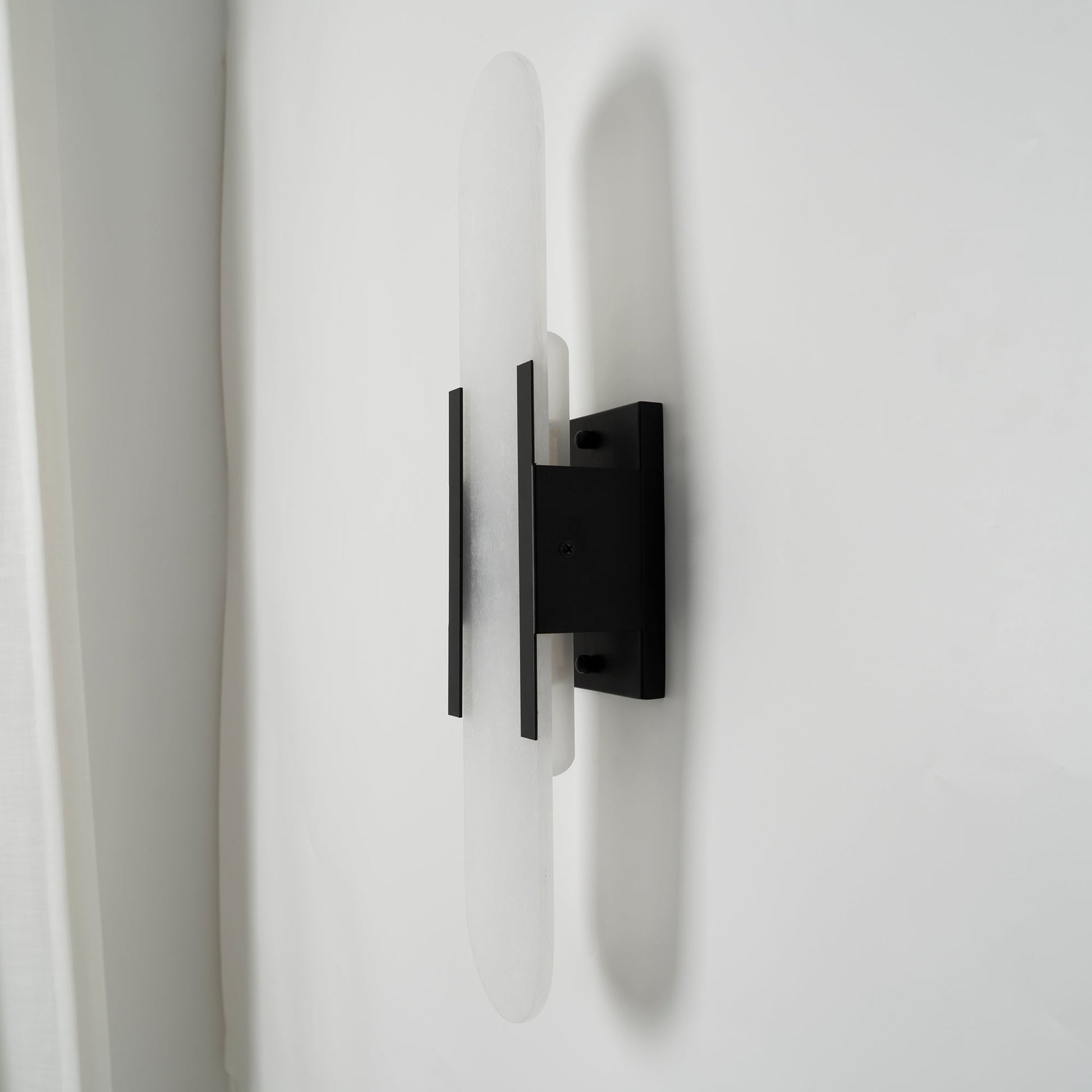 Effortlessly pairing natural alabaster and sleek metal detailing in a streamlined geometric form, the Melange Elongated Sconce exudes a modern refinement while emphasizing the beauty of natural stone. This sconce features hand-carved natural alabaster with either Brass detailing.