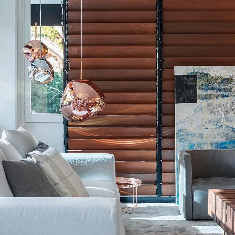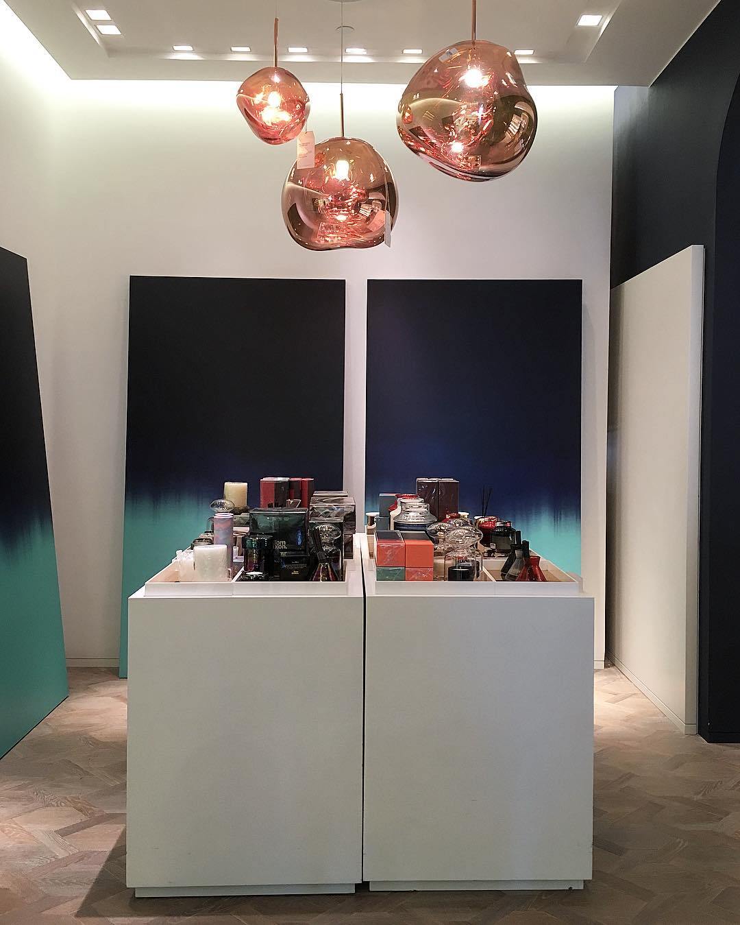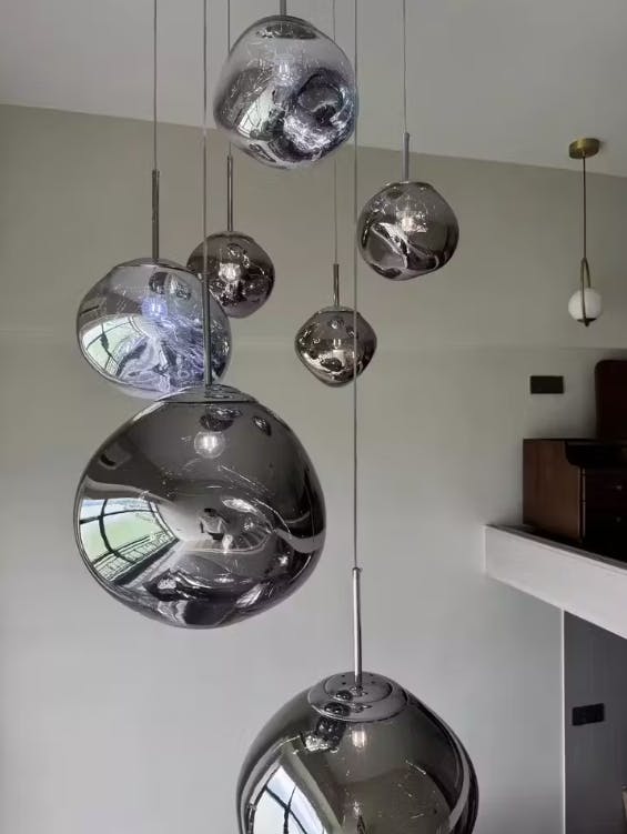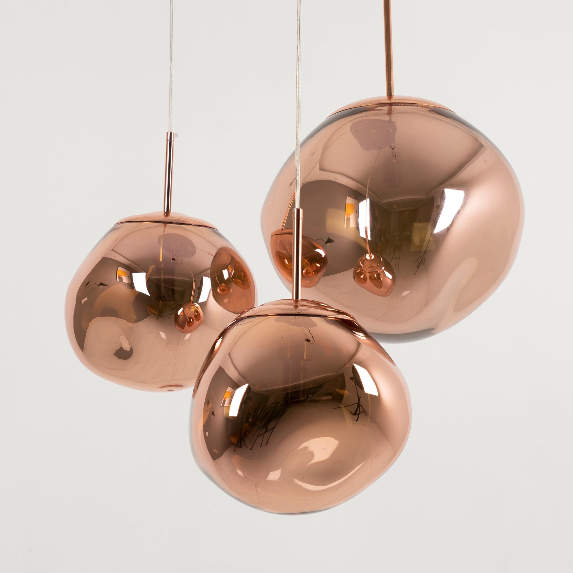 Melt Pendant Light is a beautifully distorted pendant in a modern Copper finish and matching ceiling rose. Emitting an attractive, mildly hallucinogenic light, this ceiling light creates a mesmerizing melting hot-blown glass effect when on and a mirror-finish effect when off. it emits an attractive, mildly hallucinogenic light. Melt floor lamps are available in copper, chrome and gold.