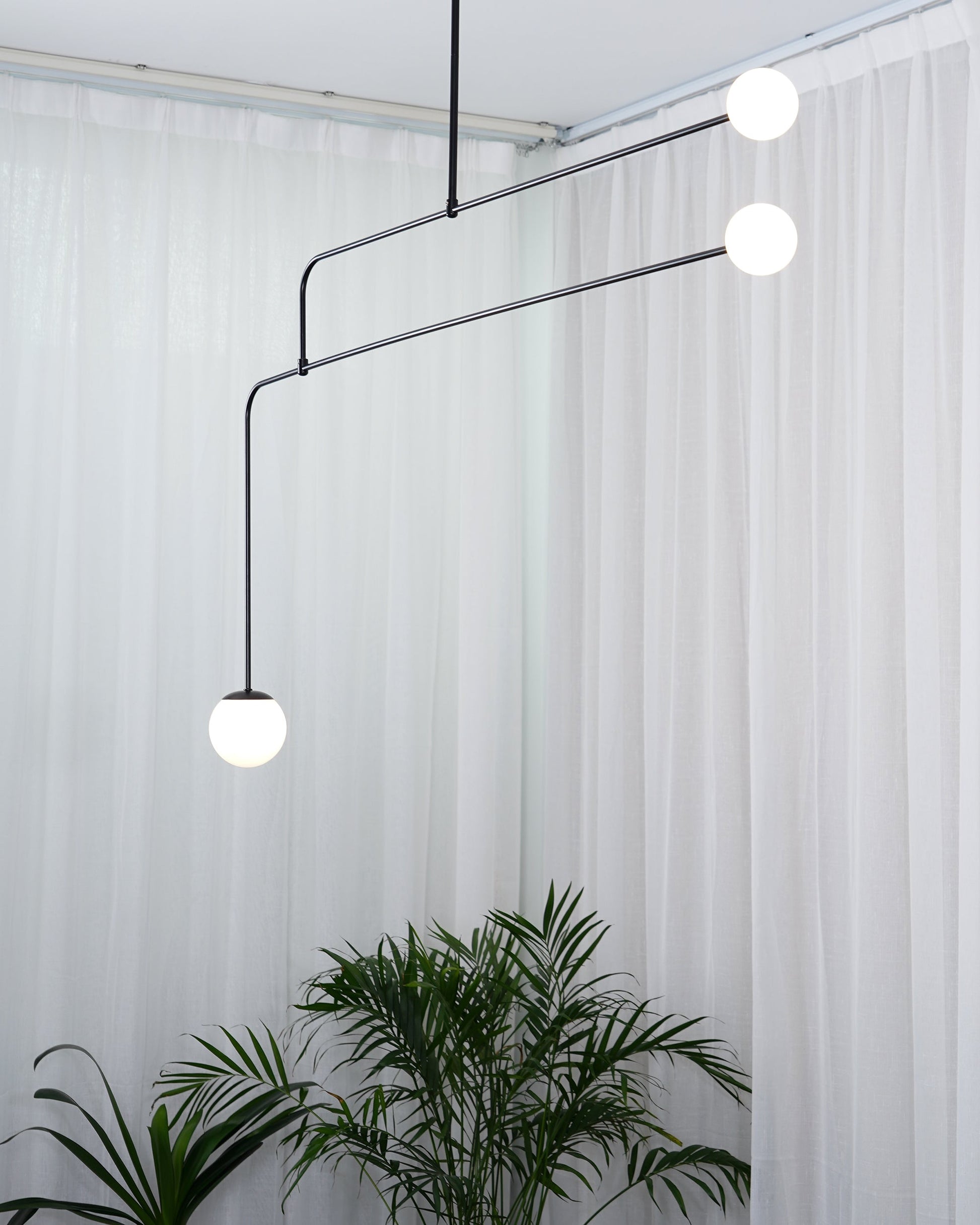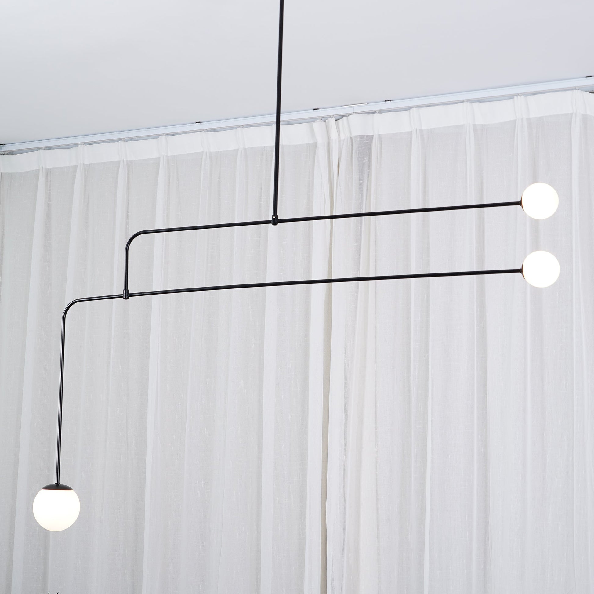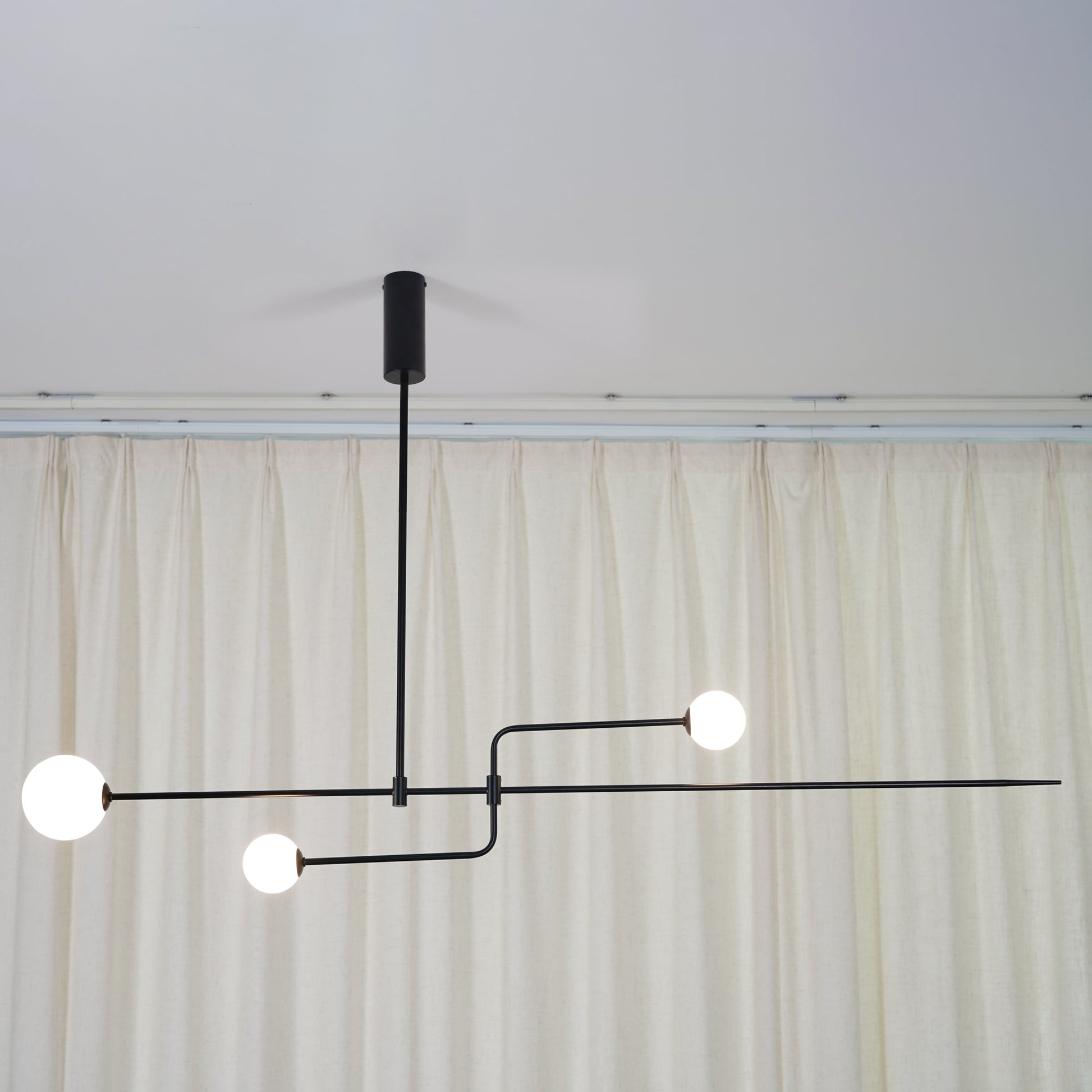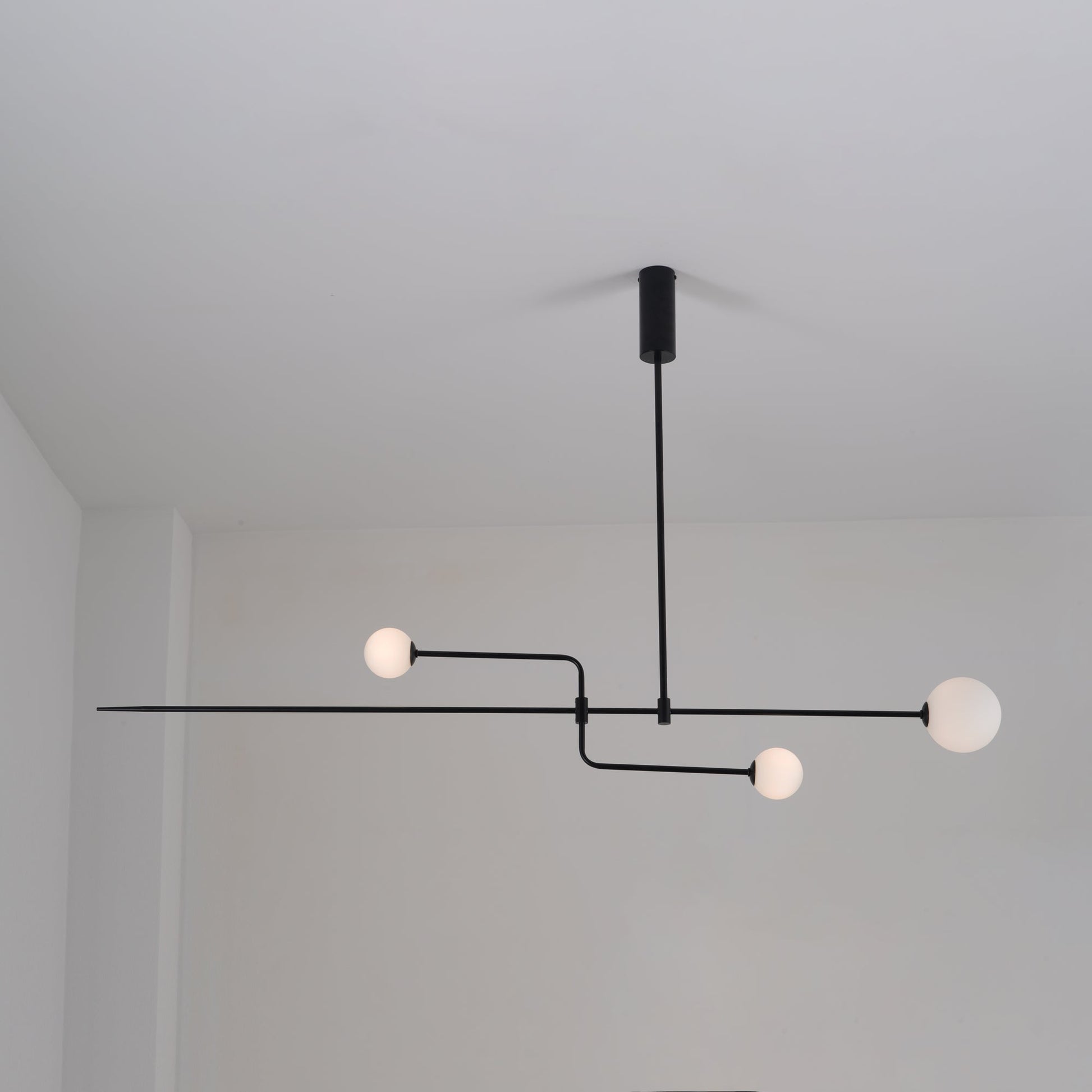 Mobile Chandelier is a minimalist design created by London-based designer Michael Anastassiades. This lighting reveals a minimalist design with very graphic and uncluttered forms. These lines in the air have several sources of warm light, with diffusers in opaline blown glass.