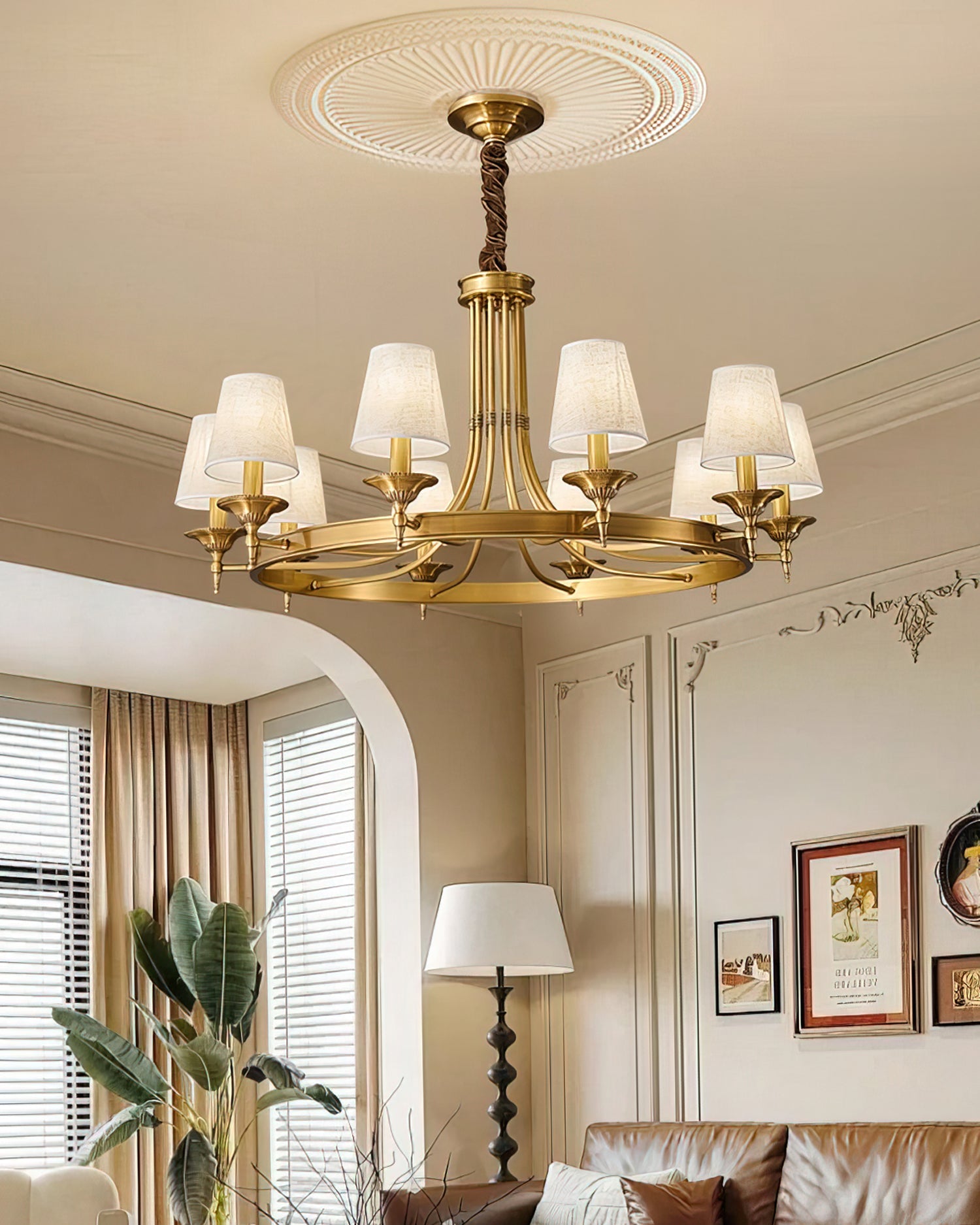 The Myrna Fabric Chandelier combines traditional elegance with rustic charm, featuring a fabric shade and antique brass body. Its timeless design is highlighted by an elegant brass center column, creating a sophisticated focal point that is ideal for a dining room or living room. Inspired by natural forms, this chandelier adds sophisticated charm and versatile style to classic and contemporary interiors.