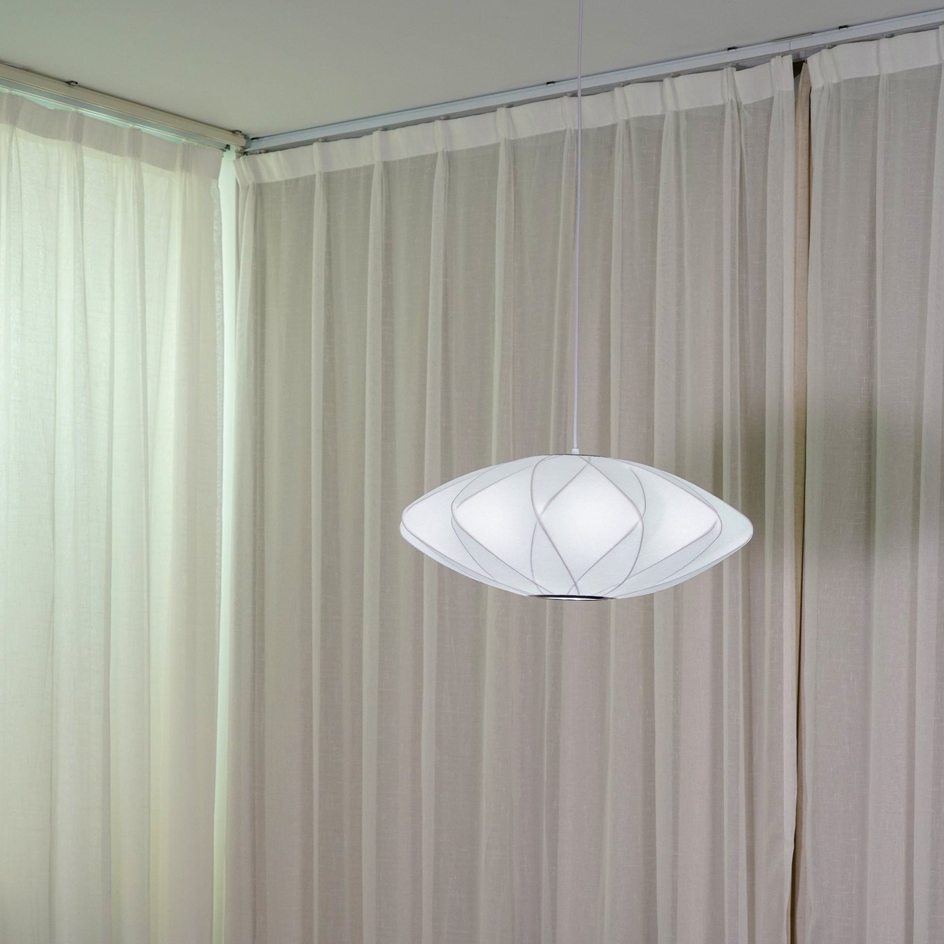The Nelson Ball Crisscross Bubble Pendant, rooted in George Nelson’s 1952 design, demonstrates innovative use of post-war U.S. military techniques and materials. Its lightweight steel wireframe maintains structural integrity while featuring an intricate crisscross pattern of interconnected wires. Enveloped in a translucent white plastic spray, the pendant delivers a soft, organic light quality. Designed to complement clustered arrangements, it offers a sophisticated ambient glow that enhances contemporary interiors with historical craftsmanship and subtle complexity.
