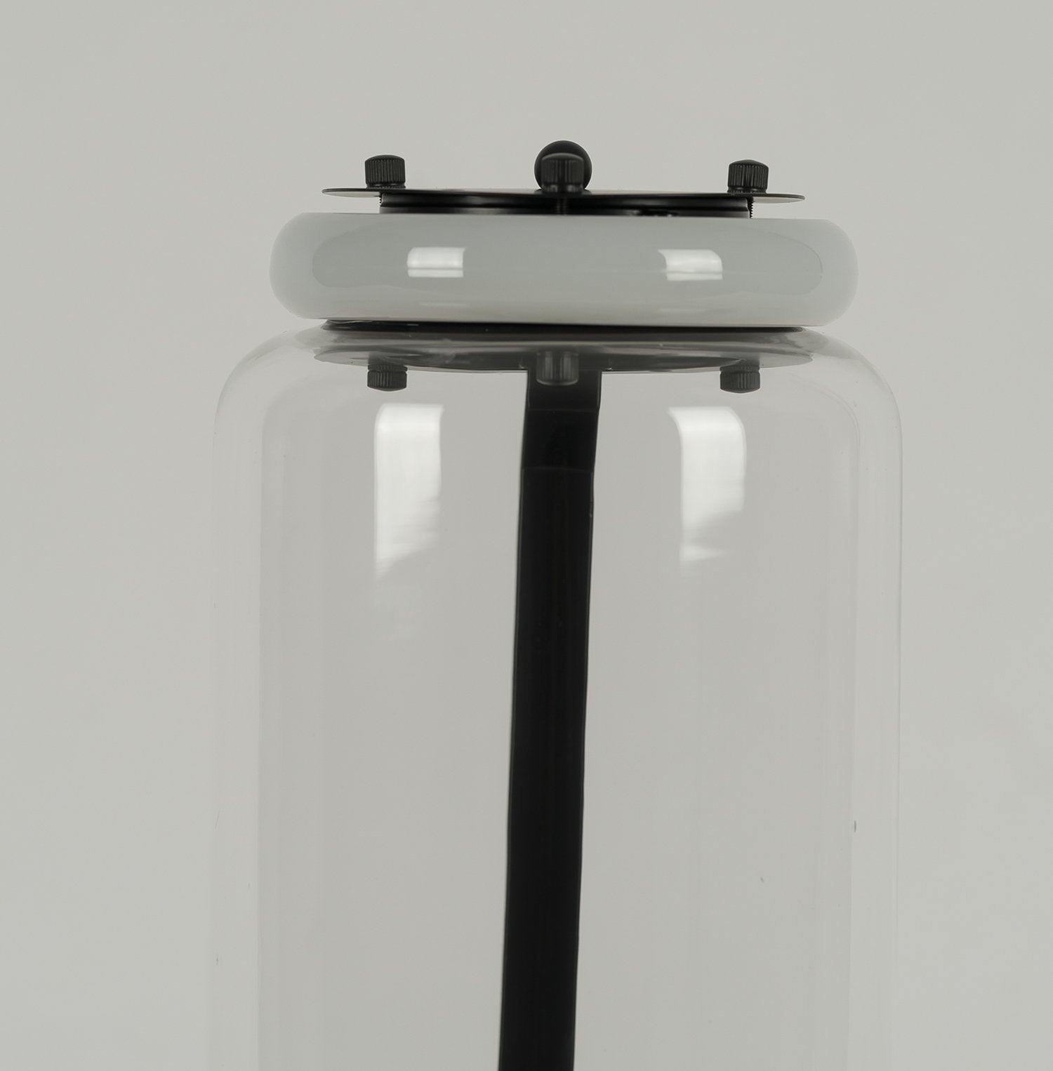 This Noctambule futuristic lighting system that blends innovation, efficiency, and aesthetics. Its transparent hand-blown glass cylinder is surrounded by discrete LED technology on top and at the bottom, thus making the foundation of the lamp stylish and stunning. The user can attach additional components to the fixture in order to experiment with different styles of lighting. This helps create columns of light at varying heights that light up at the intersecting points between each module or unit.