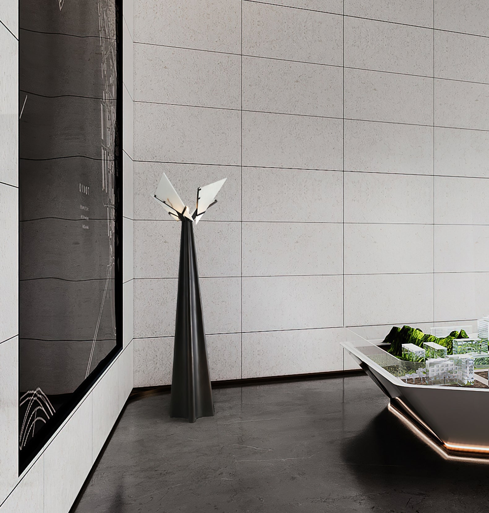 A tribute to the work of Pierre Chareau. Crafted from the highest quality European solid alabaster, mounted on a black oxidised steel bracket and with a black resin base. This ultra-refined design adds a sculptural element and a focal point of unrivalled beauty.