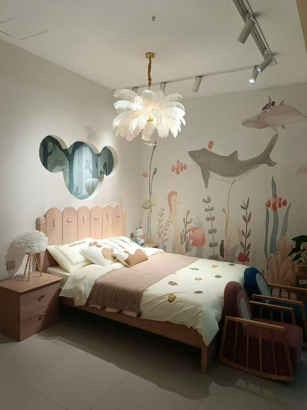 I can tell my daughter loves it! It pairs perfectly with the bedside table and floor lamps, which are also decorated with pink feathers.